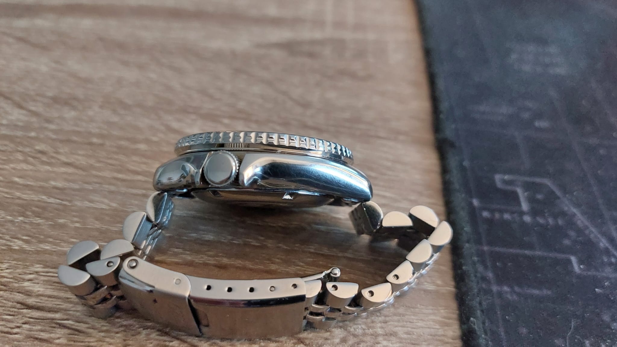 Verder is te zien dat het horloge inderdaad goed gebruikt is met als grote beschadigingen een buts op de bezel en een kras op de linker onder lug.
