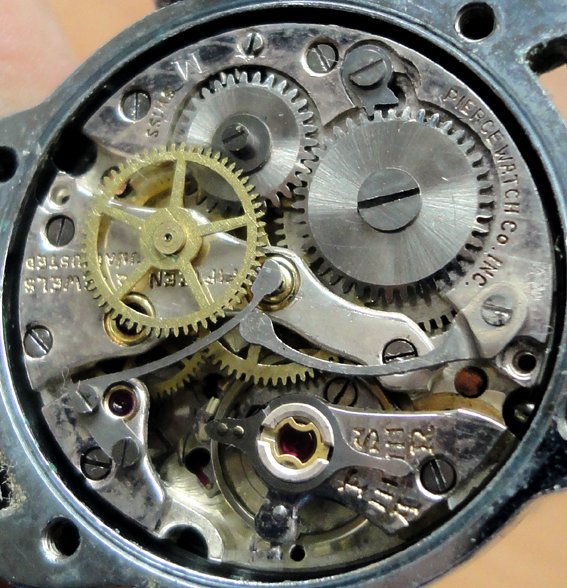 Een op zich niet zo spannend horlogetje, slechts 22 mm breed (zonder kroon) en niets wat ik ooit zou kunnen dragen. Maarja, Pierce he, dus spannend. De achterdeksel is ala Pierce geschroefd met 4 schroeven en tussen de bodemplaat en kast een pakking zoals bij de cilinders van een auto.