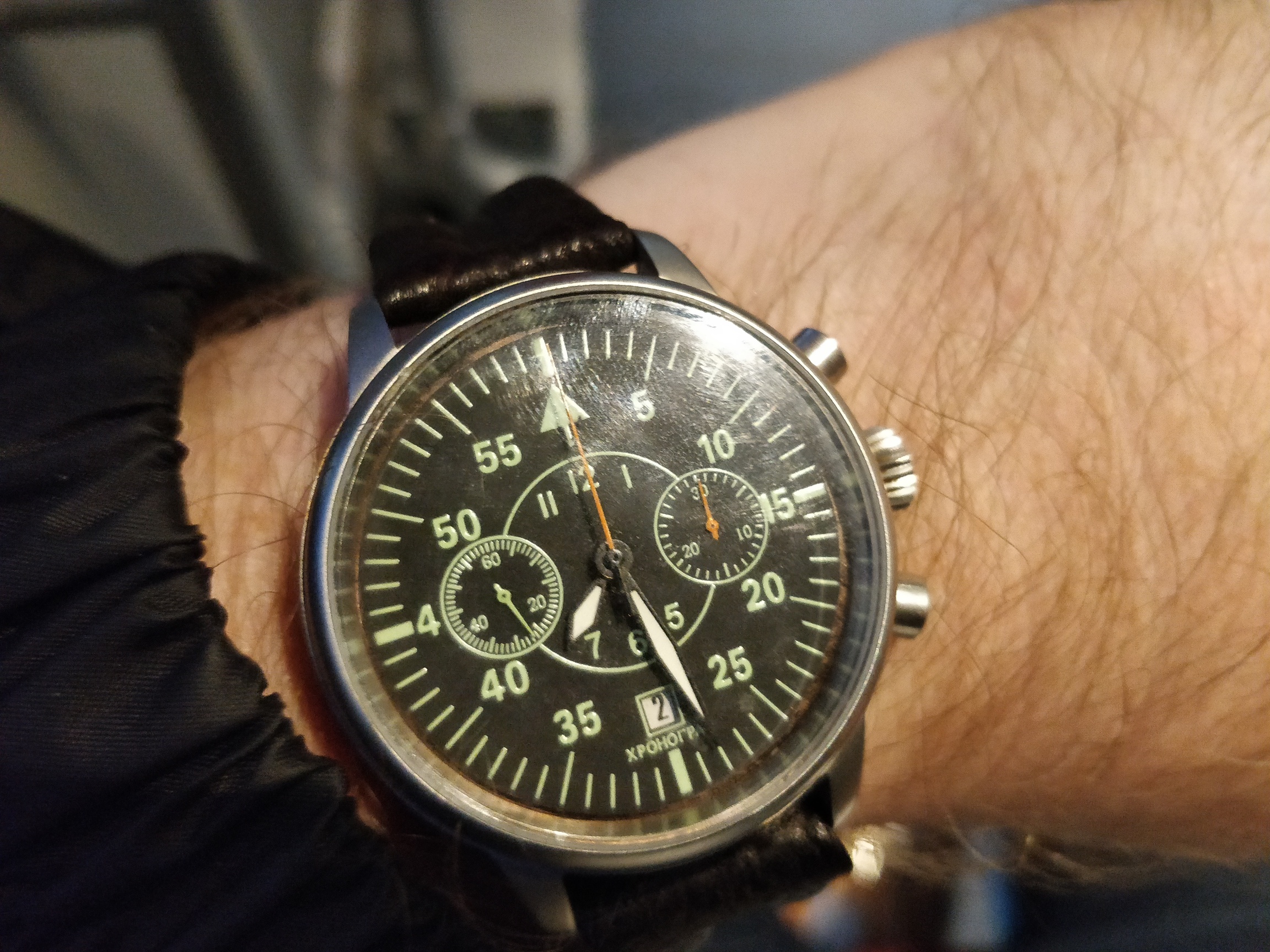 . Maar het is apart, het groene heeft echt iets harmonieus met de bruine band, ze hebben dat toch goed ingeschat bij Laco. Het past vaak ook goed bij de rest van m’n kleding. Als ik nu naar de Dekla met BWG9 kijk (ook overwogen), dan oogt het contrast dat je met witte cijfers krijgt weer te groot met de zwarte achtergrond. Het doet dan wat steriel aan.