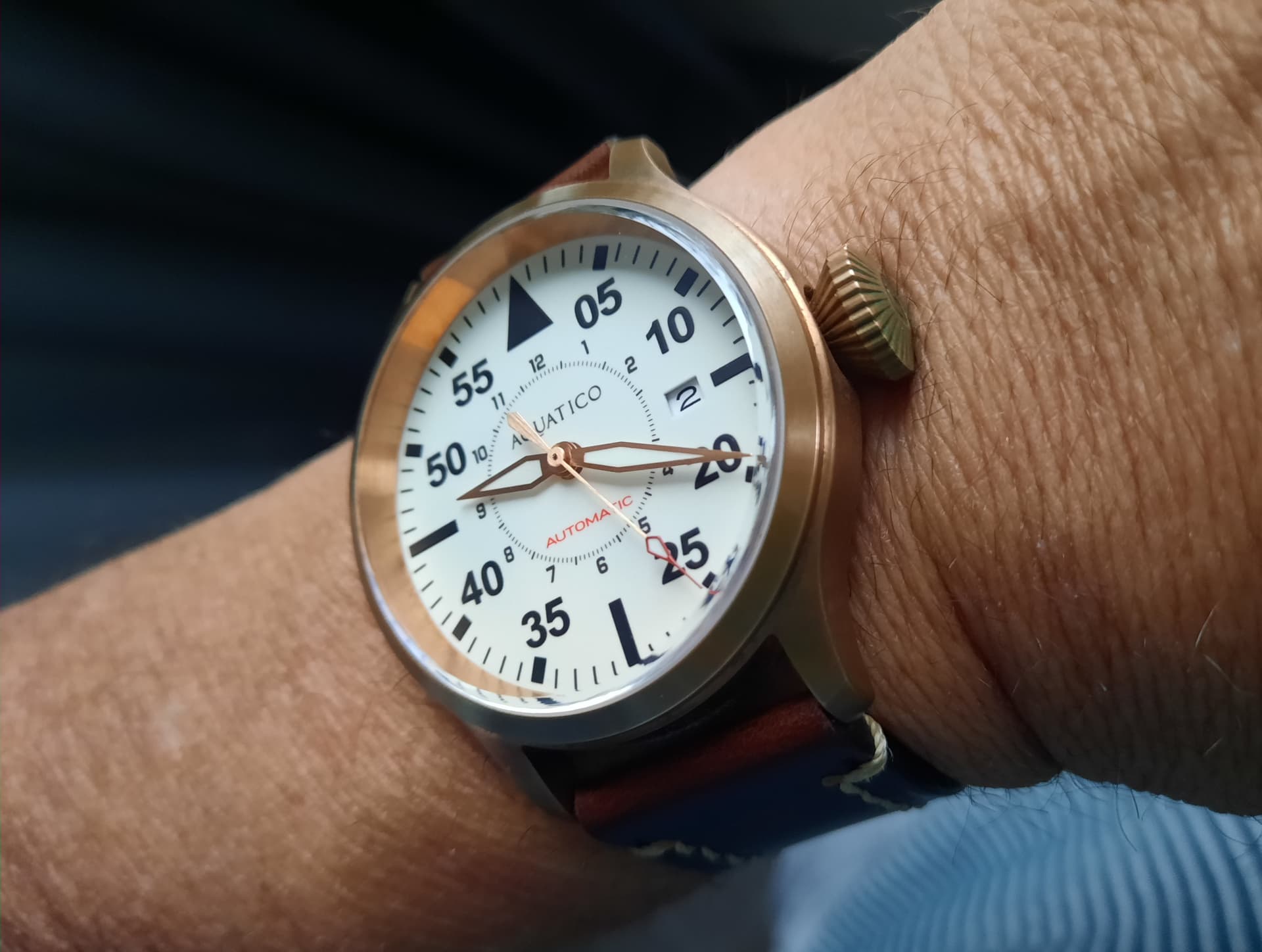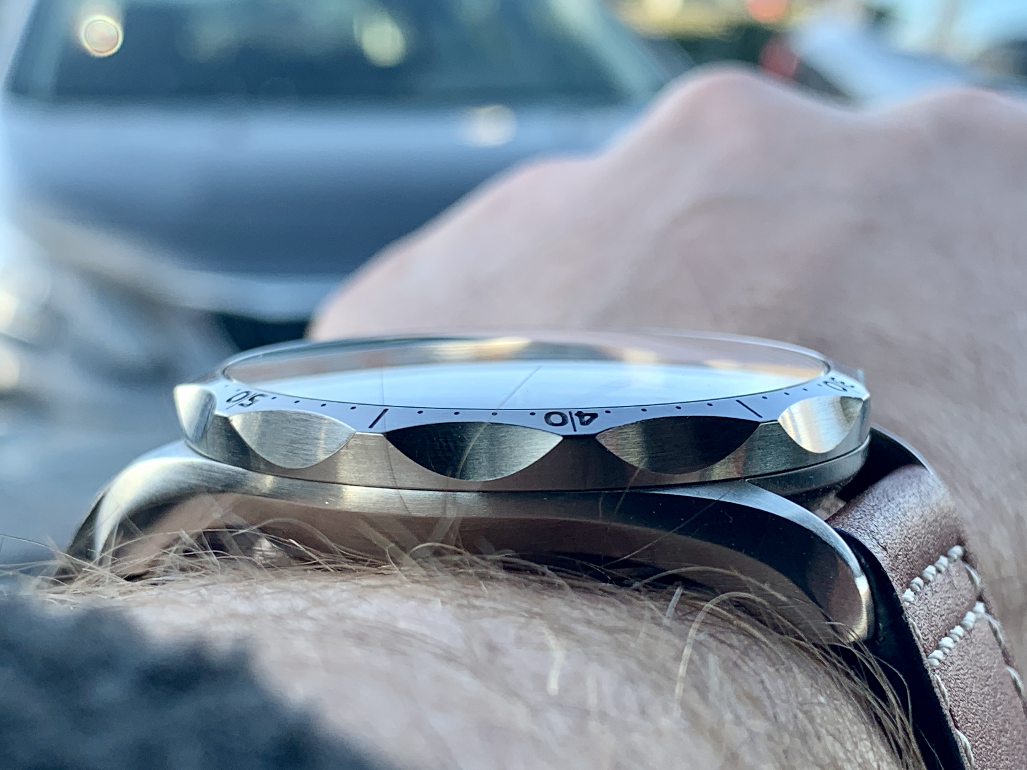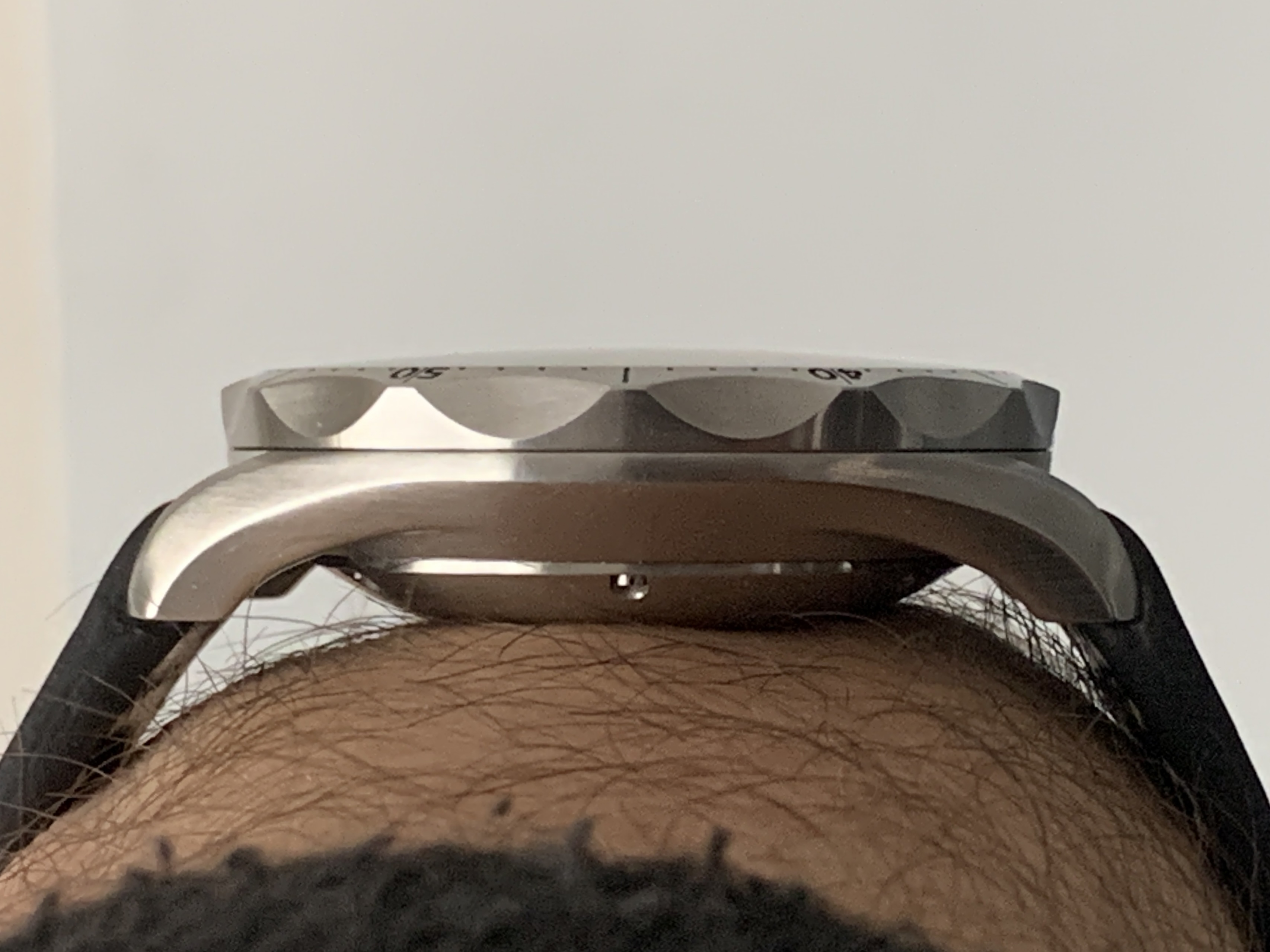 Door de bolle bodem zakt ie mooi weg in de pols en de lugs draaien omlaag, wat de toch aanzienlijke dikte een heel eind compenseert.