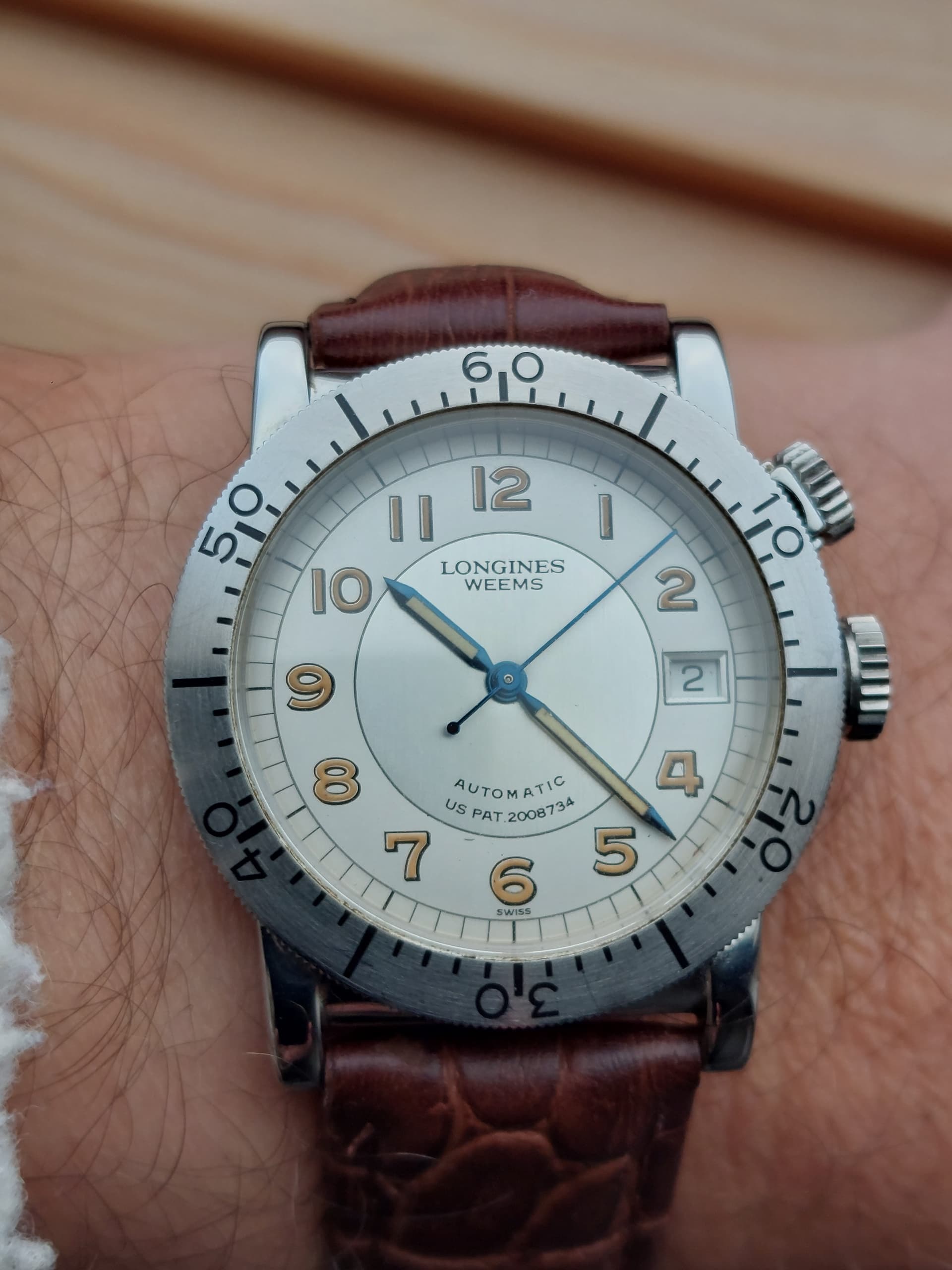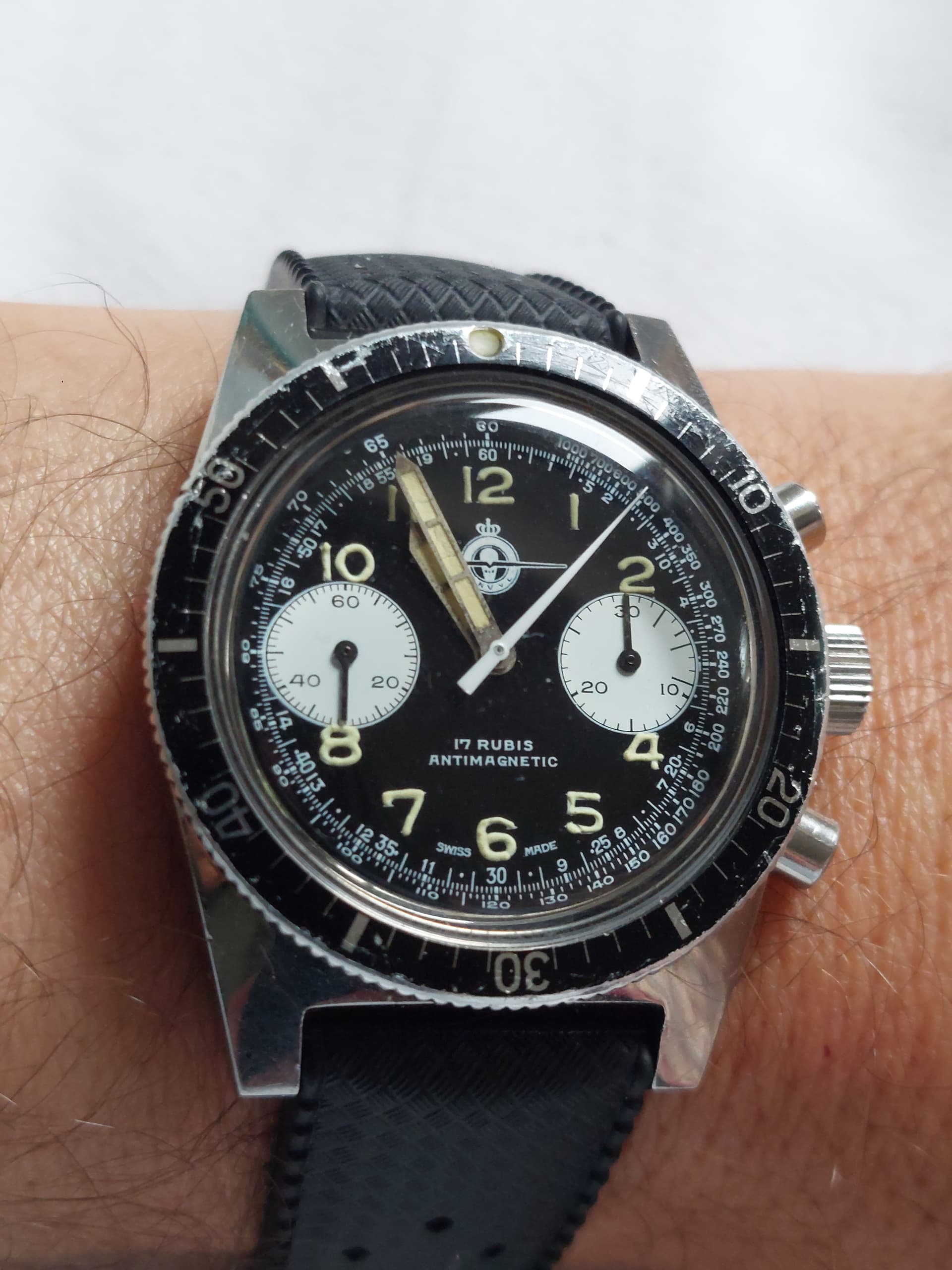 Het horloge is in de jaren '70 gemaakt door Guinand, dat toen nog in Zwitserland zat. Later is het overgenomen door Helmut Sinn nadat die Sinn verkocht had, en verhuisd naar Duitsland. Guinand heeft veel horloges voor Sinn geproduceerd en dat deden zij voor veel opdrachtgevers, die dan hun eigen naam op de wijzerplaat konden laten drukken. Dit horloge is gemaakt door de Nederlandse luchtsportorganisatie KNVvL waar ik in 1975 lid van werd. Hij meet ongeveer 38mm en is door @Floris155 gereviseerd nadat ik hem een jaar of 2 geleden van @der_bene kocht. @Niels1983 heeft er ook een.