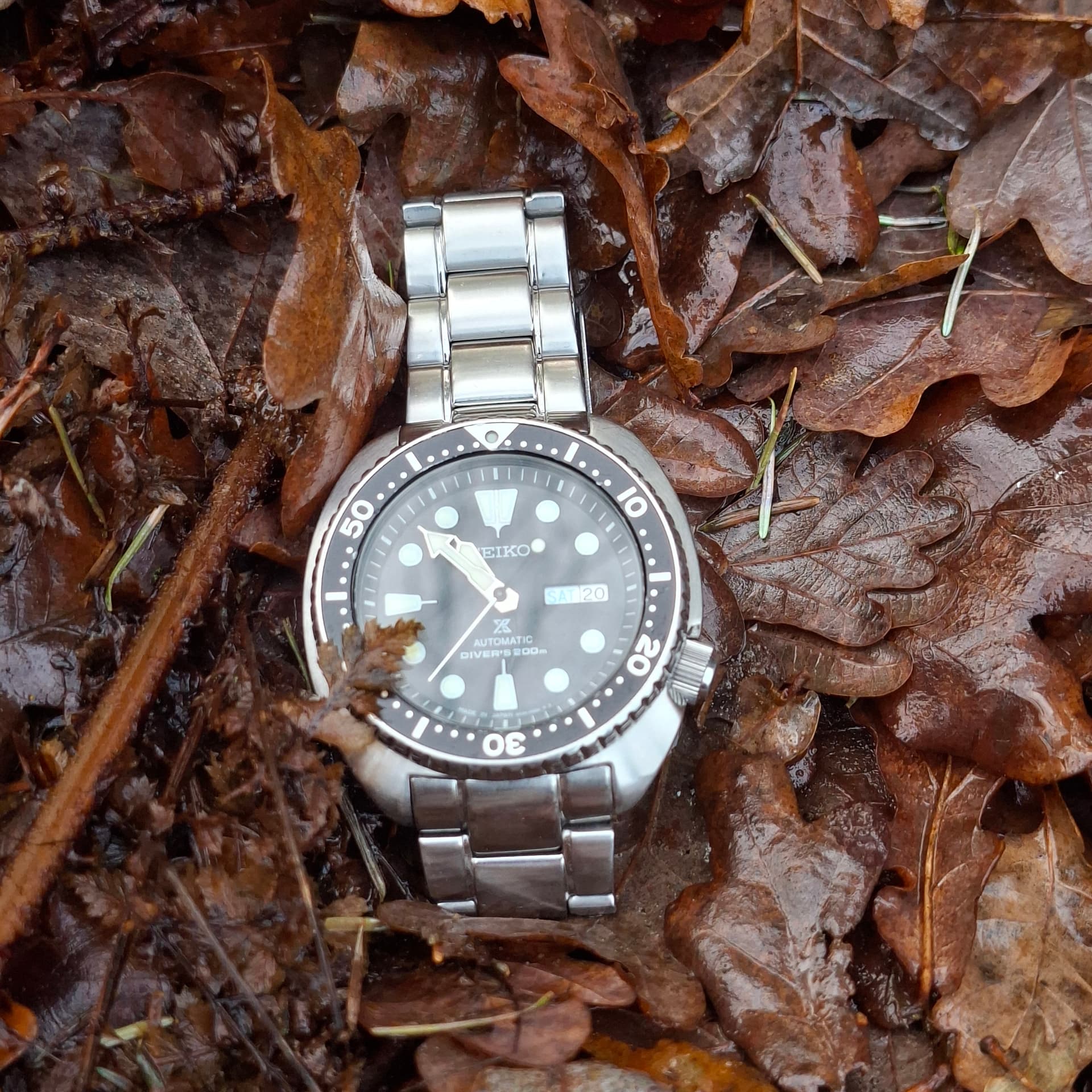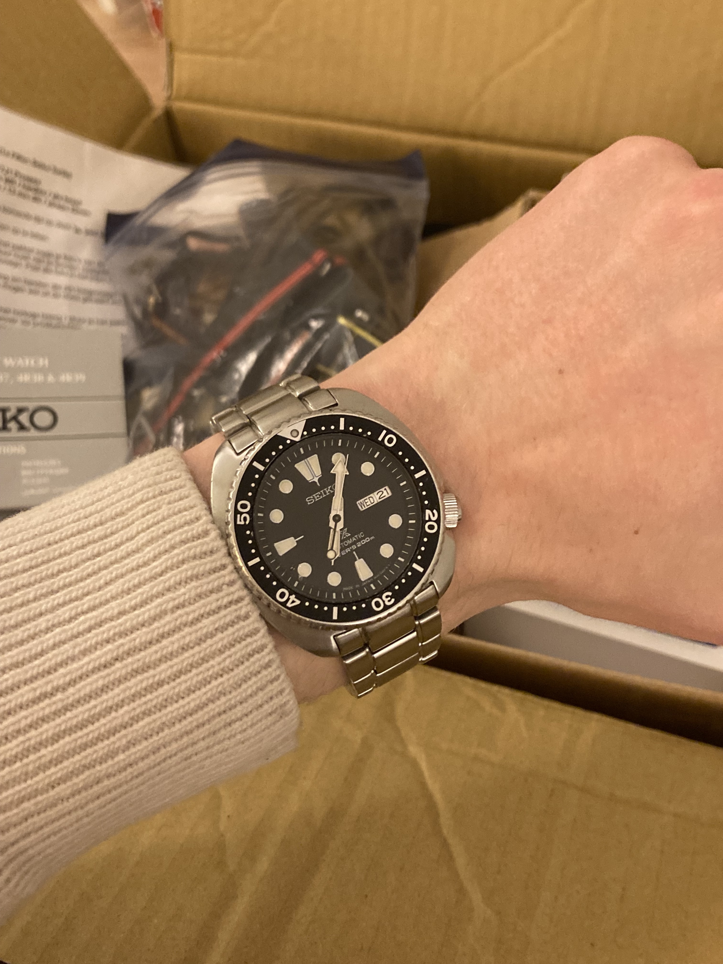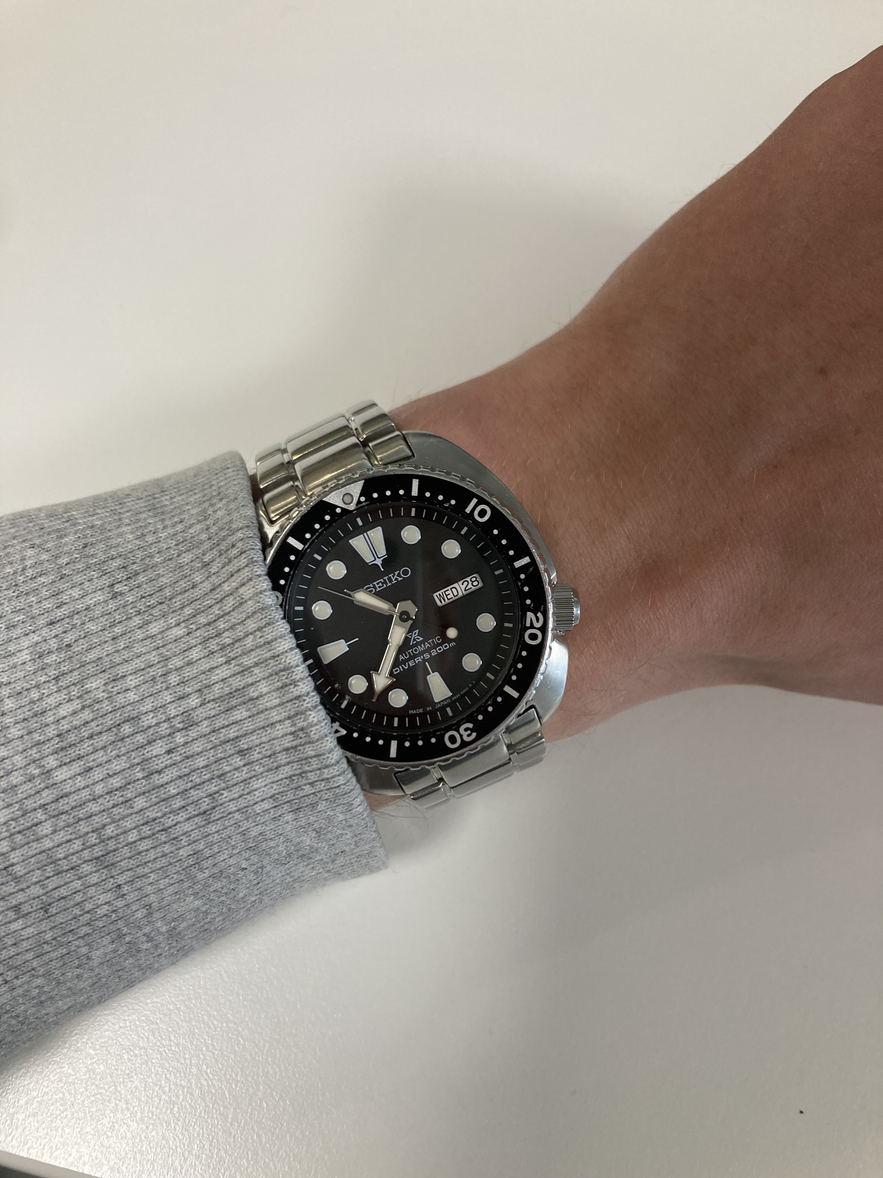 Vandaag de turtle maar weer eens om gedaan. Het verbaasd mij hoe normaal die nu aanvoelt. Ik denk ook dat de duikring, die iets kleiner is dan de kast zelf, helpt met hoe groot hij oogt om de pols. Ziet er meer uit als een 42mm dan een 44mm horloge.