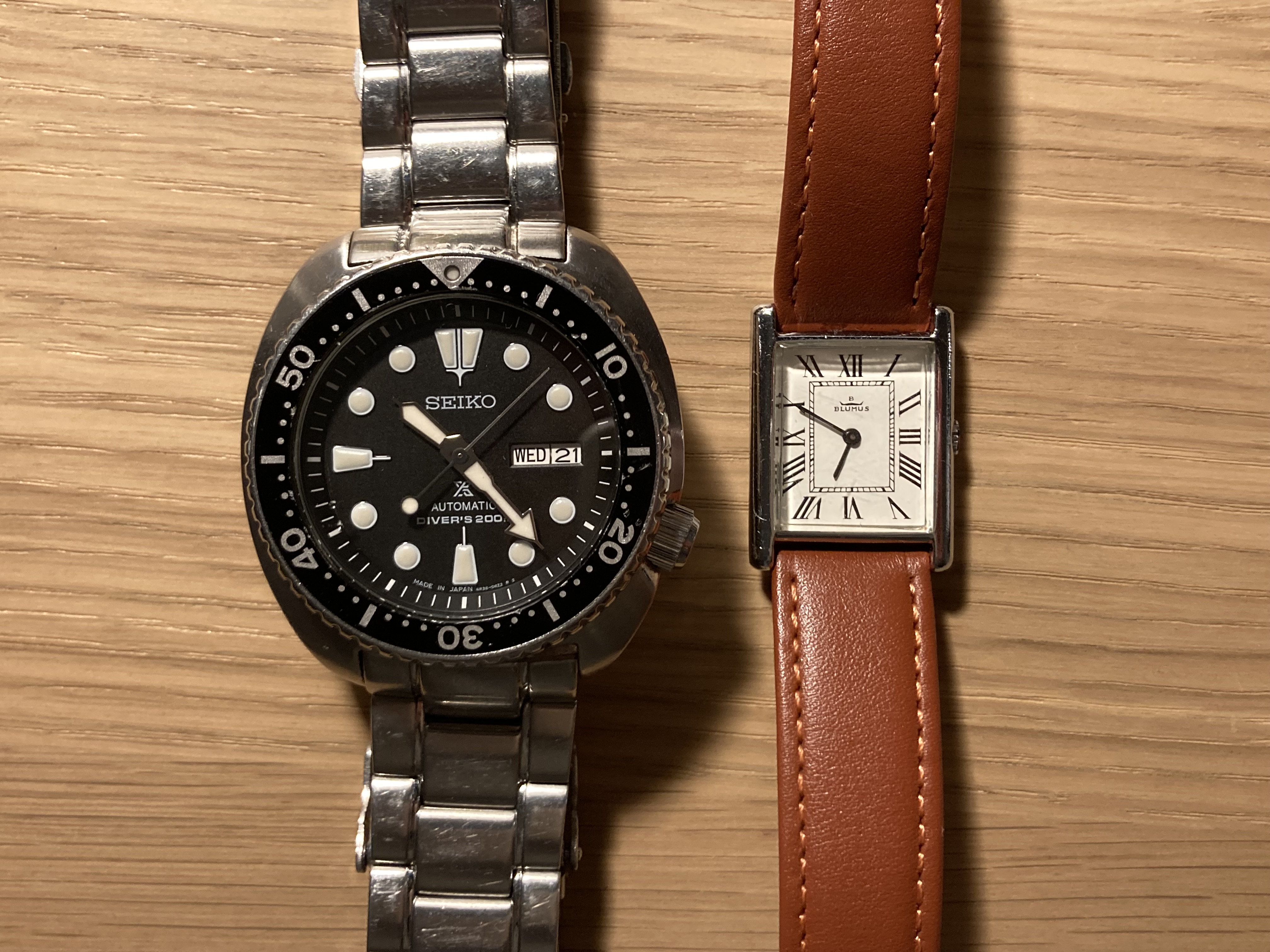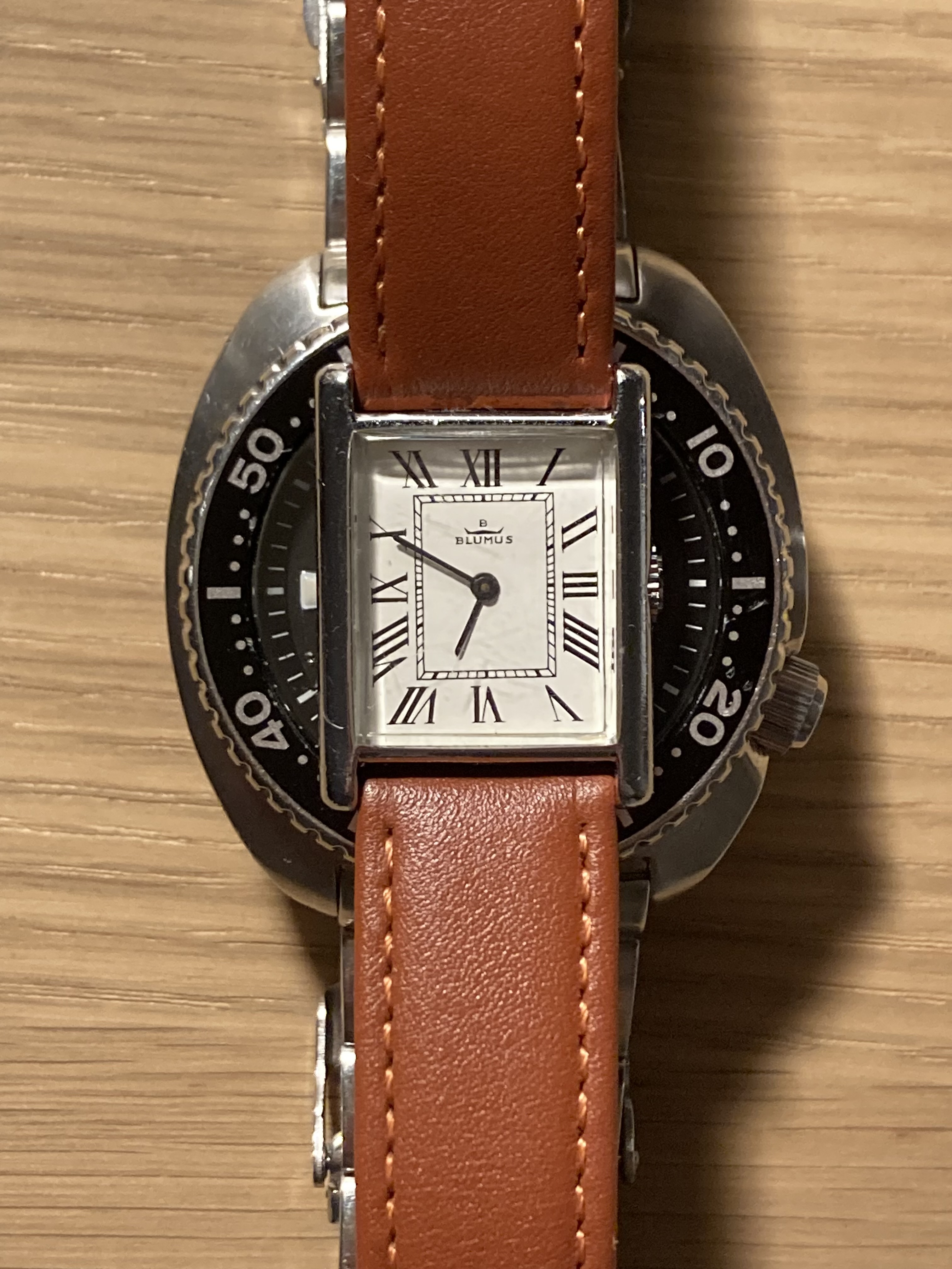 Even een komische vergelijking, dit is de Turtle naast mijn kleinste horloge (20mm breed!)