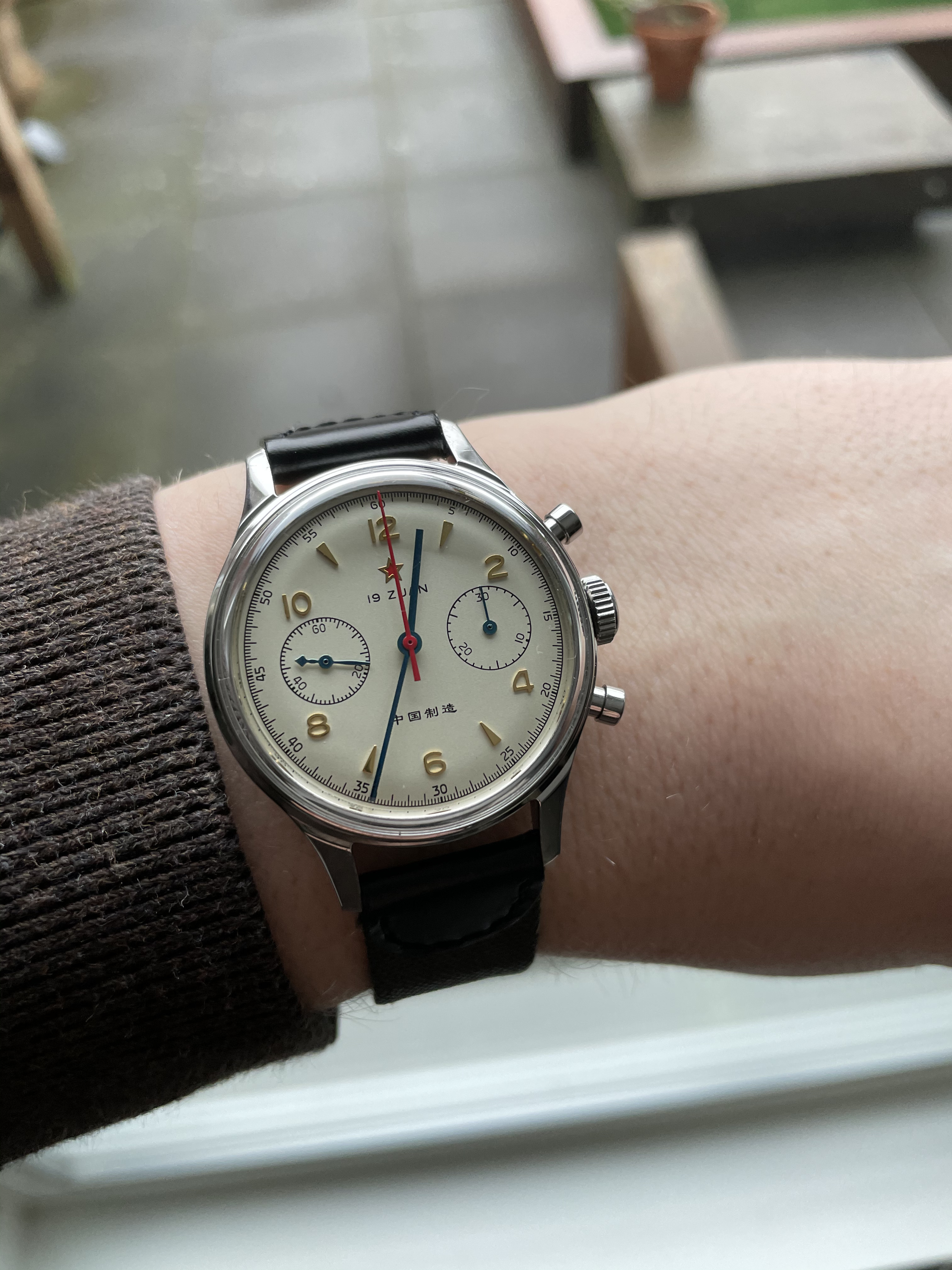 Mijn IWC die ik droeg deze dag (die nogal lomp lijkt naast de Seagull) heb ik afgedaan en ik heb ze samen op de foto gezet: