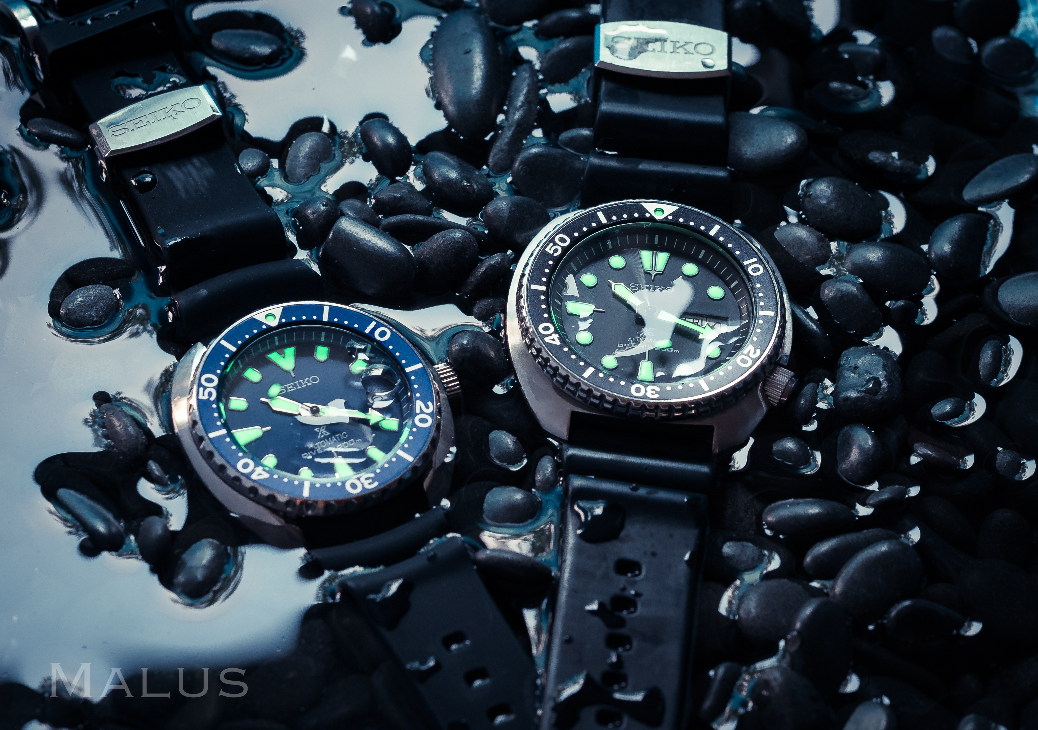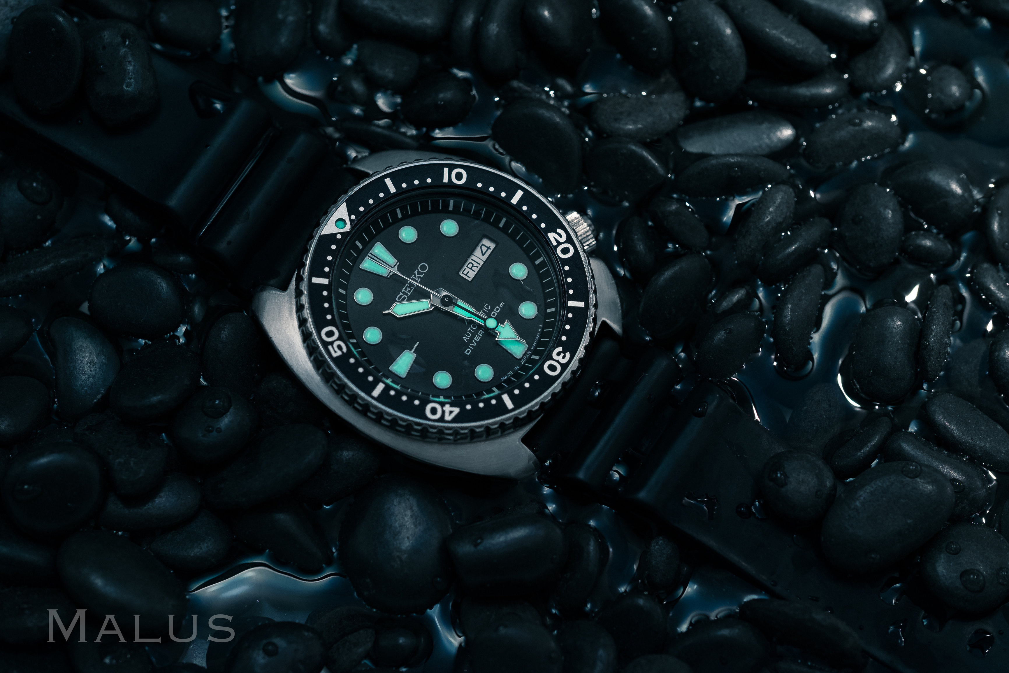 Dan maak ik een opstelling, dit kan met kunstlicht of soms daglicht zijn. Voor de Turtle had ik twee ideeën in gedachten. Ik had een opstelling in de douche waarbij ik de Turtle op een blauwe folie legde, de verlichting bestond uit twee lampen, allebei met blauwe folie ervoor om een blauwige zweem in het licht te krijgen. Daarna heb ik in een aparte kamer met daglicht een andere opstelling gemaakt waarbij ik in een karaf een laag water heb gegoten. Die voor het raam gezet. Daarvoor een transparant blauw deksel van een Curverbox ervoor heb gezet zodat ik weer een blauwe zweem kreeg. Horloge laten zakken, foto’s gemaakt, water erbij gegoten en weer gefotografeerd. Daarna met zaklamp lume opgelicht. Weer een serie gemaakt. Daarna met de zaklamp van onderen door het water geschenen. Weer een paar foto’s gemaakt. Beetje trail en error maar uiteindelijk hou ik dan een stuk of tien, vijftien bruikbare opnames over die ik ga post-processen in Light Room.