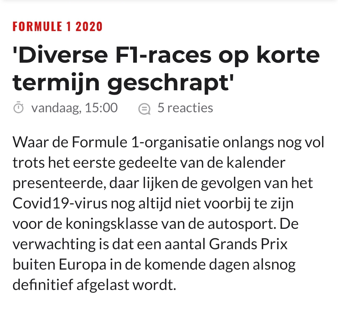 Corona zou best wel eens de nekslag kunnen worden voor de F1 zoals we die voor de crisis kenden.