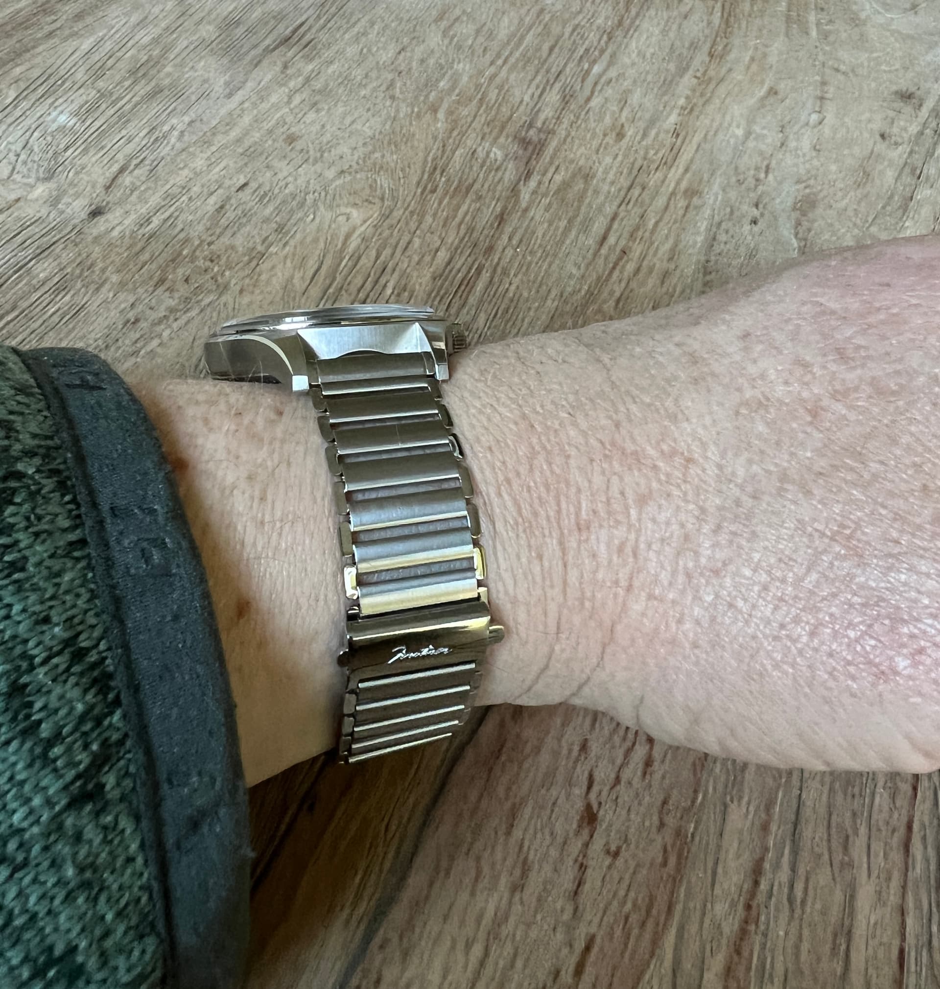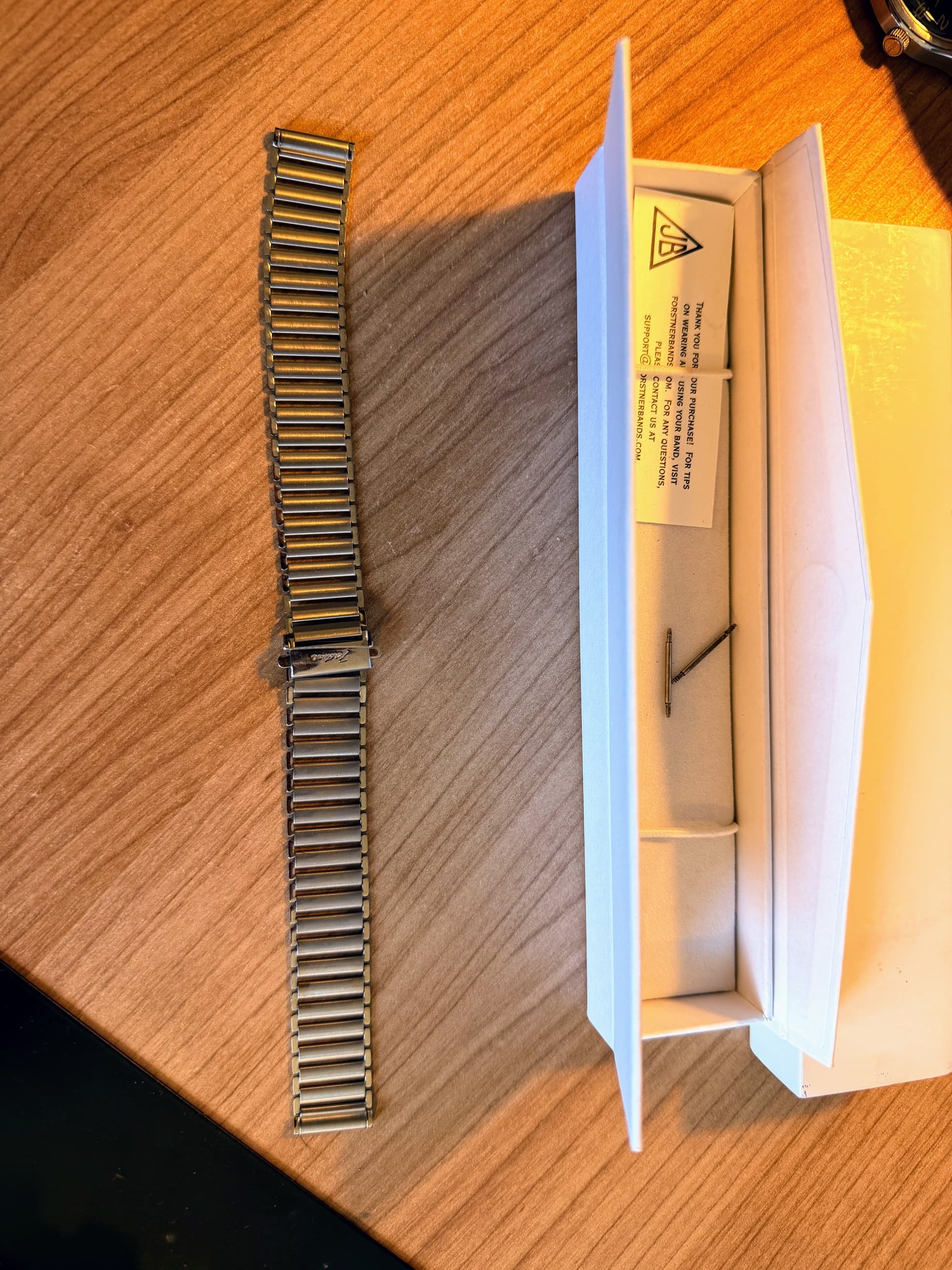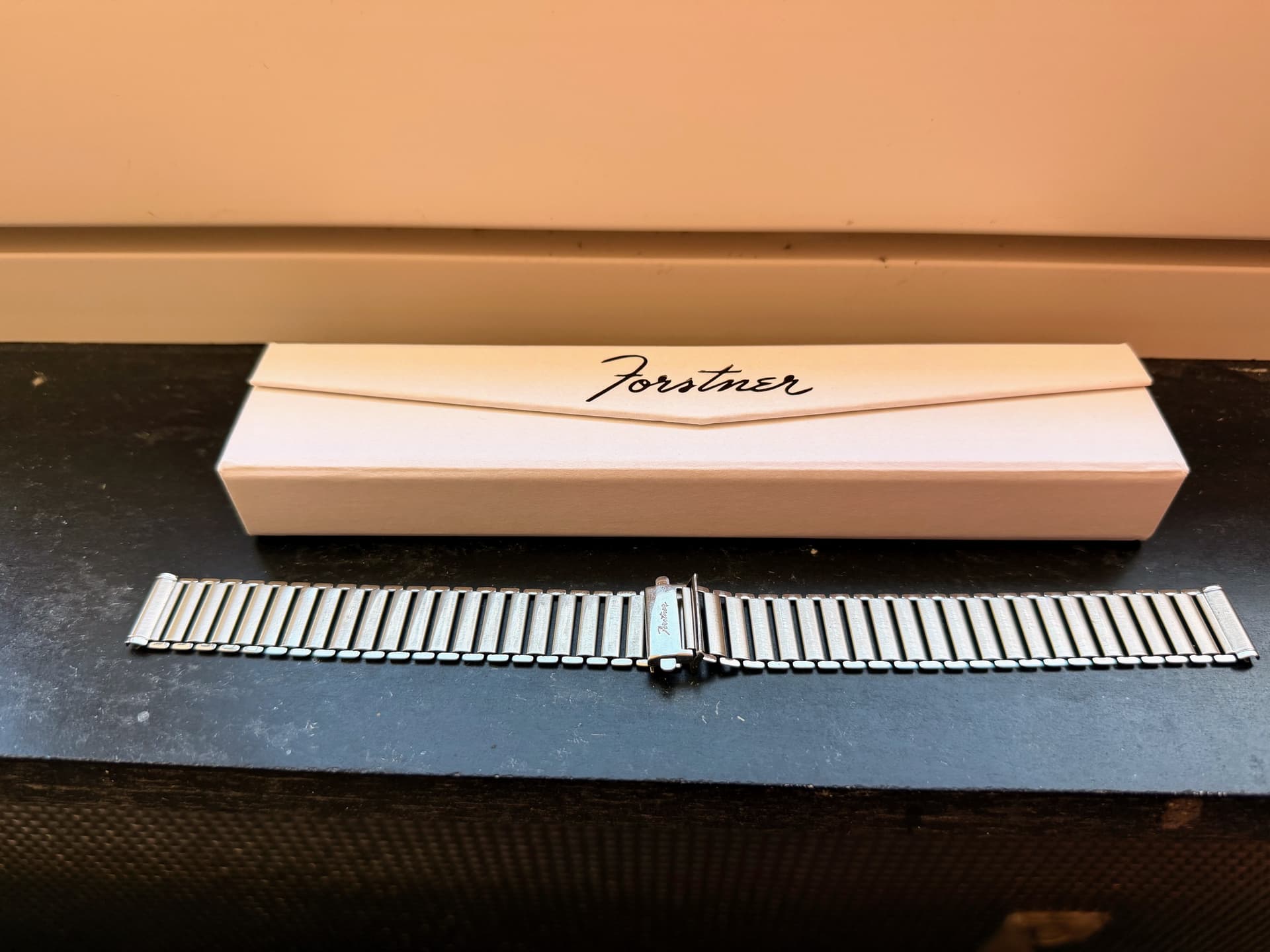 Te koop Forstner Klip; de Amerikaanse versie van de Bonklip, een stalen band die vroeger veel voor militaire field watches werd gebruikt. De band draagt comfortabel omdat je hem tijdens het dragen op elke gewenste “sport” van de ladder groter en kleiner kunt maken. Als je pols in de loop van de dag wat opzwelt kun je de band dus zonder hem van de pols te halen wat groter maken. Past erg goed bij vintage style field watches en vergelijkbare soorten horloges. De band is dun maar is des ondanks erg sterk.
