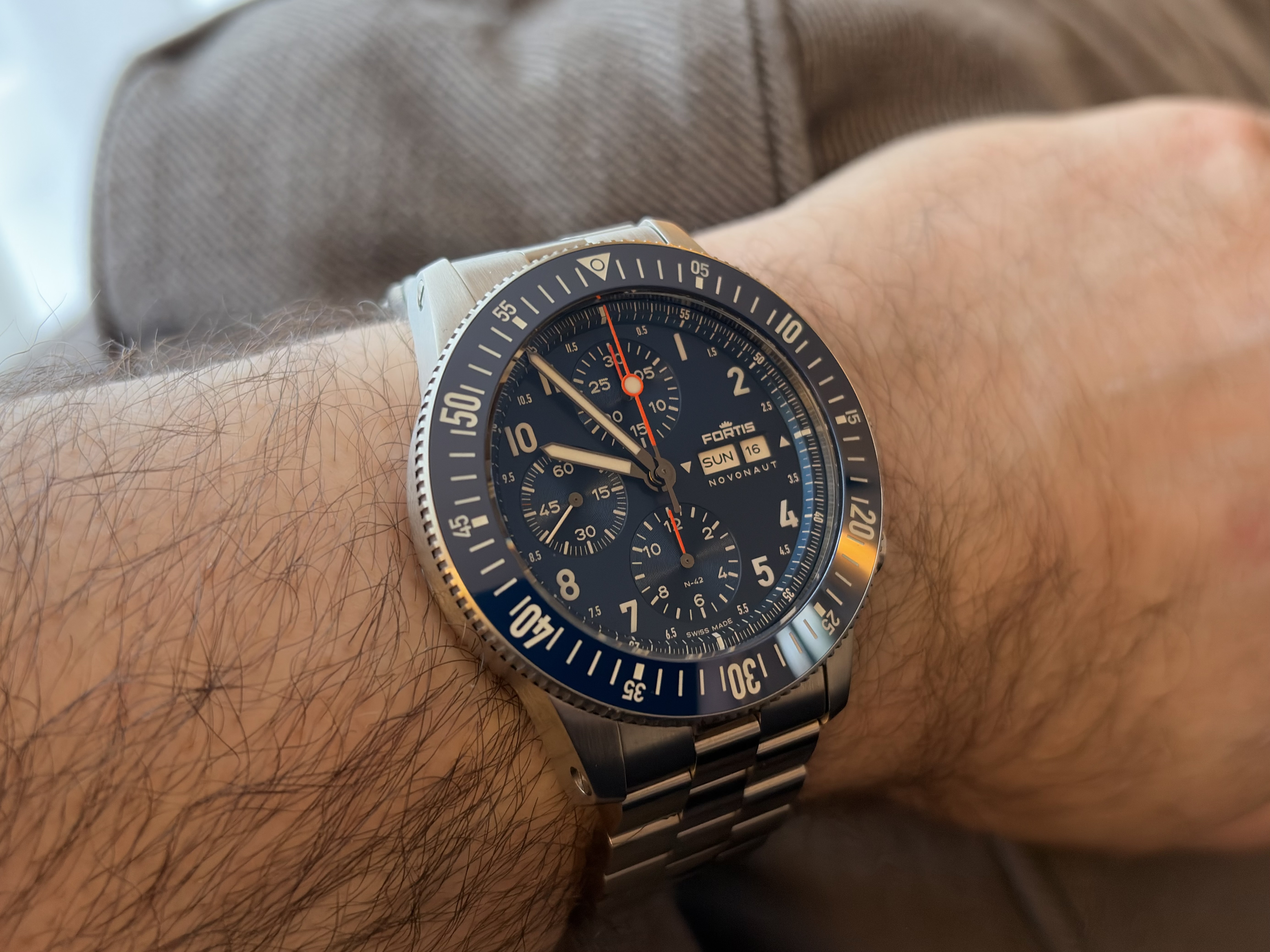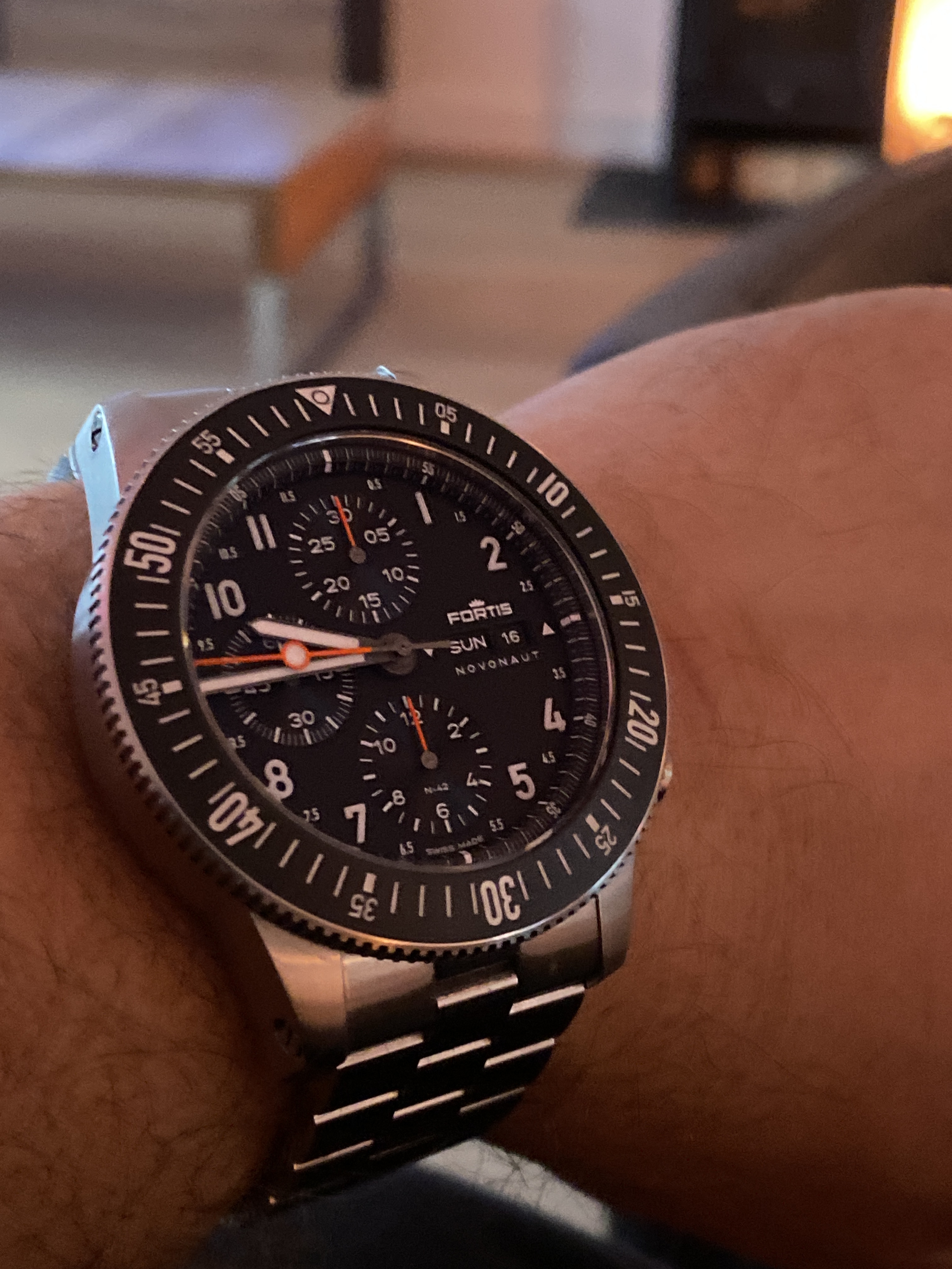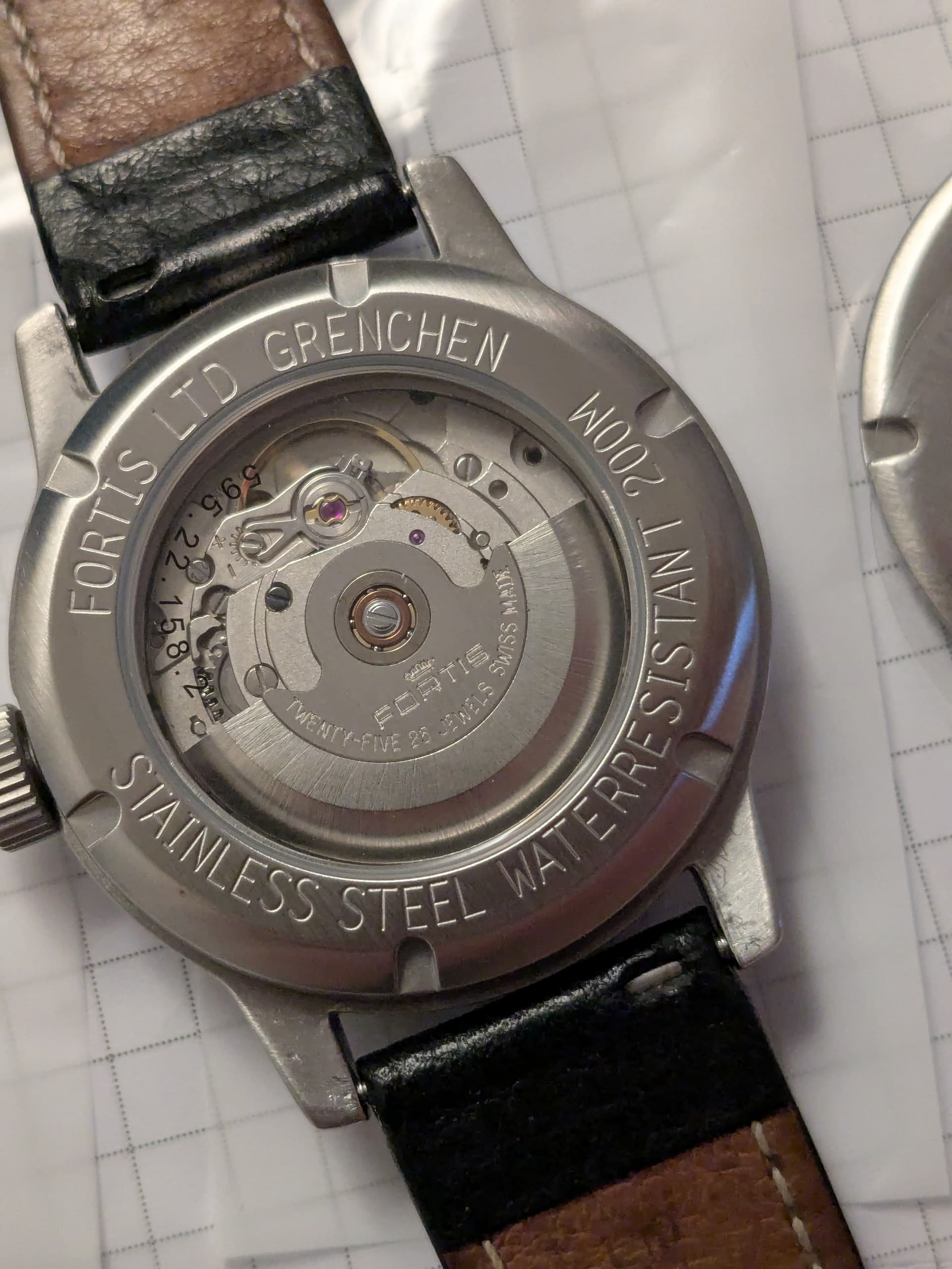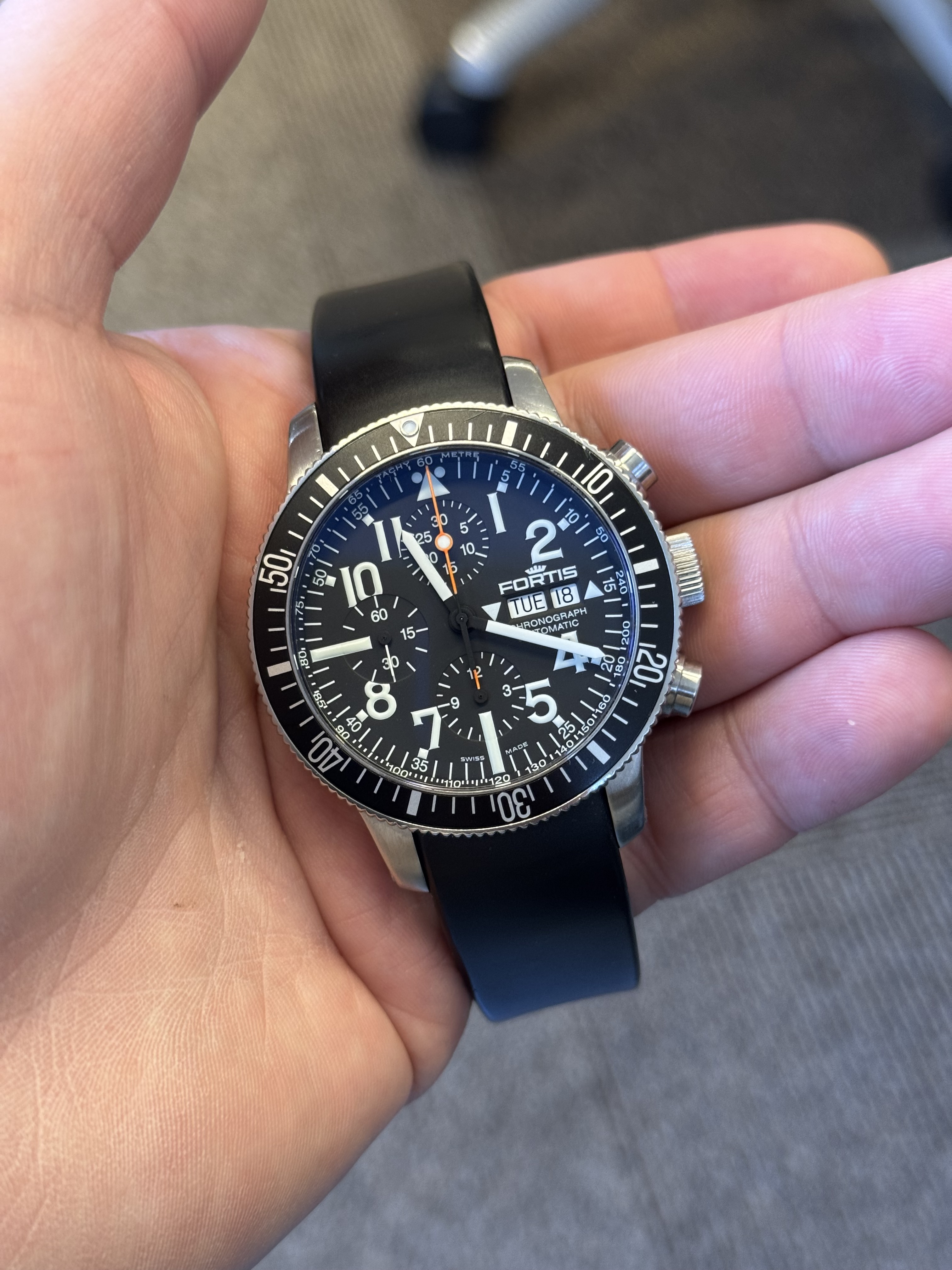 Fortis nummer 3 in the house, naast de B42 met lichte plaat en 34mm Flieger. Cosmonaut versie met speciale plaat die Fortis heeft aangeboden voor betere afleesbaarheid onder water. Kosmonauten trainden nl veel onder water. Later is dit de Marinemaster geworden. Maar deze heeft nog wel de Roscosmos caseback.