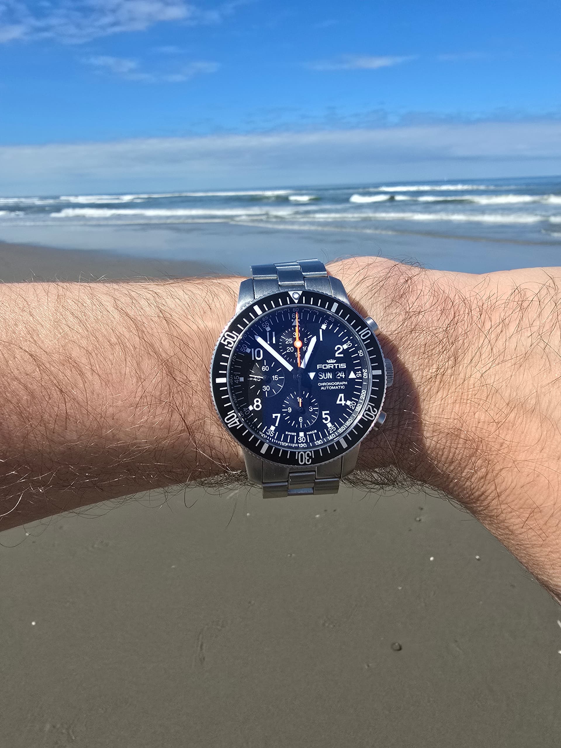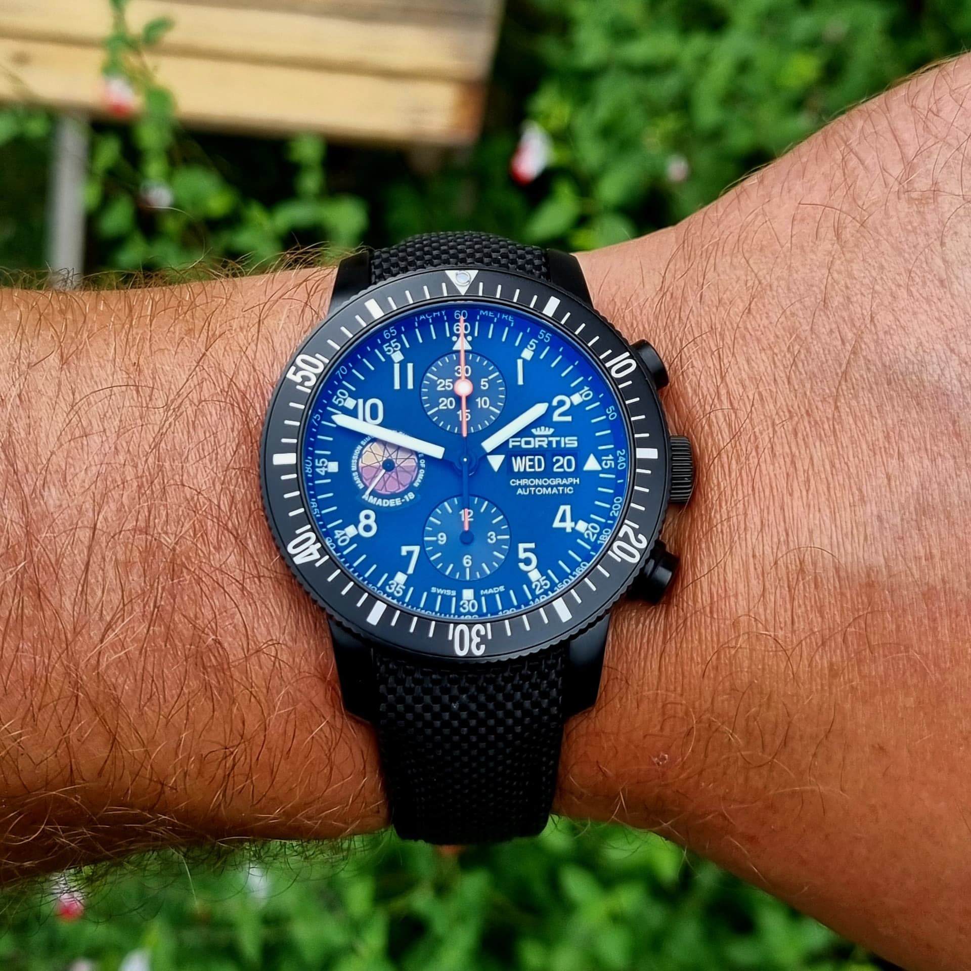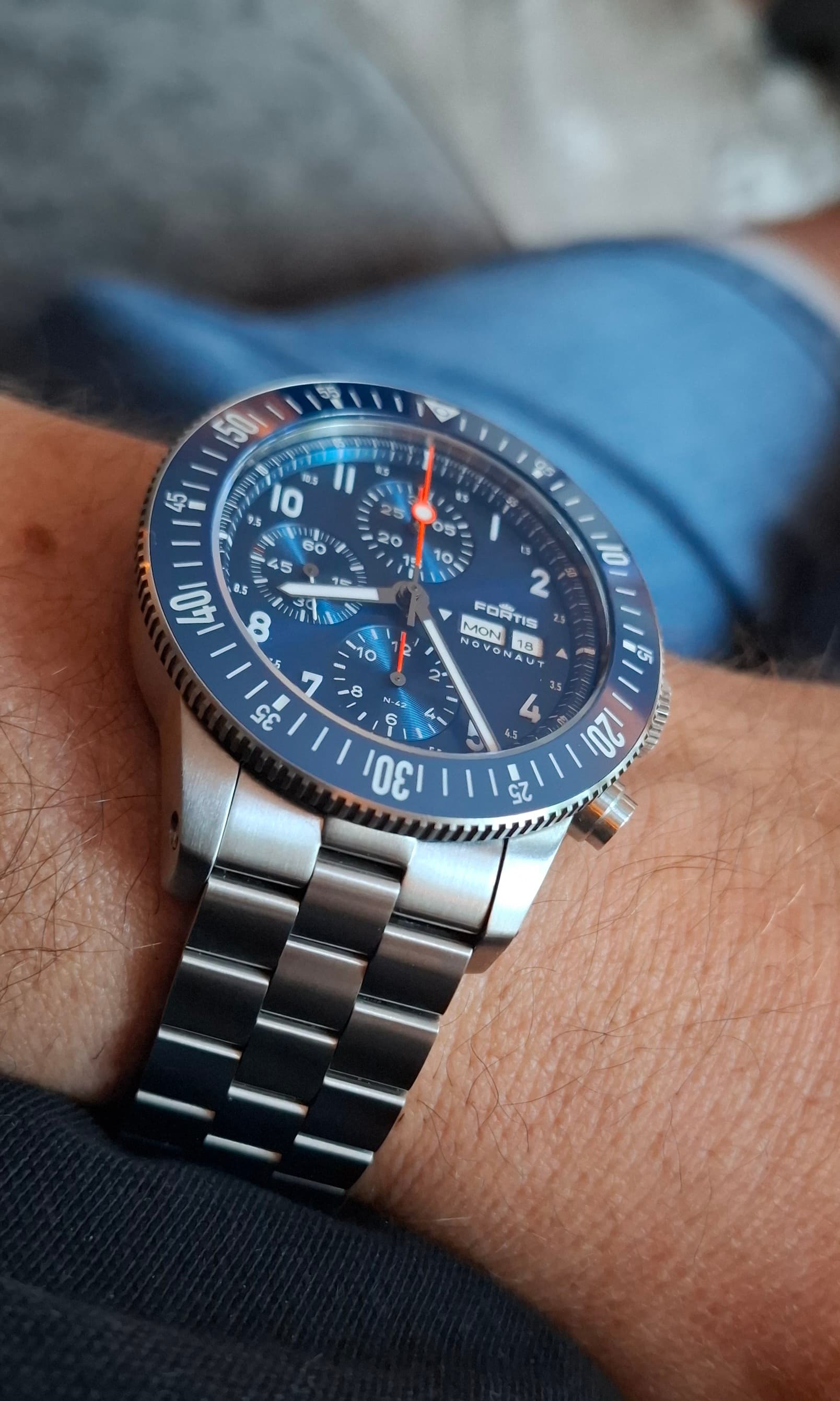 Die had hij. Geen cosmonauts, maar wel een oude tritium lume B42 chrono flieger. Dus die gepast. En toen gemerkt dat mijn vrees over het grote gewicht wat onterecht was omdat deze veel beter gebalanceerd is tussen horloge en band. Toen is de jacht dus eigenlijk langzaam aan begonnen.