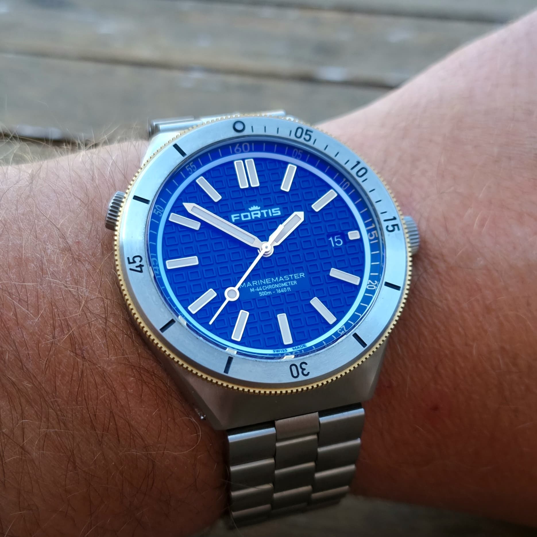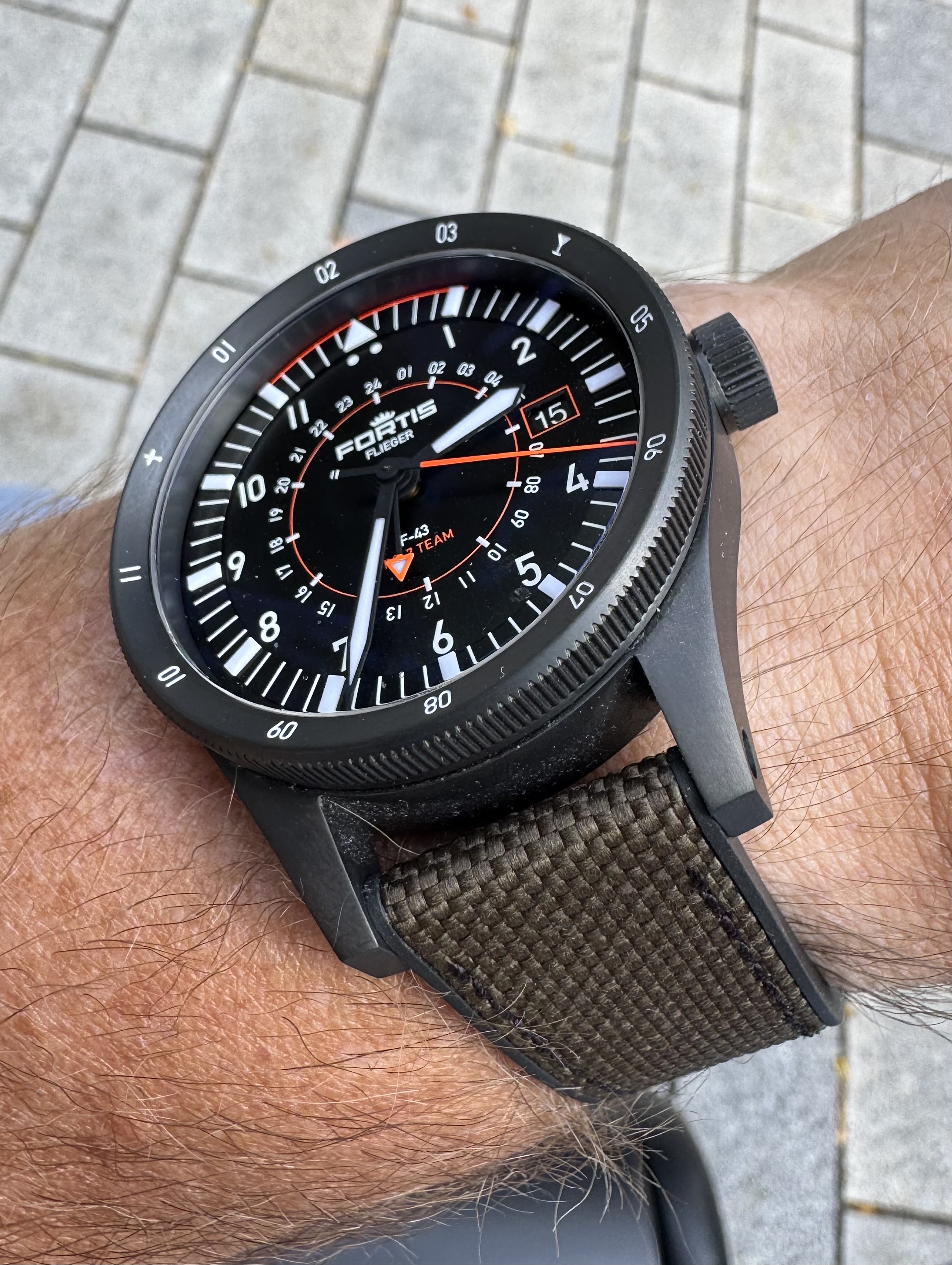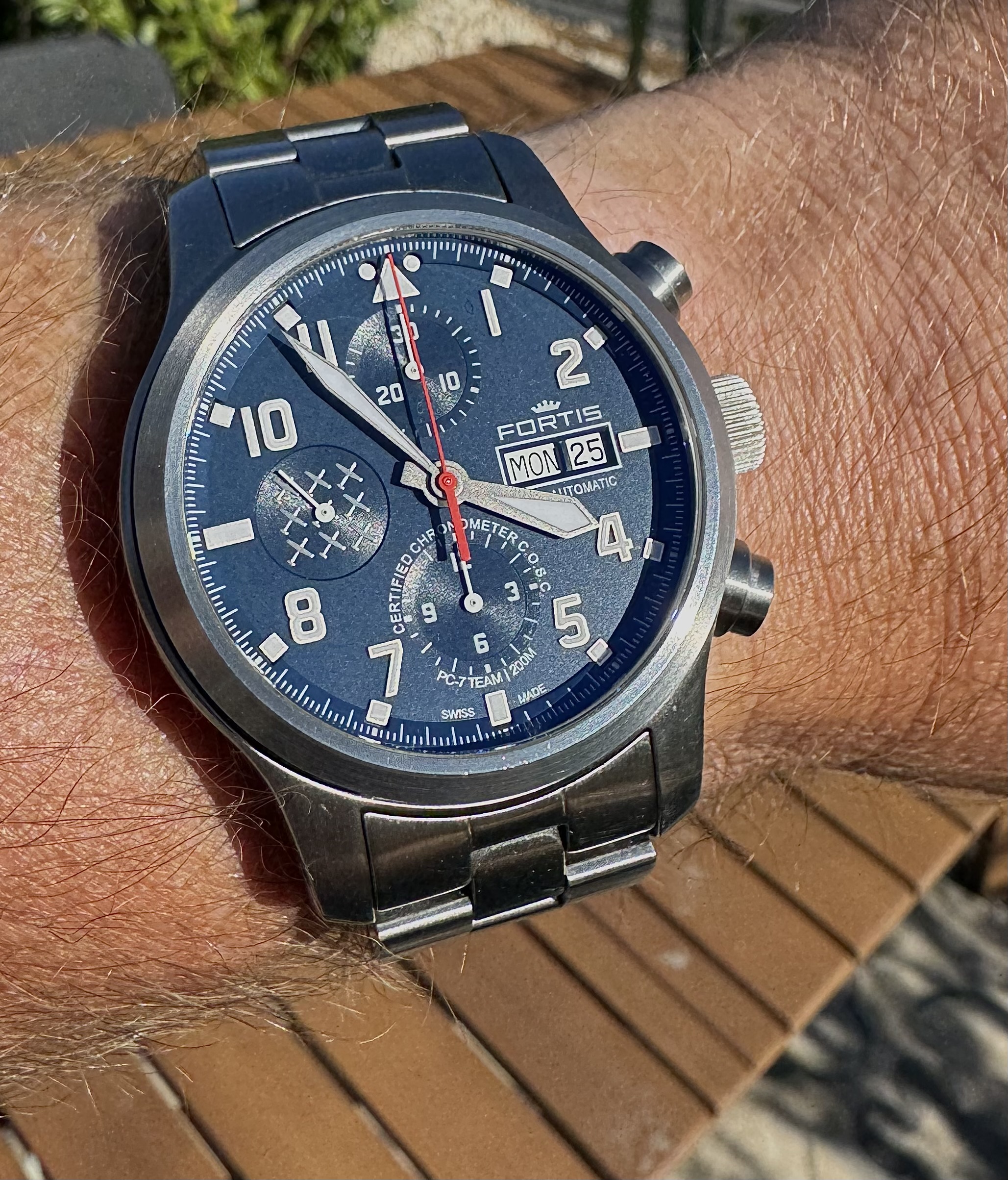Die had hij. Geen cosmonauts, maar wel een oude tritium lume B42 chrono flieger. Dus die gepast. En toen gemerkt dat mijn vrees over het grote gewicht wat onterecht was omdat deze veel beter gebalanceerd is tussen horloge en band. Toen is de jacht dus eigenlijk langzaam aan begonnen.