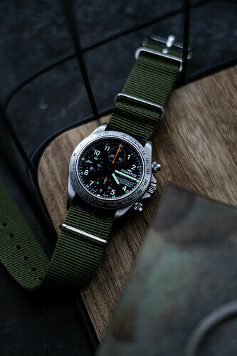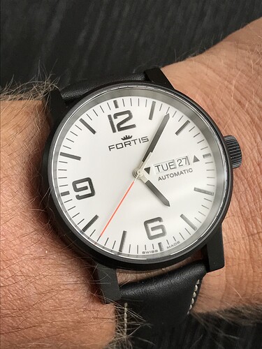 Helaas niet van mijzelf, maar van mijn broer. Een Flieger B-42 Chronograph. Wel een knoeper, maar toch een mooi ding. Vind hoe de band geïntegreerd is fraai en de positie van de dagaanduiding is ook geinig.