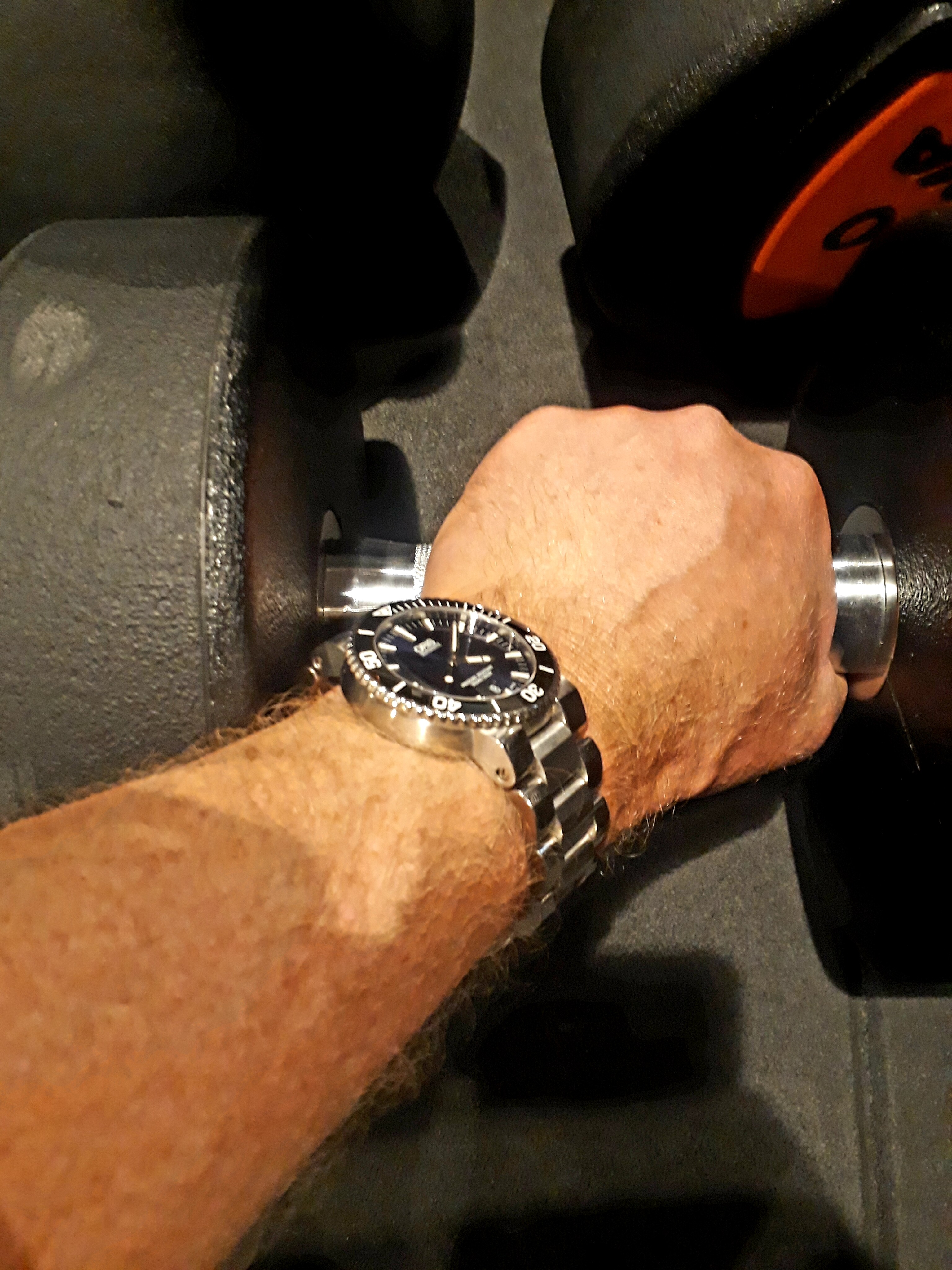 Zelf ben ik een fervent sporter, maar draag ik niet graag een sporthorloge. Als alternatief loop ik gewoon met Strava op mijn mobiel, en fiets ik met een Garmin fiets-GPS. Dan is er dus plaats voor een leuk horloge dat tegen een stootje (en best wat water/ zweet ) kan! Dit is bij mij lang een Seiko 5 sports (ref. SRPE53K1) geweest, die nu plaats geruimd heeft voor een SKX013. Zonet even een foto gemaakt tijdens het fietsen (sorry, niet veilig, I know ). Met de volle zon erop blinkt de bezel lekker, het is dus geen photoshop.