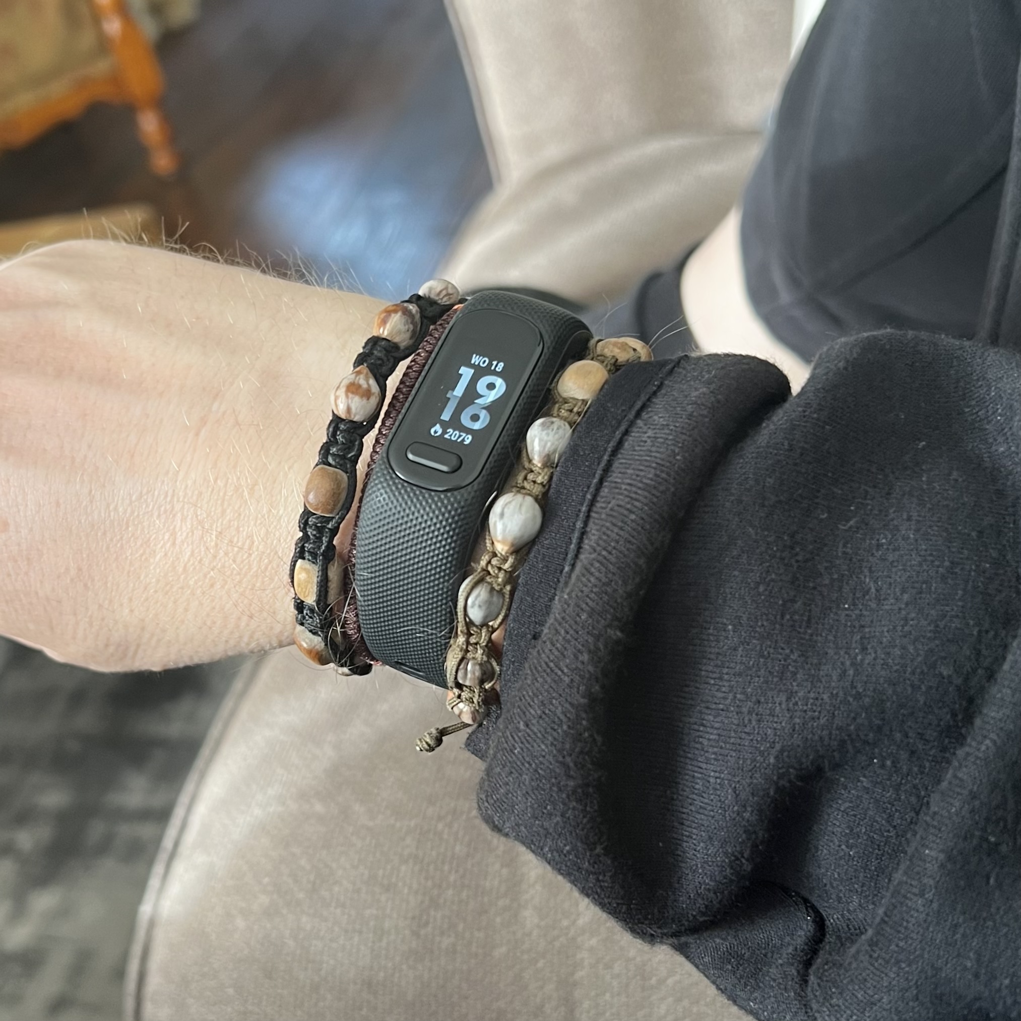 Maar die heb ik verkocht en ik heb nu een Garmin Vivosmart 5. Toch de afstanden meten, meldingen binnen krijgen en zo voorts, maar het lijkt op een armband. Dus kan aan de andere pols gewoon een mooi horloge en zie ik er niet uit als een of andere dwaas met twee horloges om z’n polsen