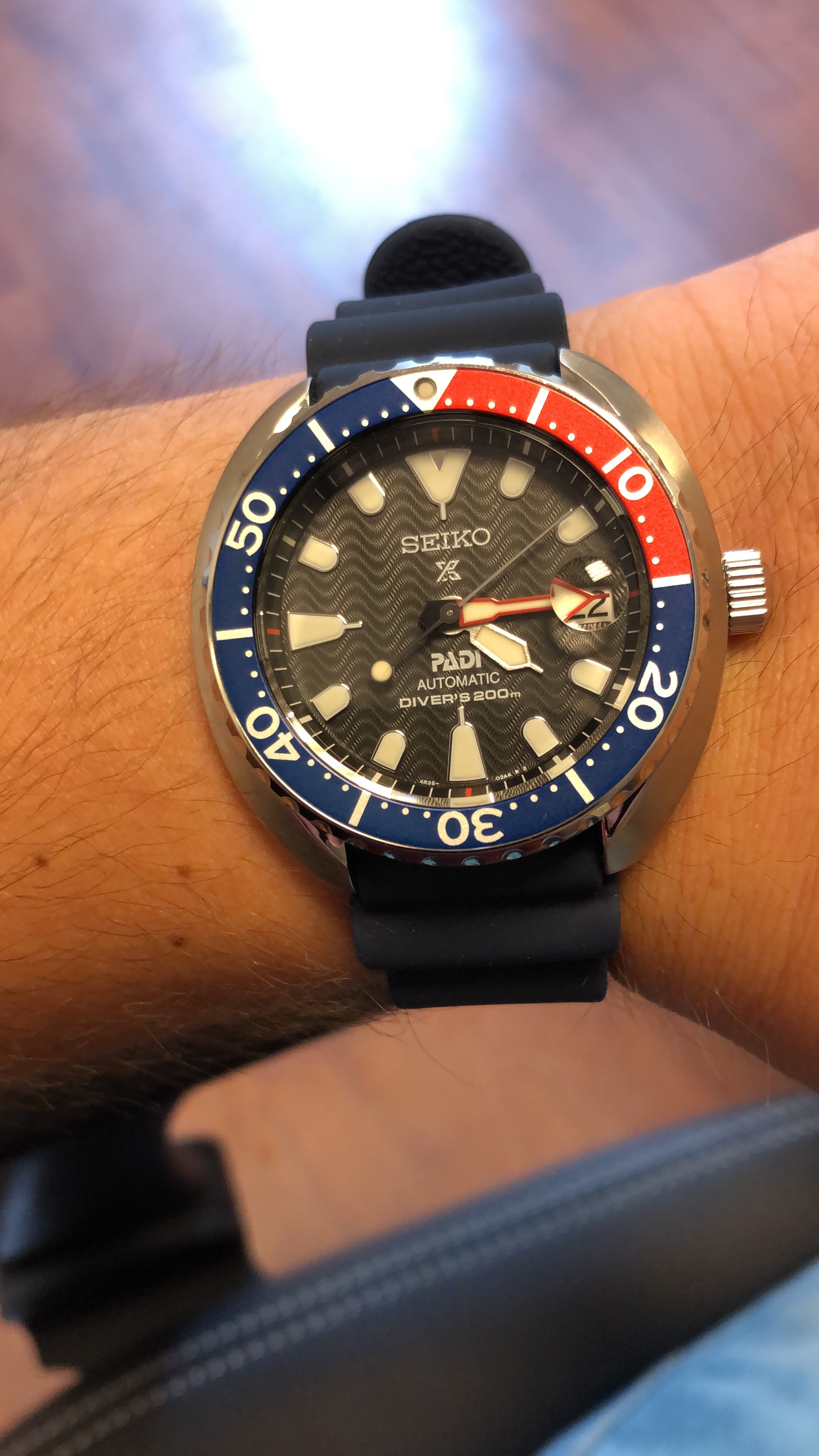Na een hele tijd geen nieuwe aanwinsten te hebben gekocht, begon het onlangs toch weer te jeuken, vooral na het zien van de Mini Turtle van @Fate_Amenable_To_Change. Mooie maat, lekker voor in de zomer. Eigenlijk was ik benieuwd of Seiko ze ook in de uitvoering van “Save The Ocean” zou uitbrengen maar in Europa schijnen ze niet echt heel hard te lopen dus de kans dat ze er bij Seiko, naast de bestaande speciale uitvoeringen, nog meer Limiteds van zouden uitbrengen is niet heel groot. Via een tip van @HorlogeOpa Hans kwam ik bij een juwelier die oa een blauwe had staan en laat dat nou net mijn favoriete kleur zijn