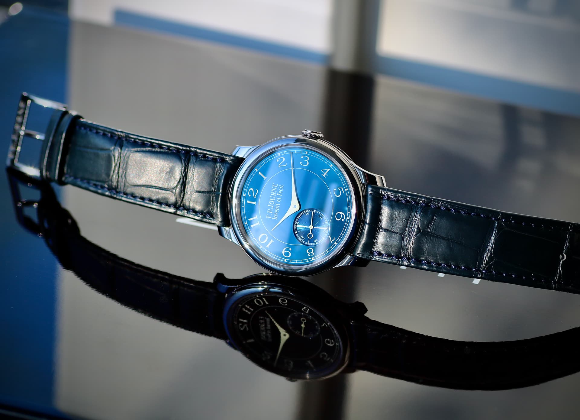 Dan was er nog de wijzerplaat … waarschijnlijk het meest opvallende onderdeel van het horloge, maar ook het moeilijkst te maken. Om die opvallende blauwe ‘spiegel’ te krijgen, wordt de plaat meerdere keren gepolijst en gelakt. Dat proces is zó delicaat dat uiteindelijk maar één op de vier à vijf platen goed genoeg is om te gebruiken. De rest, waar veel tijd en werk in zit, belandt in de prullenbak. Vergelijk het met émail cloisonné, zoals bij de Patek Worldtimer 5131: ook daar leidt het arbeidsintensieve proces vaak tot frustratie, omdat zoveel platen onbruikbaar eindigen.