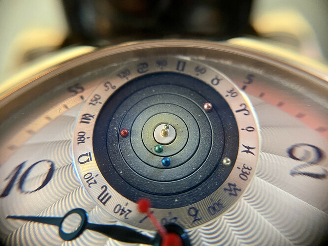 Maar wat natuurlijk gelijk de aandacht krijgt bij het zien van het horloge: is het Planetarium! Dit is werkelijk een spektakel om te zien, steeds weer, elke dag weer. Dit planetarium is met de hand geschilderd door Christiaan van der Klaauw, elk planetarium is uniek, hoewel in grote lijnen een paar verschillende gemaakt zijn (zie de verschillende planetaria bij “Geschiedenis Planetarium horloge” in deel 1/3 https://www.horlogeforum.nl/t/g-a-grail-aanwinst-christiaan-van-der-klaauw-planetarium-1-3-naslag-geschiedenis-van-der-klaauw-en-planetarium-horloge/ ).