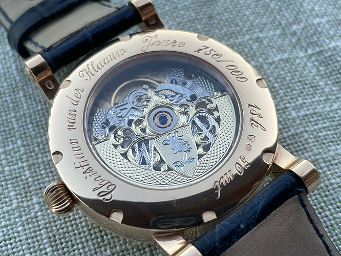 Het horloge kwam met een donker blauwe leren band, welke goed samengaat met het horloge. De sluiting is een 18k gouden gesp met handgravure door Jochen Benzinger. Deze gesp ziet er prachtig uit, hoewel mijn voorkeur een vouwsluiting zou zijn. Helaas hadden ze bij van der Klaauw geen vouwsluiting met het oude logo erop, enkel moderne vouwsluitingen met het nieuwe logo erop. Dan gaat mijn voorkeur uit naar deze originele sluiting met oud logo.