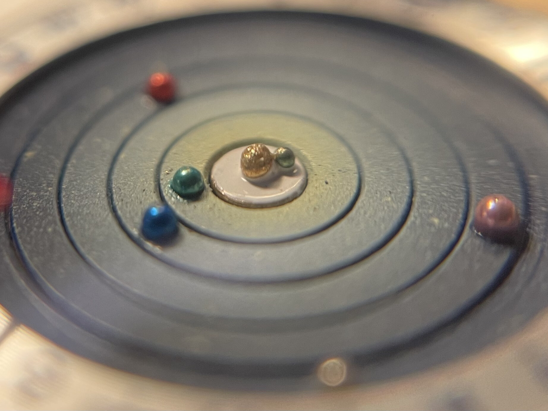 Als met een macrolens gekeken wordt naar het planetarium, worden sommige verrassende details zichtbaar die met het blote oog niet te zien zijn. Zo is te zien dat Mercurius aan de zon vast zit. Het lijkt alsof de binnenste schijf, met zon en Mercurius, eerst goudkleurig was en pas later wit geschilderd is. Met name via de zijkant is dit te zien, waarbij de witte verf aan de onderzijde van zon en Mercurius zit. Bij andere planeten, zoals Venus, is te zien dat de groene verf ook minimaal op de planeetschijf zit, een andere volgorde. Op sommige planeten, zoals de blauwe aarde, is op macro niveau oneffenheid in de verf aan de bovenkant van de planeet te zien. Leuk te vermelden is dat volgens @Master_Fan Christiaan van der Klaauw sommige planeten maakte van gespoten afgeknipte spelden knoppen. Duidelijk is te zien dat het planetarium met de hand geschilderd is. Het planetarium is op elk niveau een echt kunstwerk om naar te kijken.
