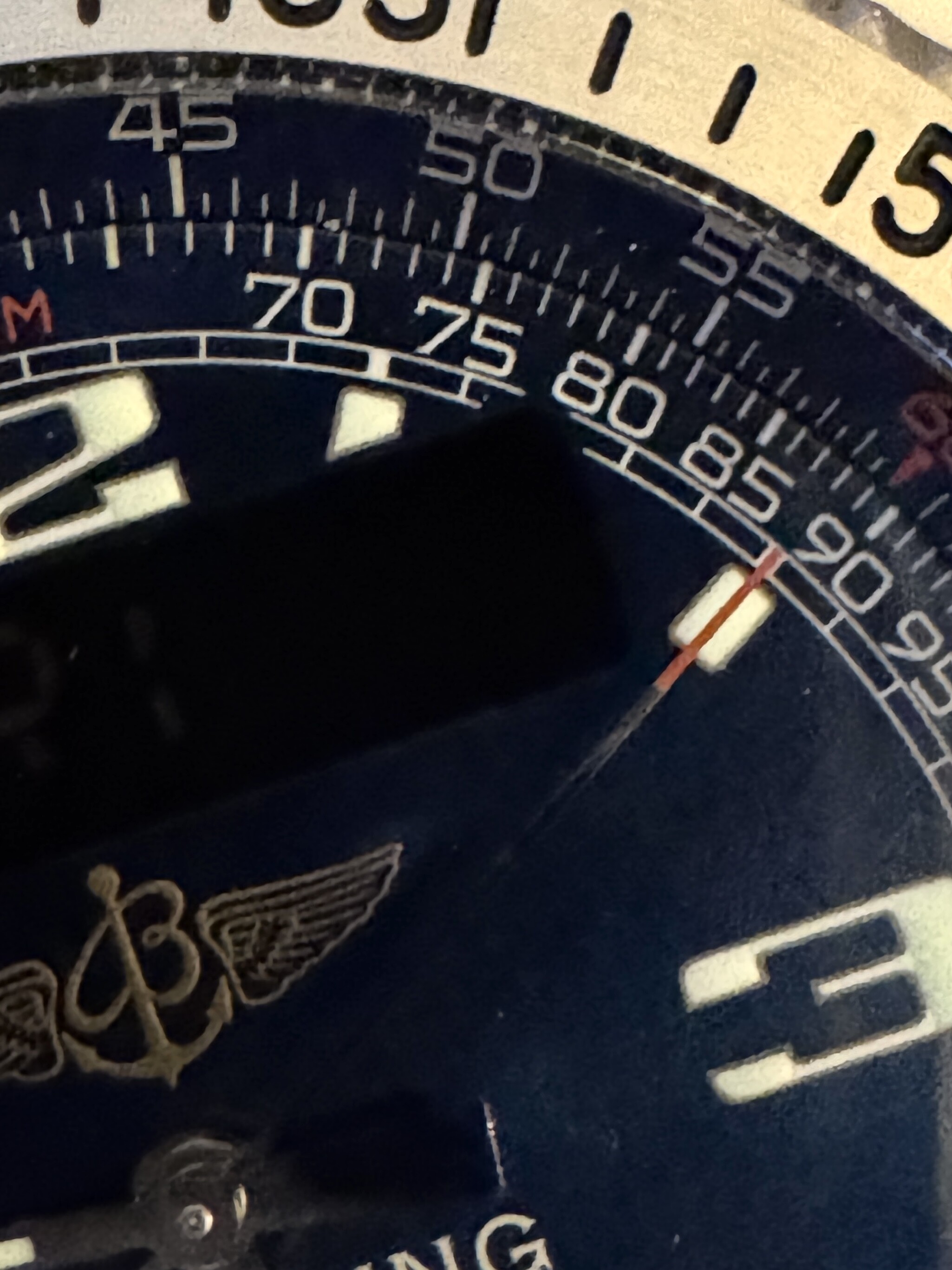 En tov Breitling Aerospace, tikt deze secondewijzer wel altijd strak het streepje ⊠waar het bij Breitling soms wel soms niet was .