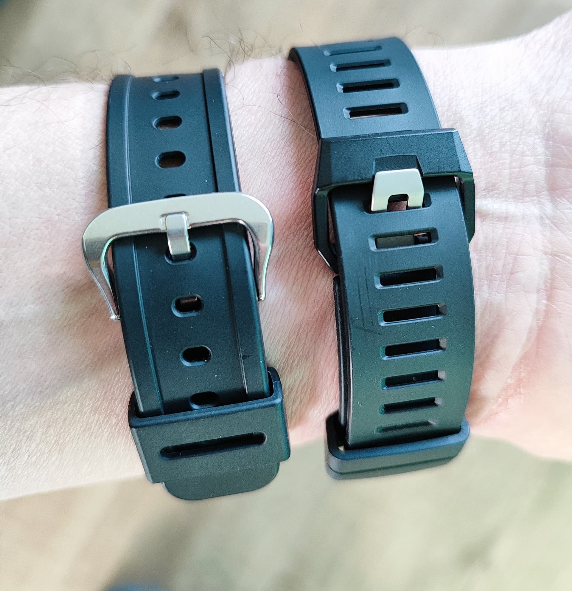 Dit is het bandje van een GBD800, heb ik op 3 horloges gezet, is erg soepel en comfortabel en de gaatjes zitten dicht bij elkaar, dus meer keuze in hoe strak of los je hem zet.
