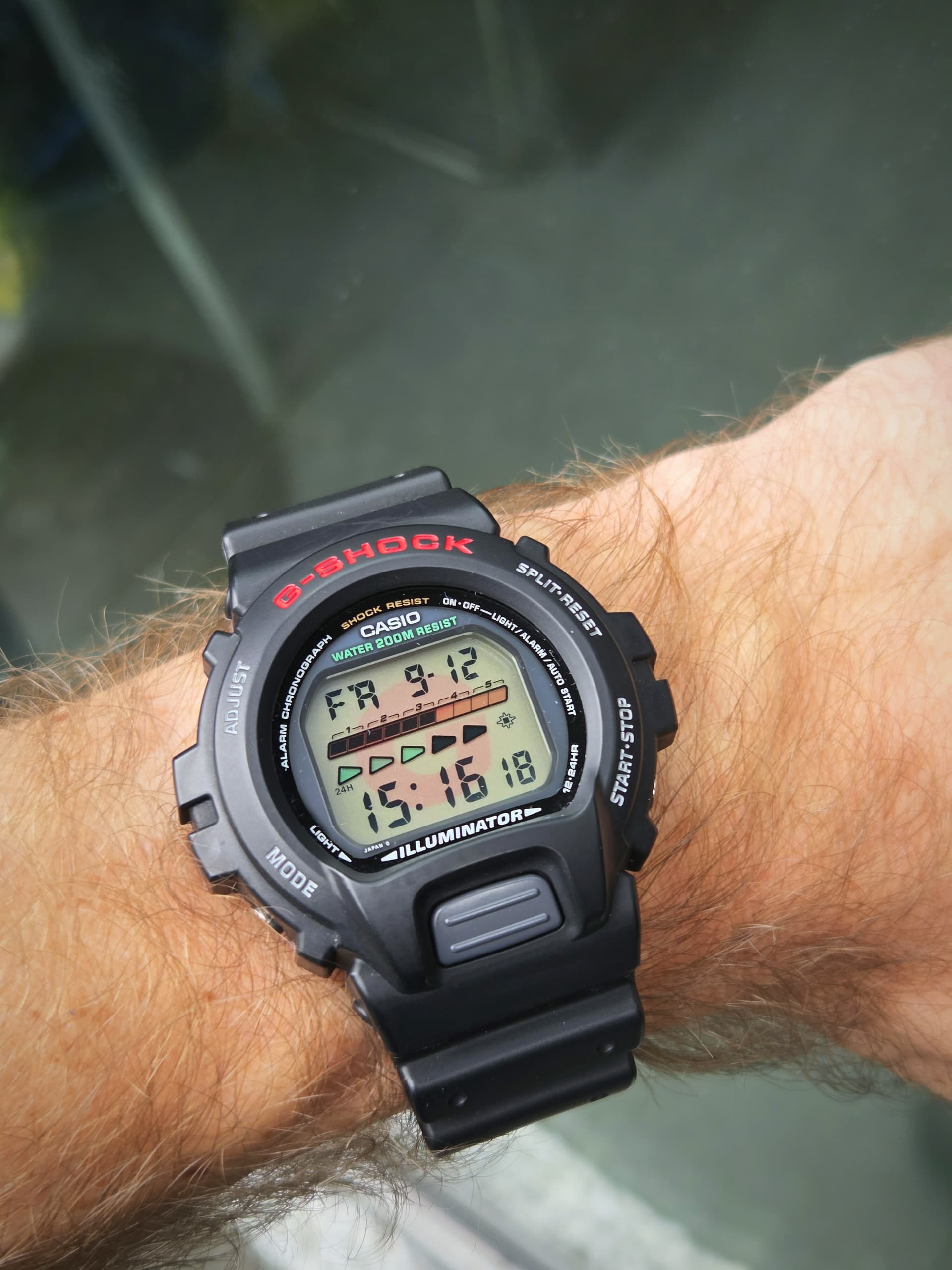 Deze 6900 heb ik al 20 jaar, als het niet meer is. Nog lang voordat ik bij HF kwam. Ondertussen is de bezel vervangen en de batterij 3 keer, dus ik ben niet helemaal zeker wat de WR betreft. Maar daar heb ik de nieuwe G square voor ![]()