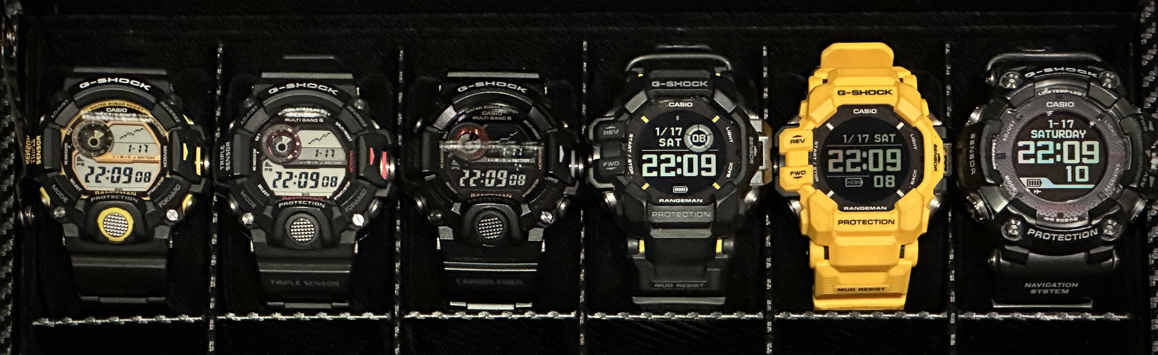 Weet niet precies hoe het zo gekomen is, maar er heeft zich in het afgelopen jaar een rijtje Rangemannen in een van de horlogedozen genesteld, waaronder ook de tweede heel recente NA… de gele GPR-H1000 van @ESmilde.