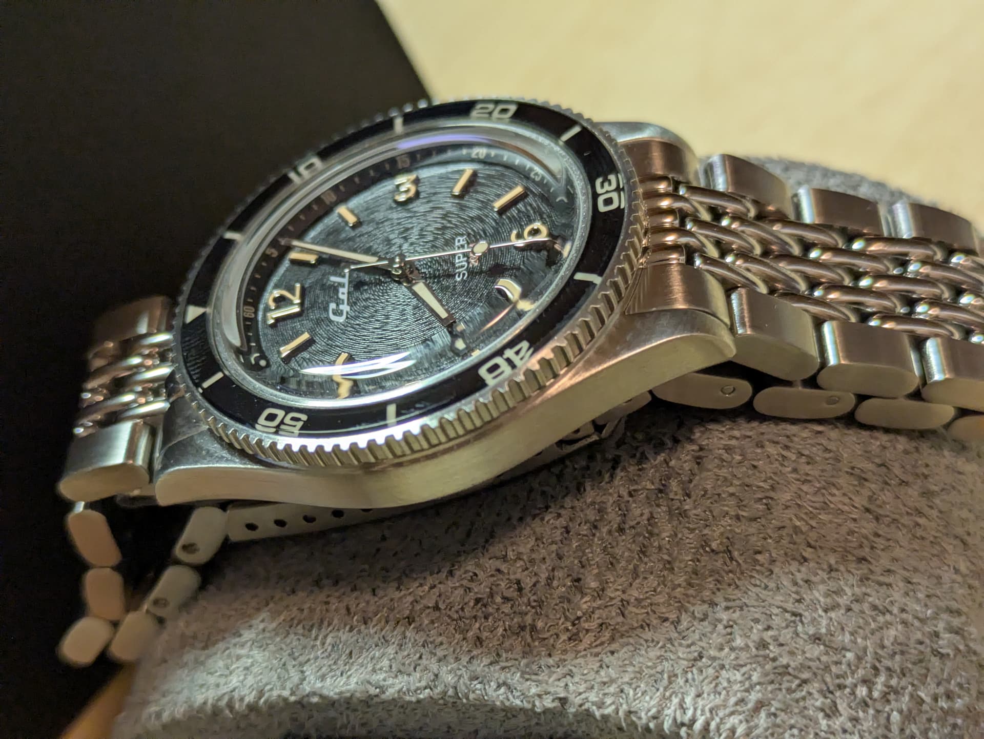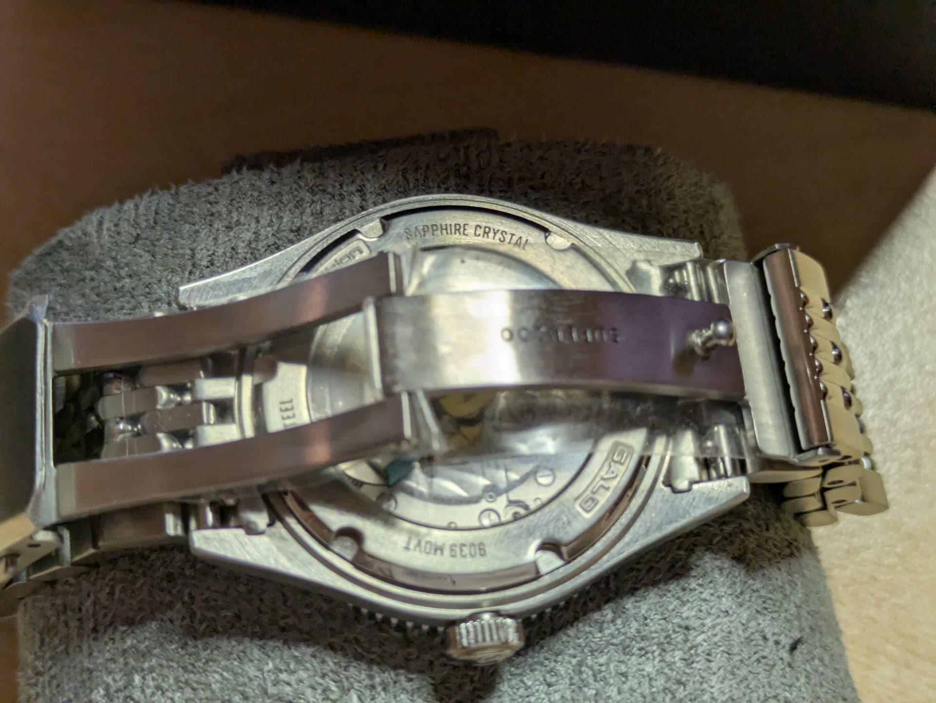 Veel leuke details, oil pressed wijzerplaat met liggende 3, lume in de kroon, saffier, zichtbodem, lekker plat etc.