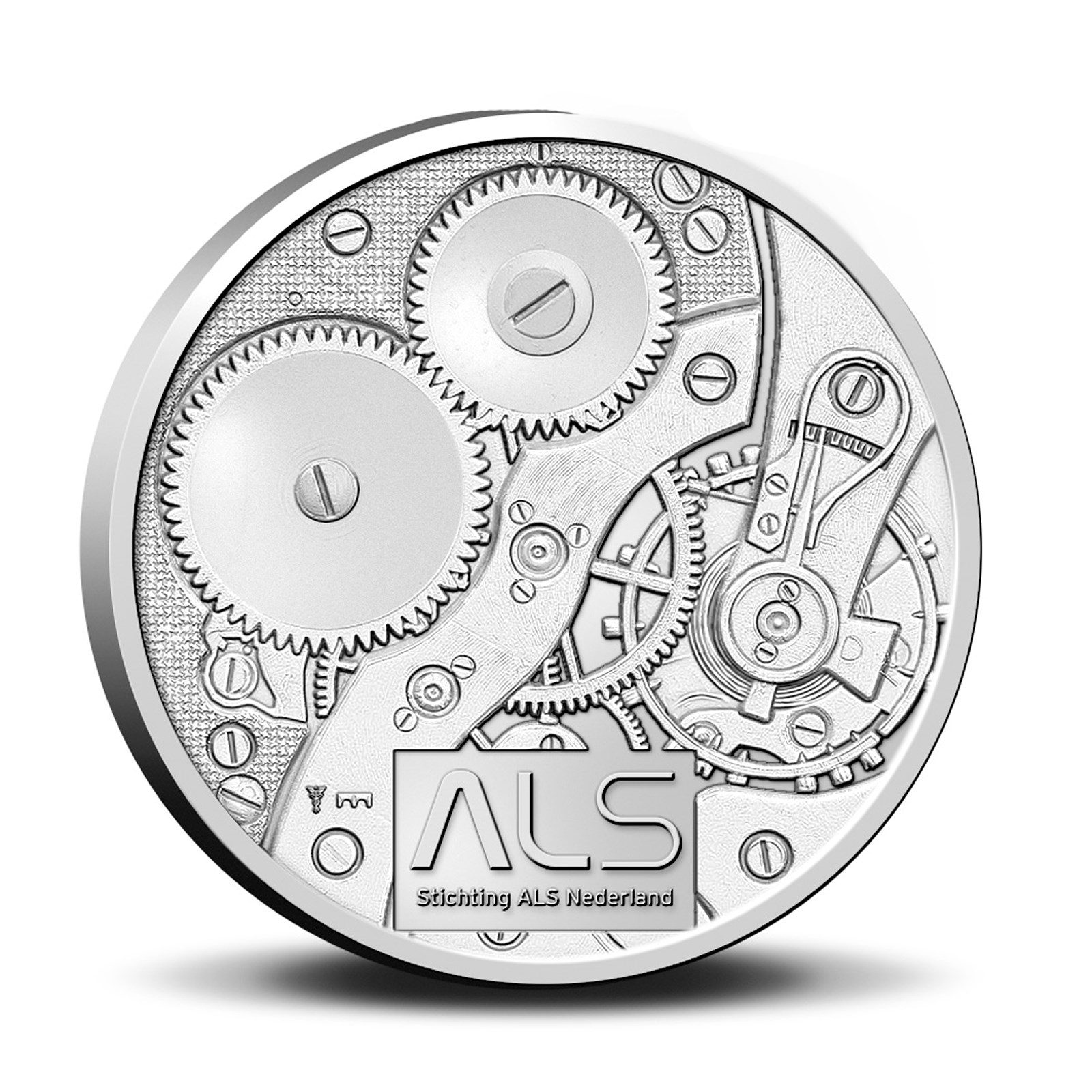 Om de nieuwe campagne ‘Geen tijd te verliezen’ van Stichting ALS Nederland extra kracht bij te zetten toont de munt een klok op de voorzijde. Het bijzondere is dat deze klok niet stilstaat: de wijzer beweegt als u de munt beweegt. Dit special effect zorgt ervoor dat uw munt er vanuit elke hoek weer anders uitziet. De klok symboliseert hoe de tijd voor ALS patiënten en hun naasten voorbij tikt. Ook de keerzijde is het bewonderen waard. Hier ziet u een gedetailleerde weergave van de binnenkant van een uurwerk.
