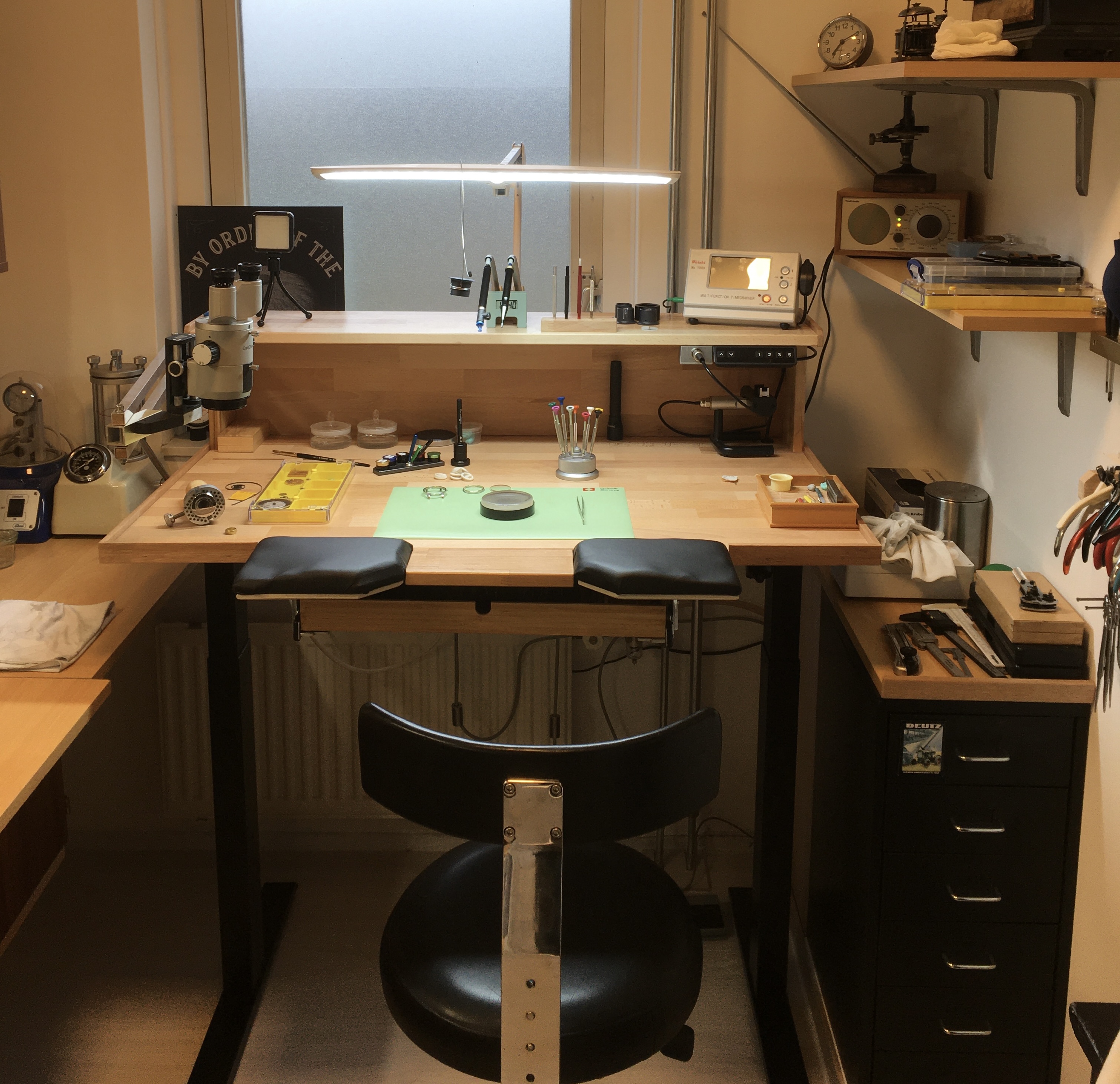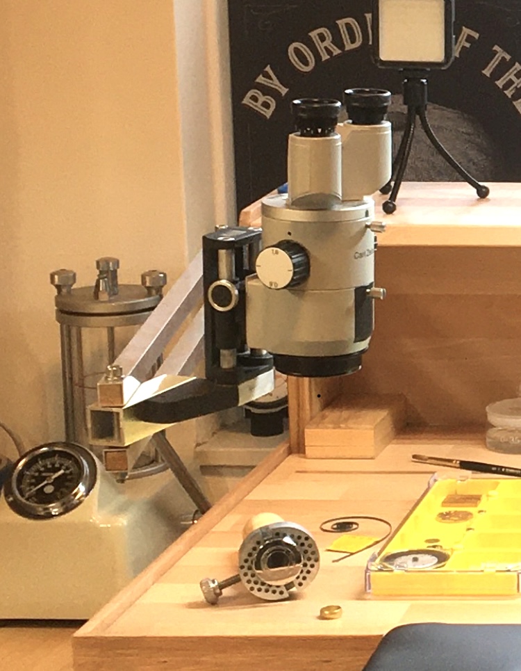 Naast al het broodnodige standaardspul als uurwerkhouders, pincetten, schroevendraaiers en (handmatige) oliegevers staat de stereomicroscoop toch wel bovenaan de lijst van onmisbare zaken. Moet er niet aan denken om nog met een oogloepje olie te moeten geven