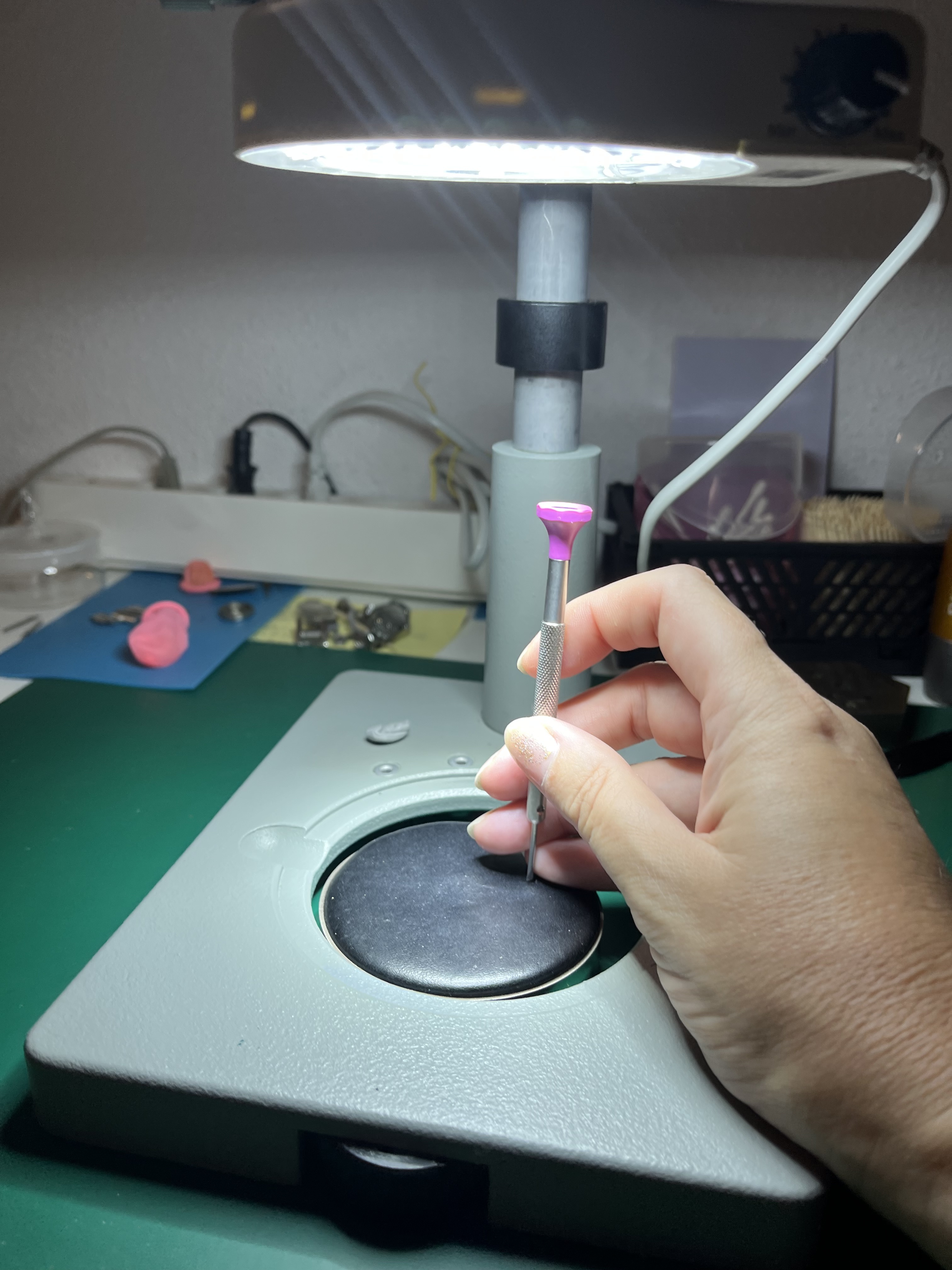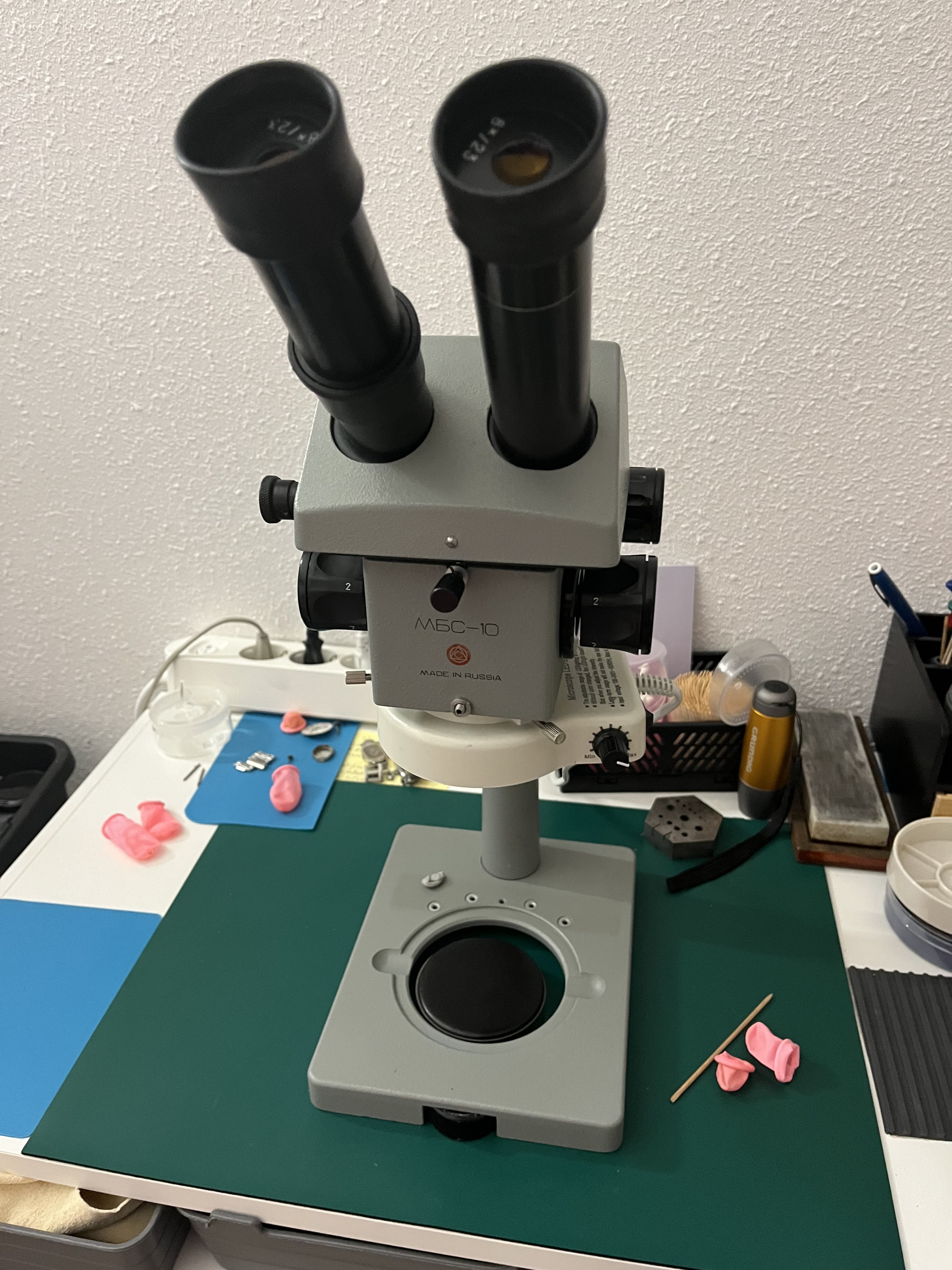 Mijn Russische microscoop waar ik het hele uurwerk mee ontmantel en in elkaar zet. Inzoomen, uitzoomen, heerlijk. In combinatie met de hooglaag kruk van de ikea voor de juiste houding.