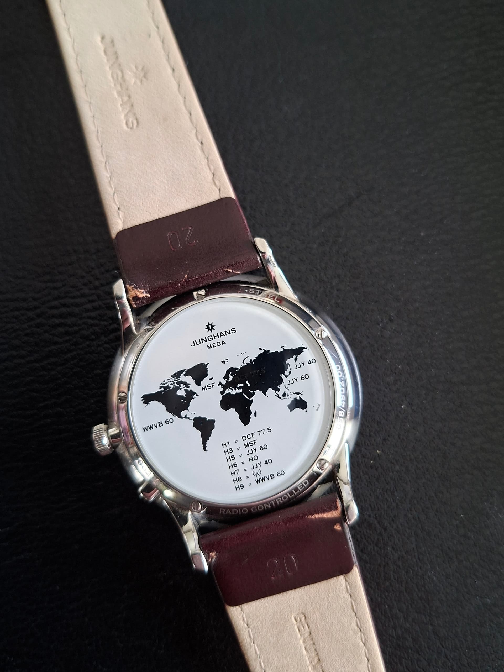 Komt op de originele bordeaux band met Junghans-gesp.