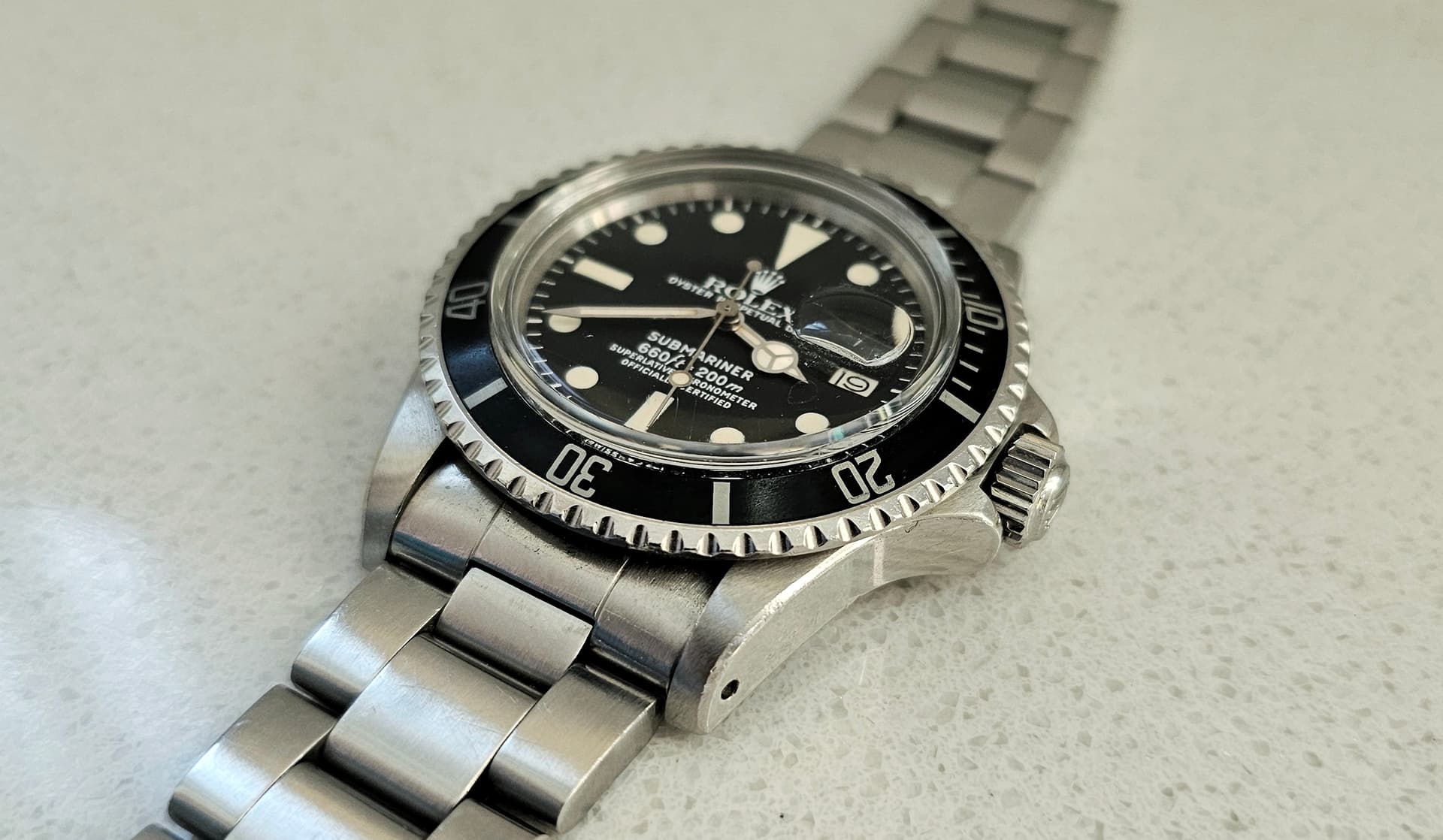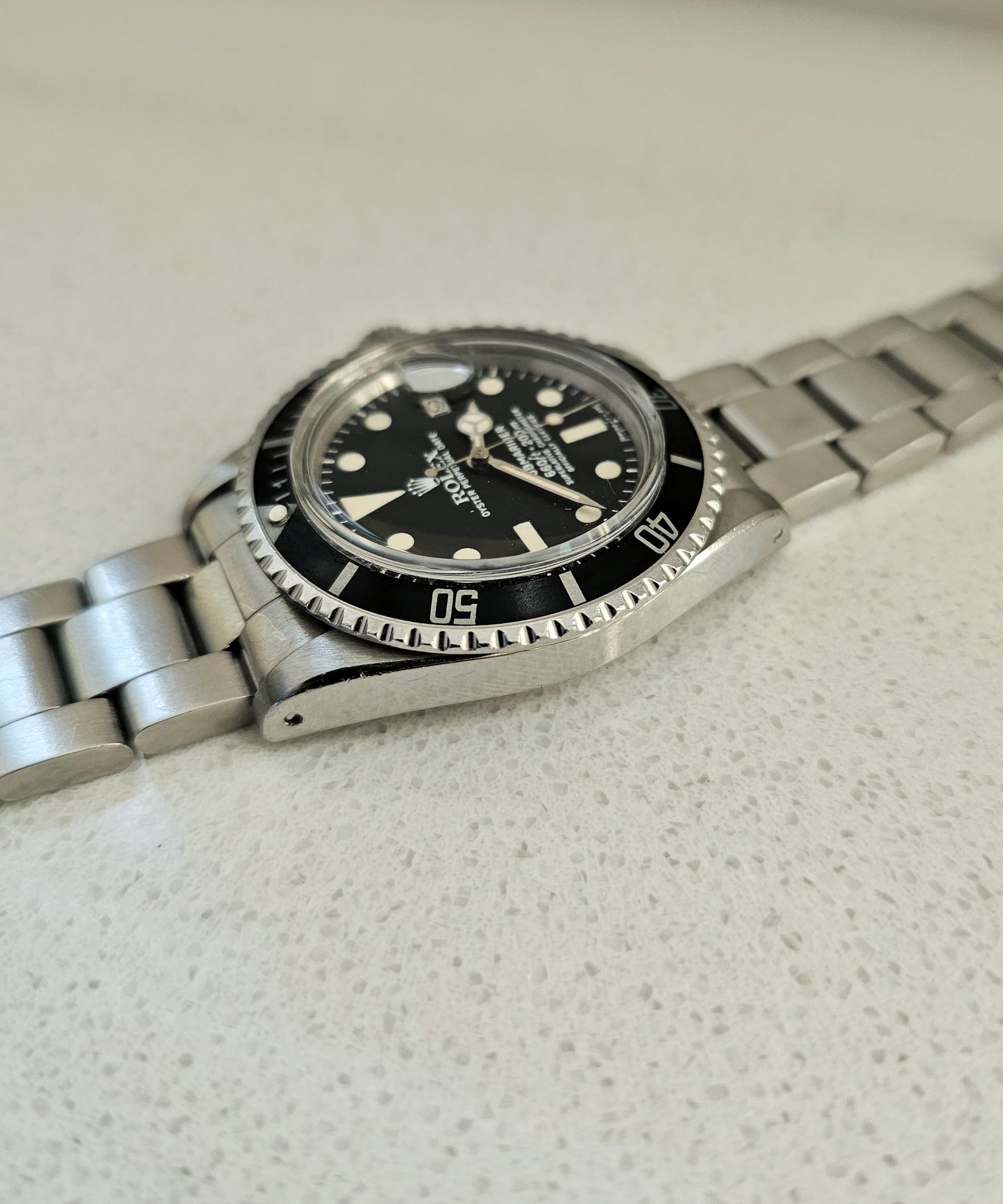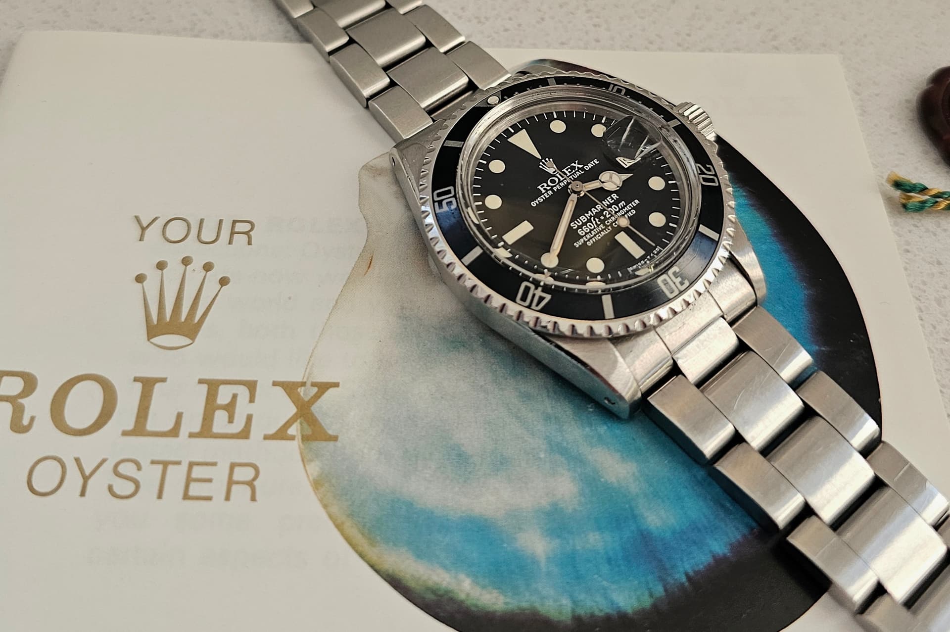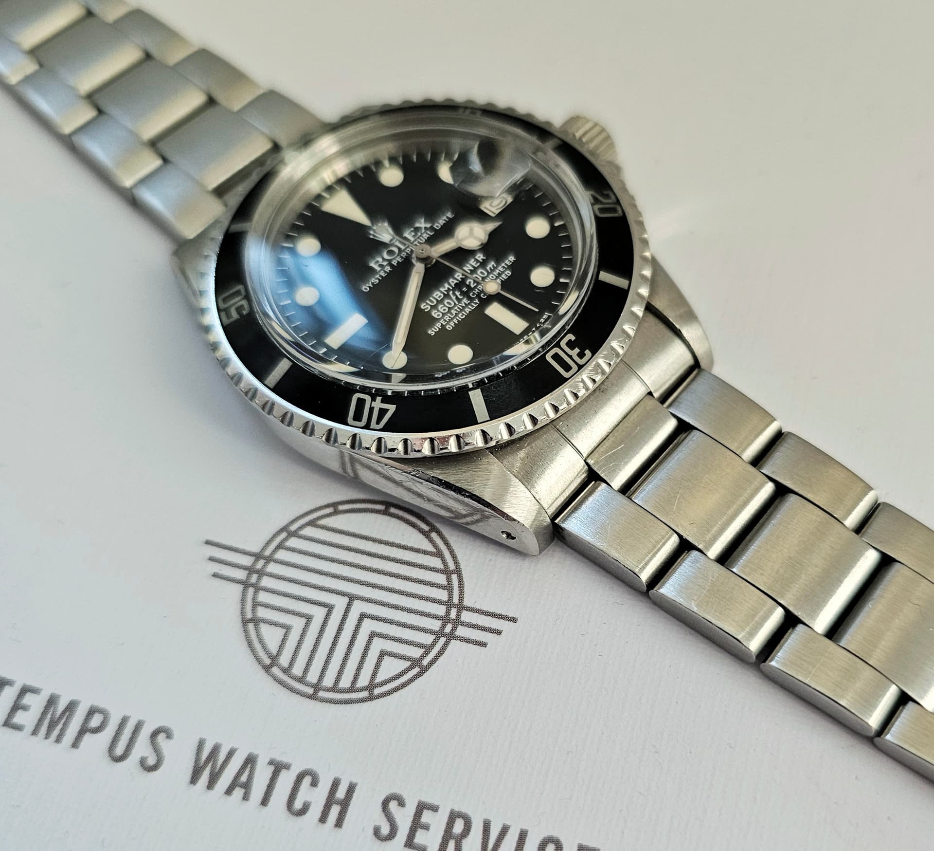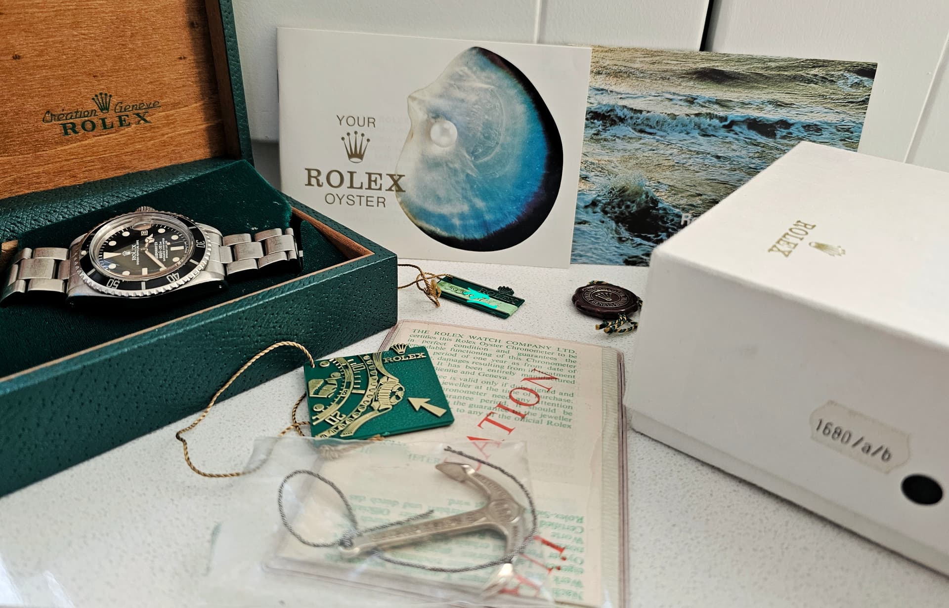 Origineel Nederlands geleverde full set Rolex Submariner 1680 uit 1977. Maar dan ook echt full set. Ik heb hem hier van het forum en hij is helemaal herleidbaar naar de eerste eigenaar. Heeft in november 2022 een volledige revisie ondergaan bij Tempus. Daar zijn de kastpootjes licht geschuurd, is er een bijpassende pip geplaatst en is het horloge voorzien van een nieuwe plexi. Het horloge loopt uitstekend.