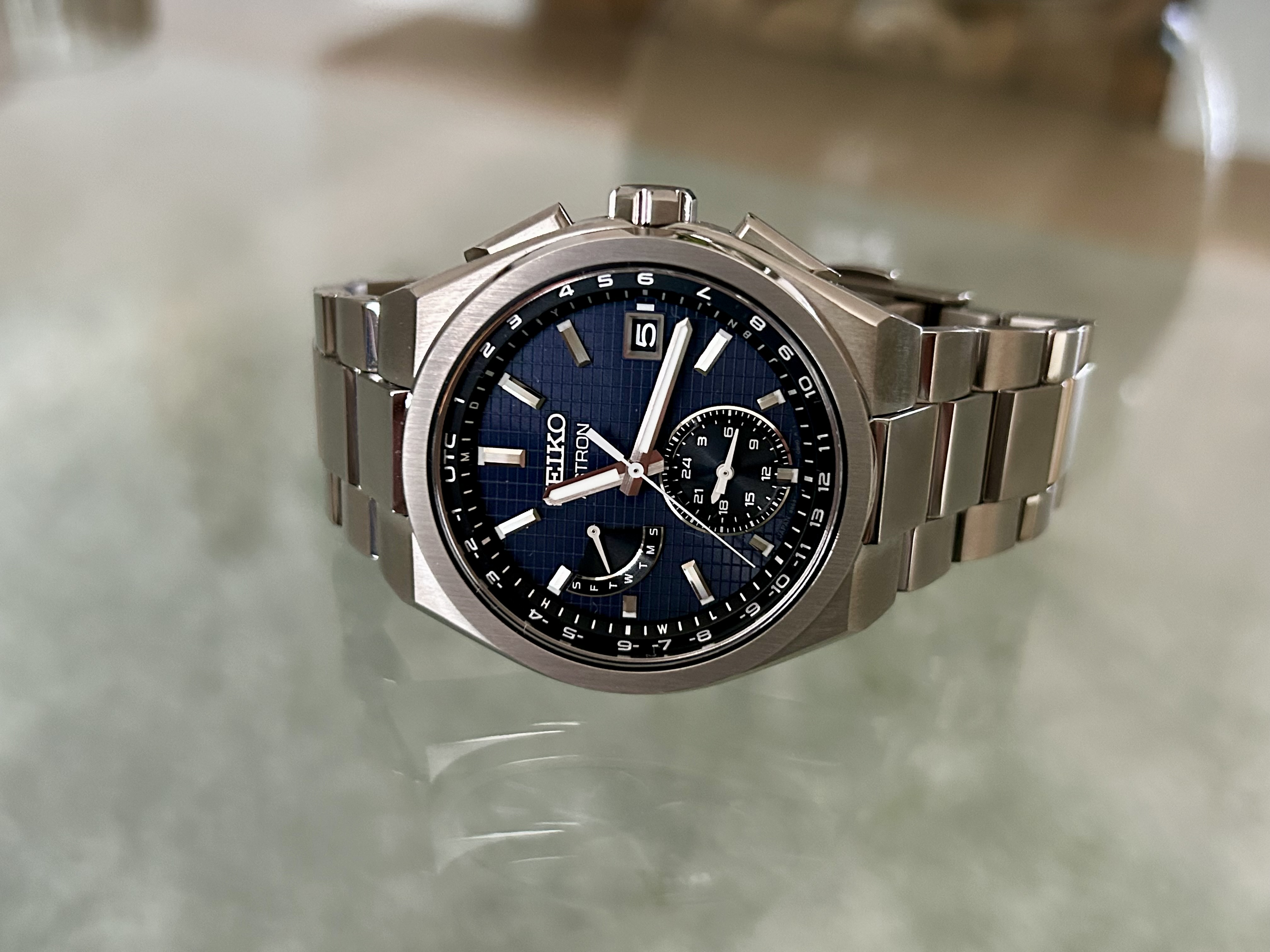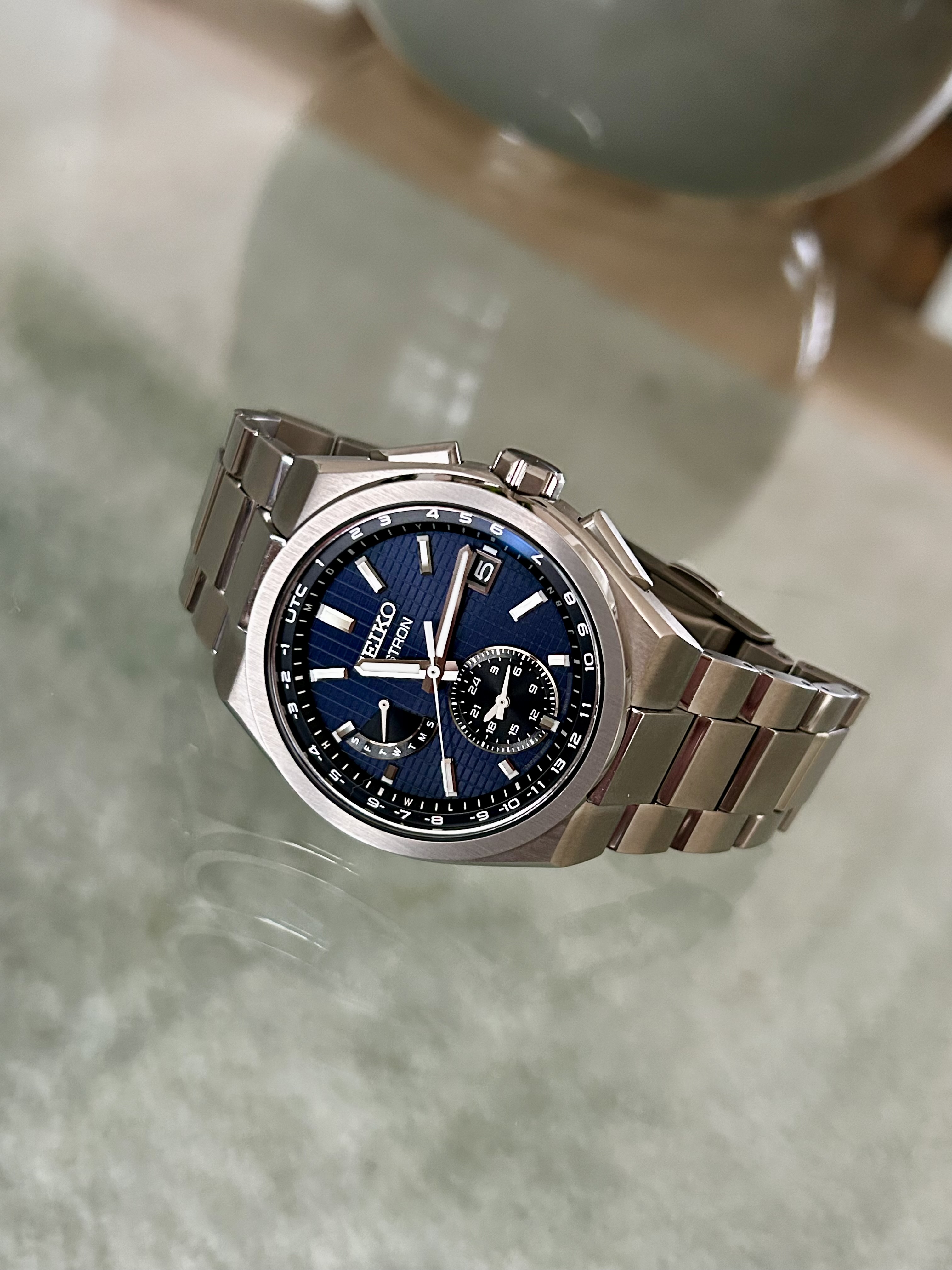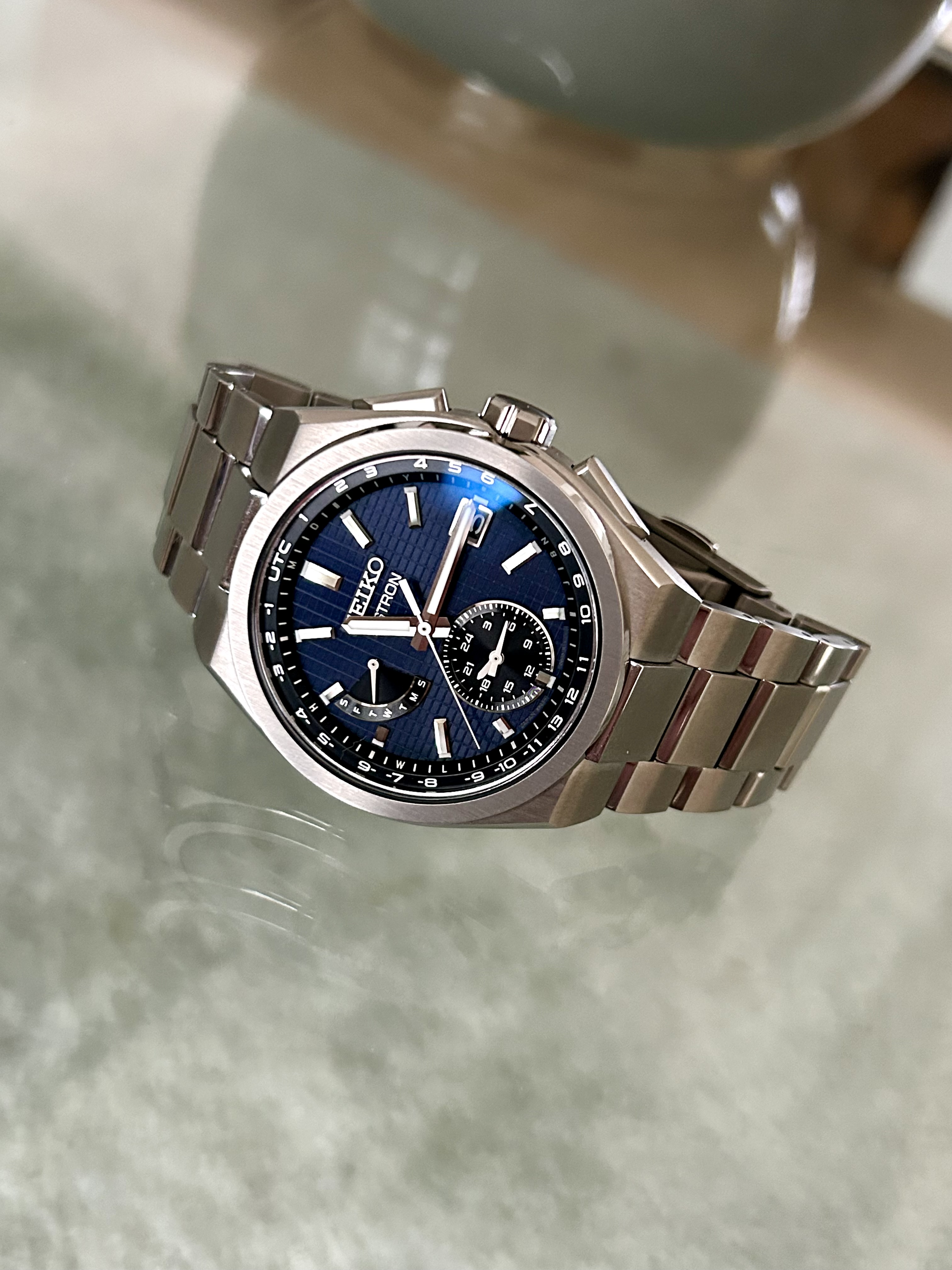 Lichtgewicht Titanium, draagt uitermate soepel, hele fraaie raster wijzerplaat, mooie kleur ingetogen blauw, daarom zowel sportief als relaxed boardroom draagbaar. Het saffier met Super Clear Coating is uiterst fraai.