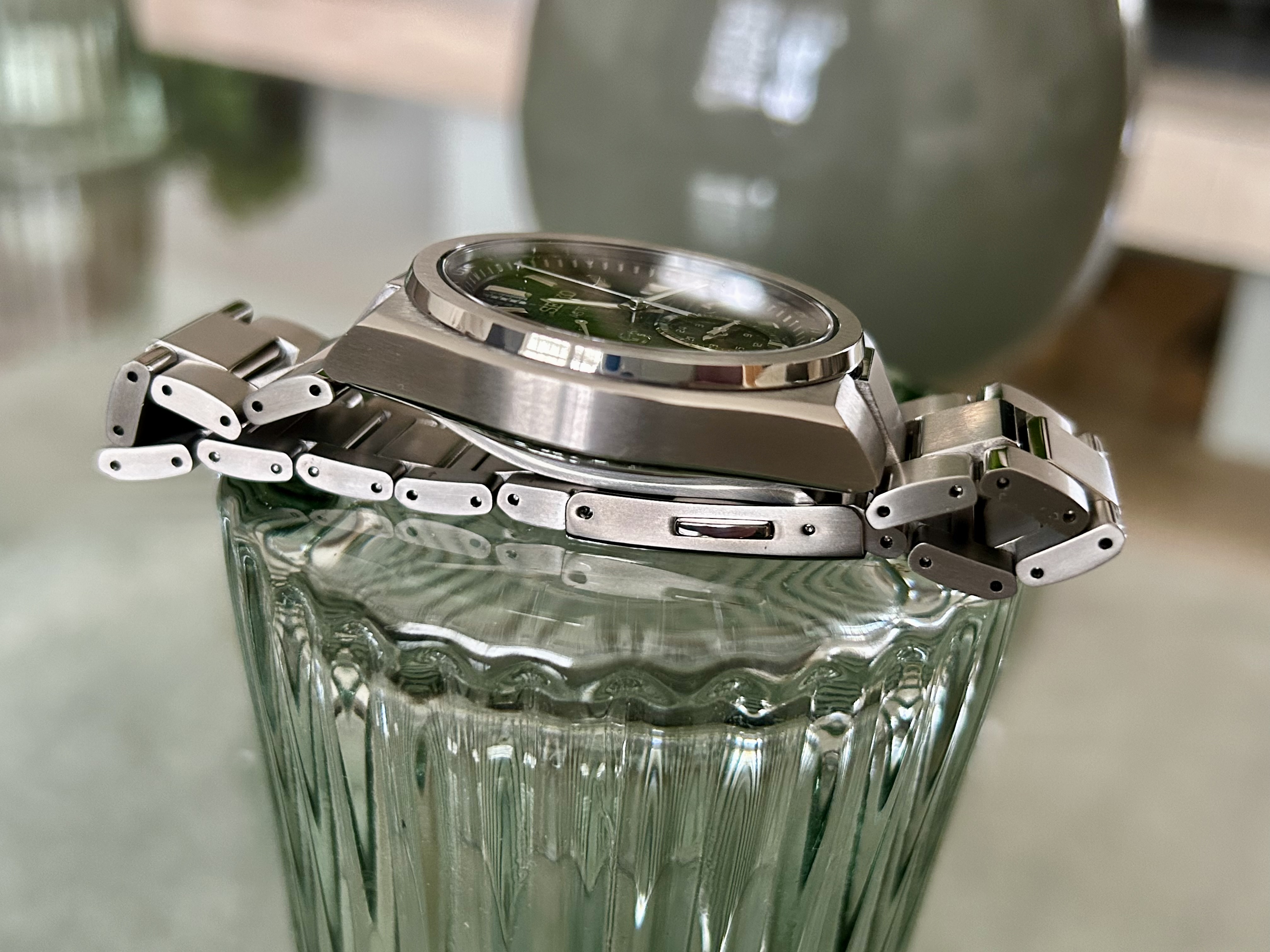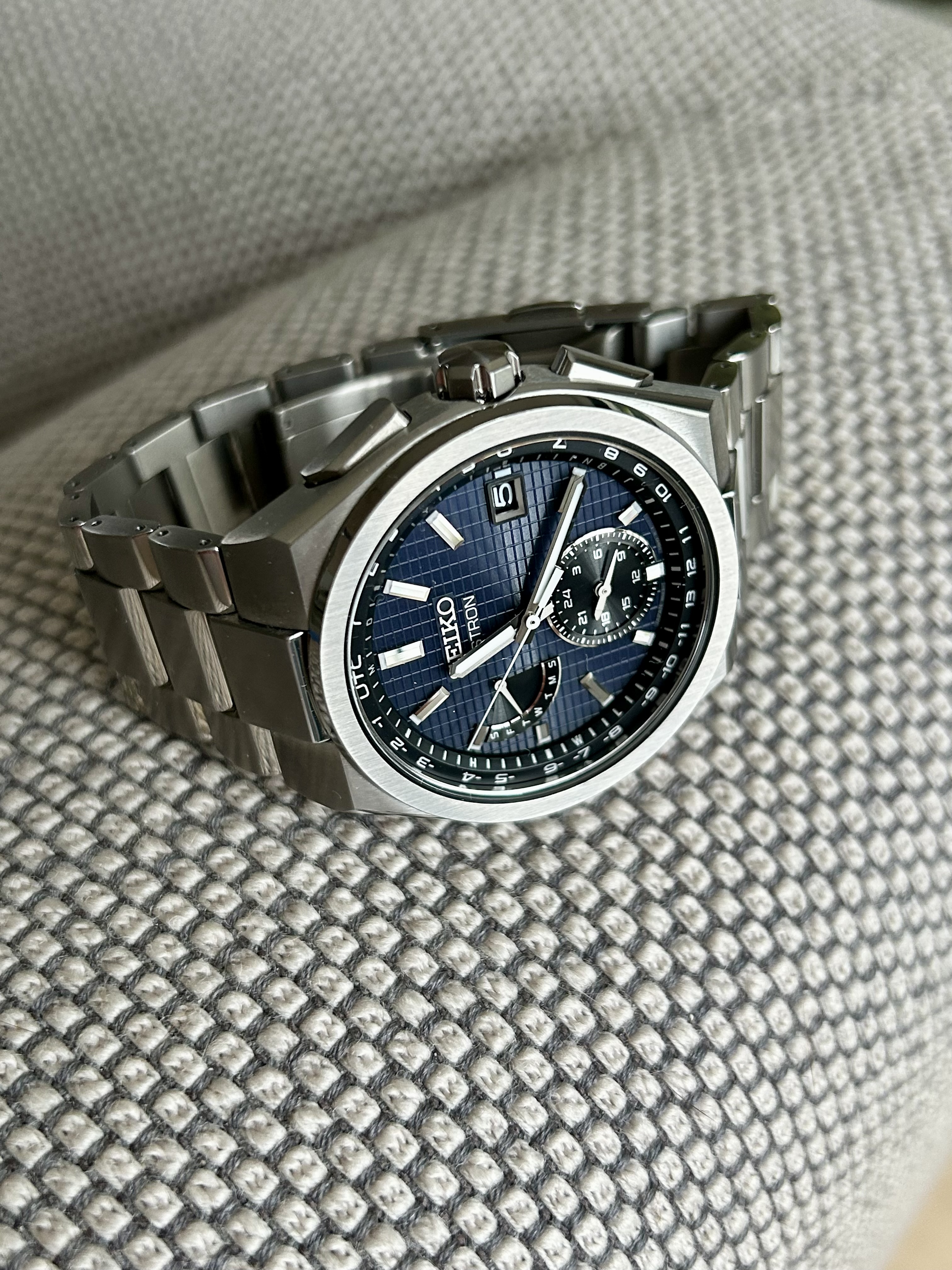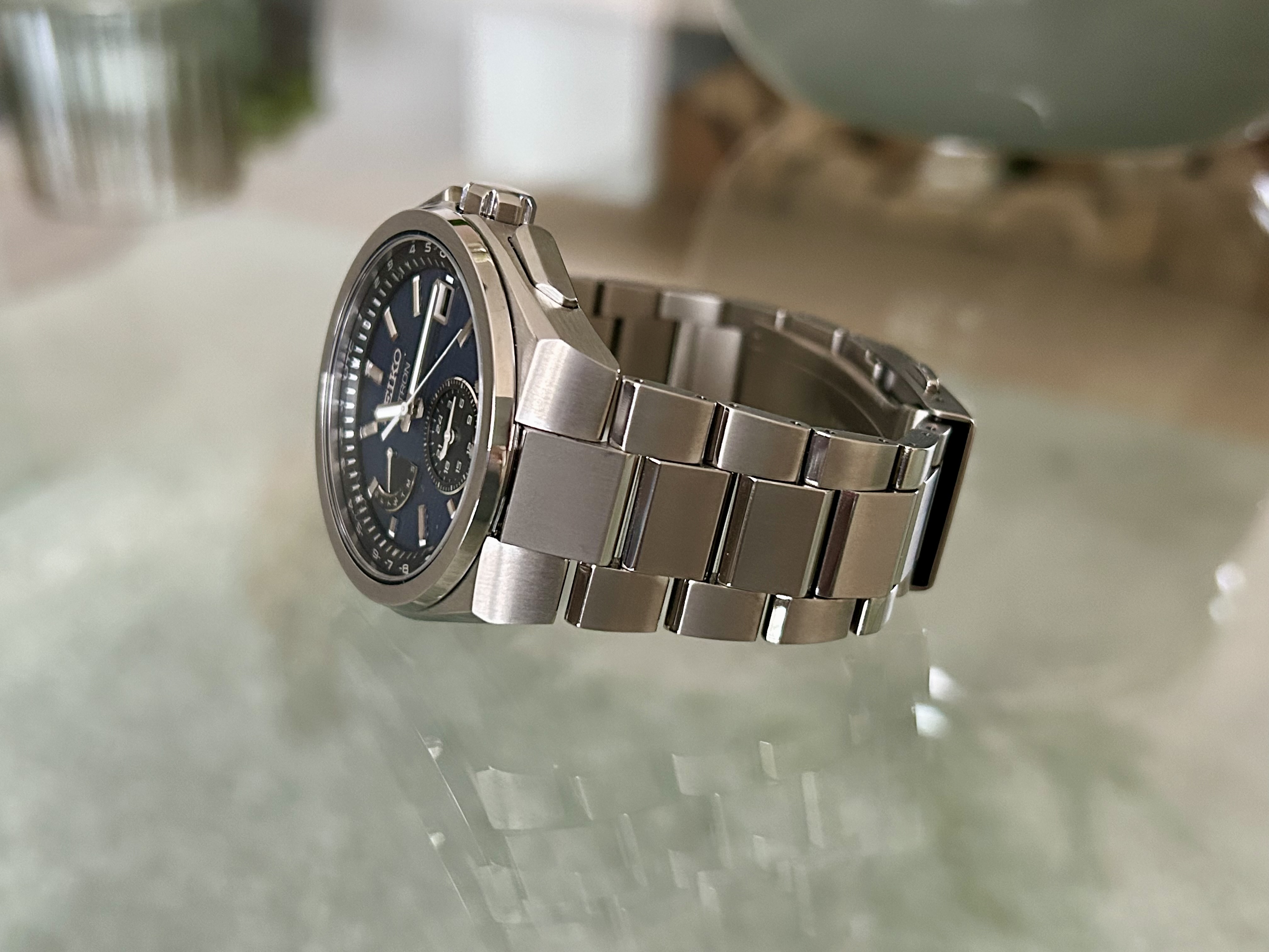 Lichtgewicht Titanium, draagt uitermate soepel, hele fraaie raster wijzerplaat, mooie kleur ingetogen blauw, daarom zowel sportief als relaxed boardroom draagbaar. Het saffier met Super Clear Coating is uiterst fraai.