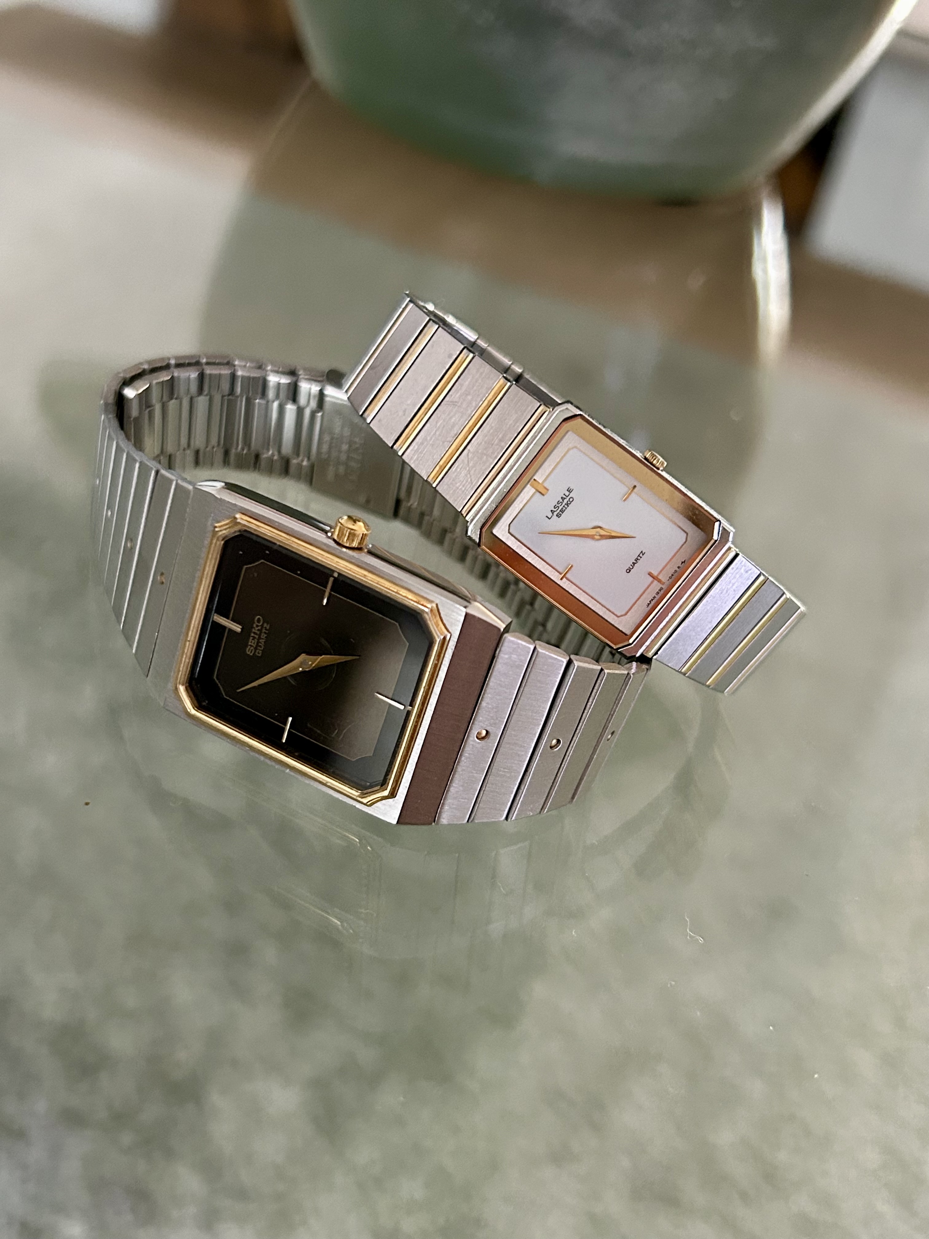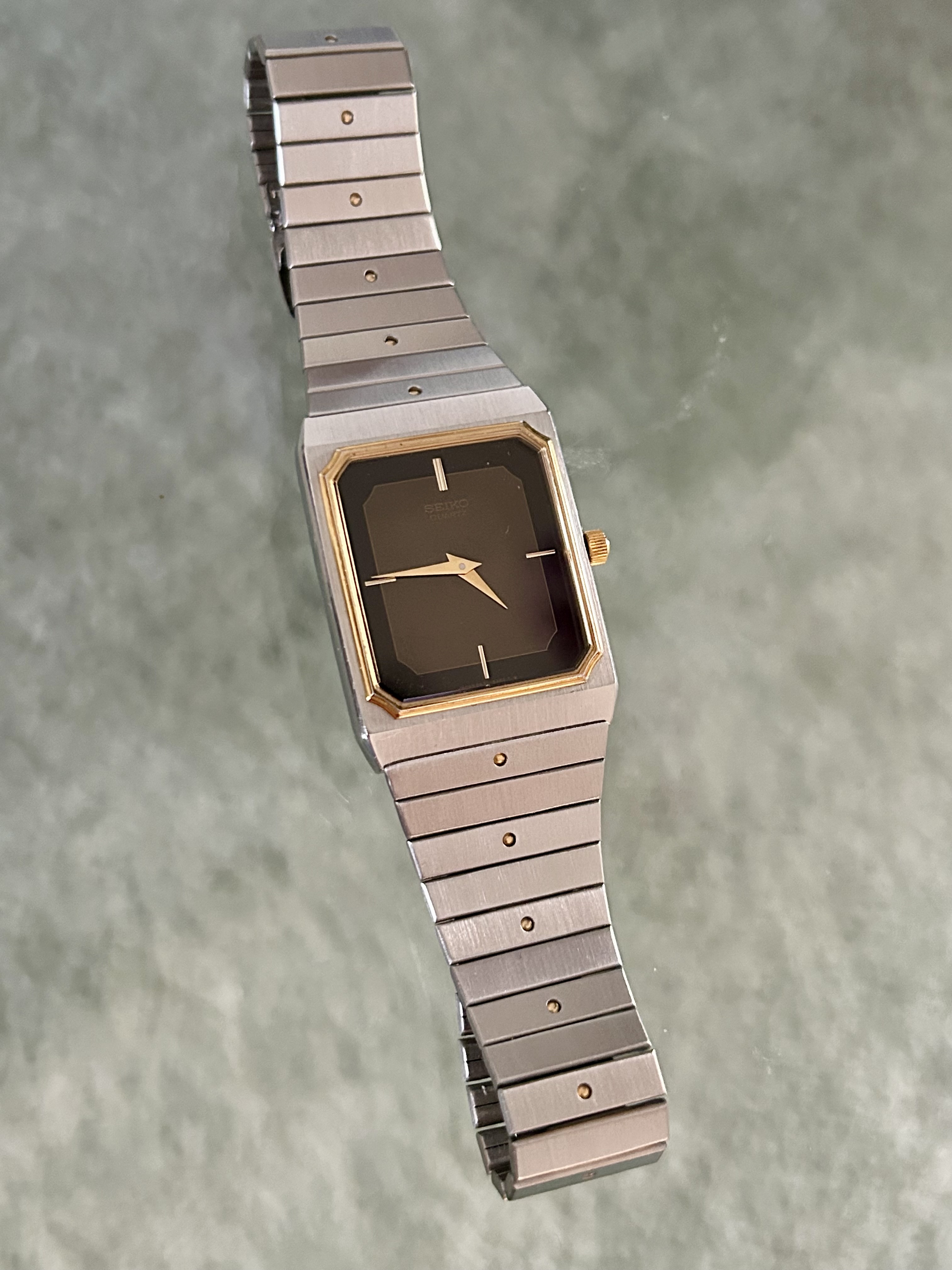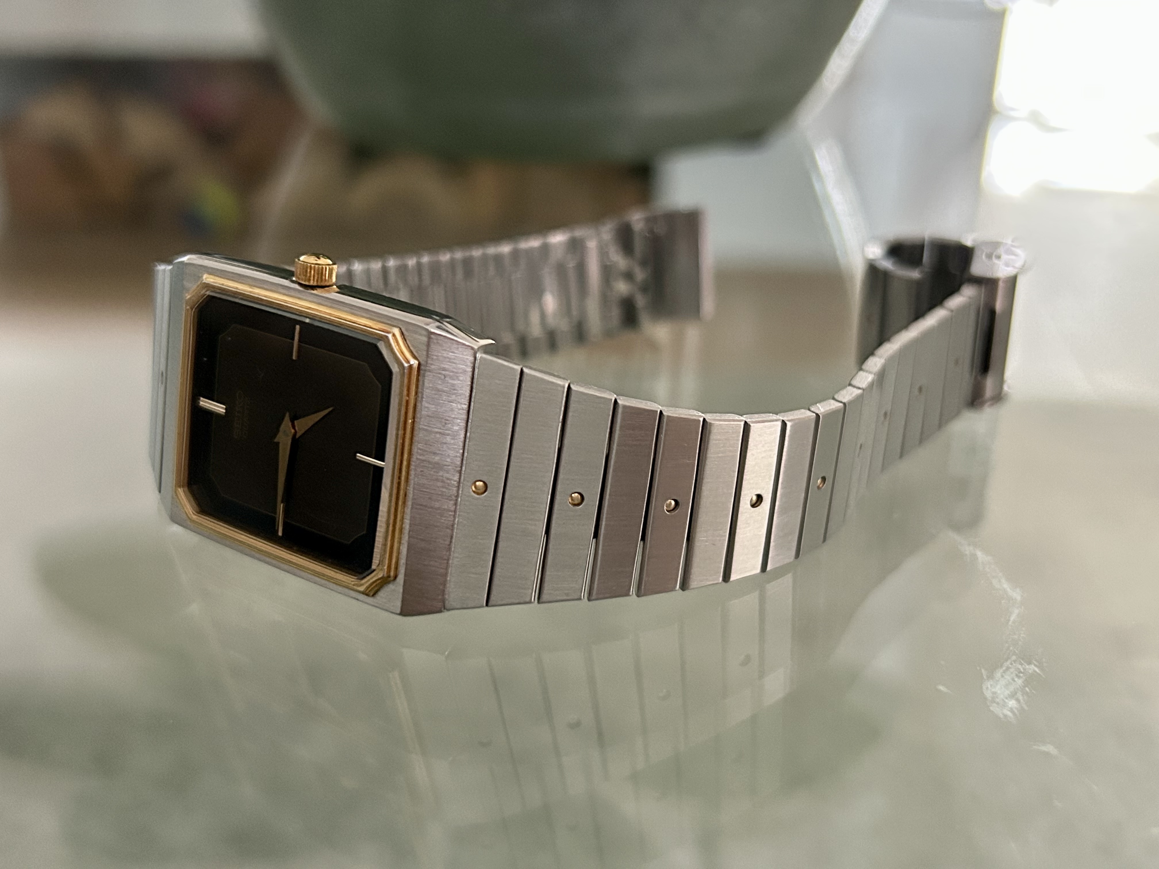 Fast forward 37 jaar. Twee weken geleden hoorde ik het wat rammelen in een lang vergeten doos en inderdaad. de LaSalle in slechte conditie. Glas kapot, kroon groen uitgeslagen, band zag er niet uit. @Horloge24 to the rescue. Glas en e-blok waren niet meer verkrijgbaar bij Seiko. Vond gelukkig bij SpareParts-Watches het glas en Andre kon nog aan de bodempakking en een alternatieve kroon komen.
