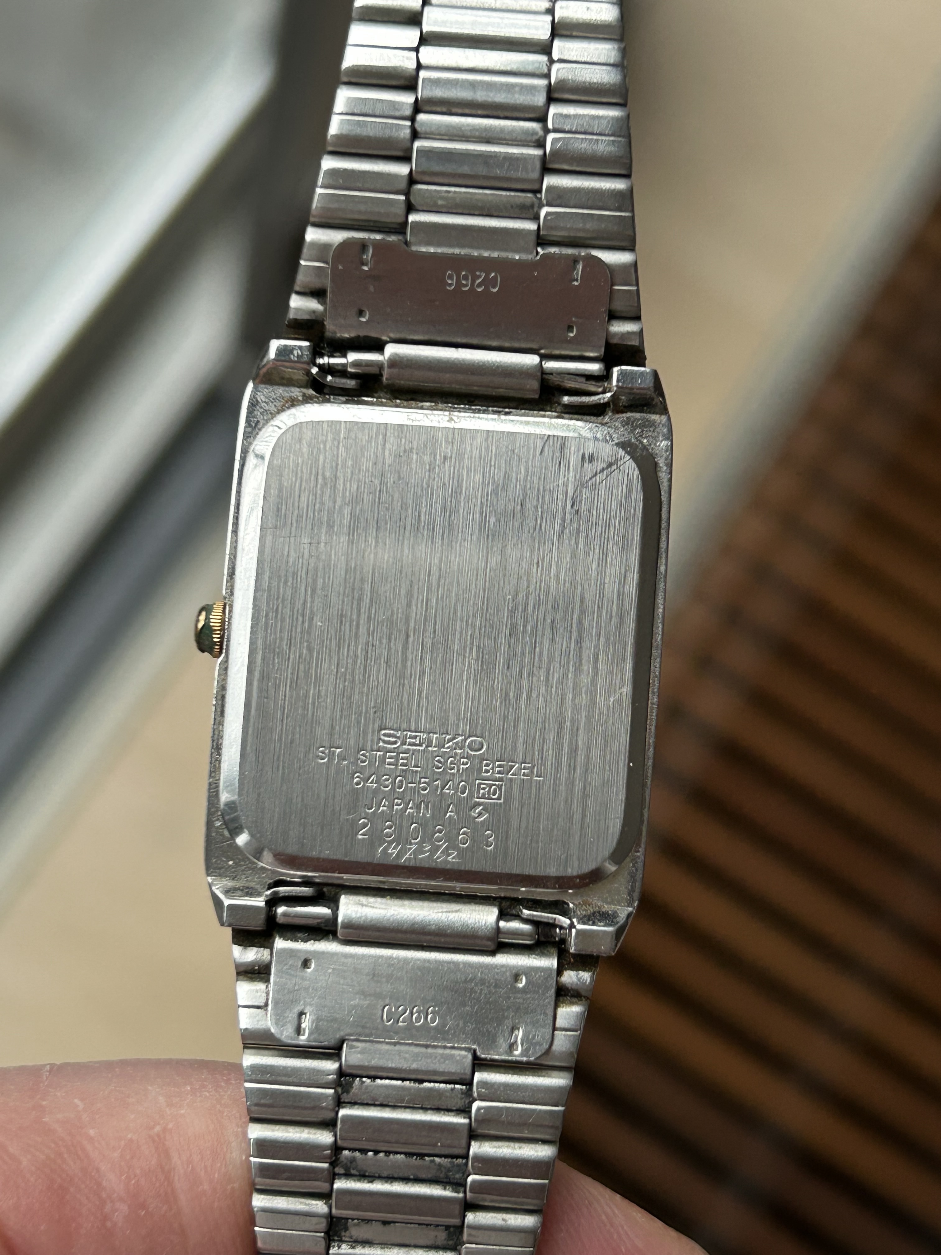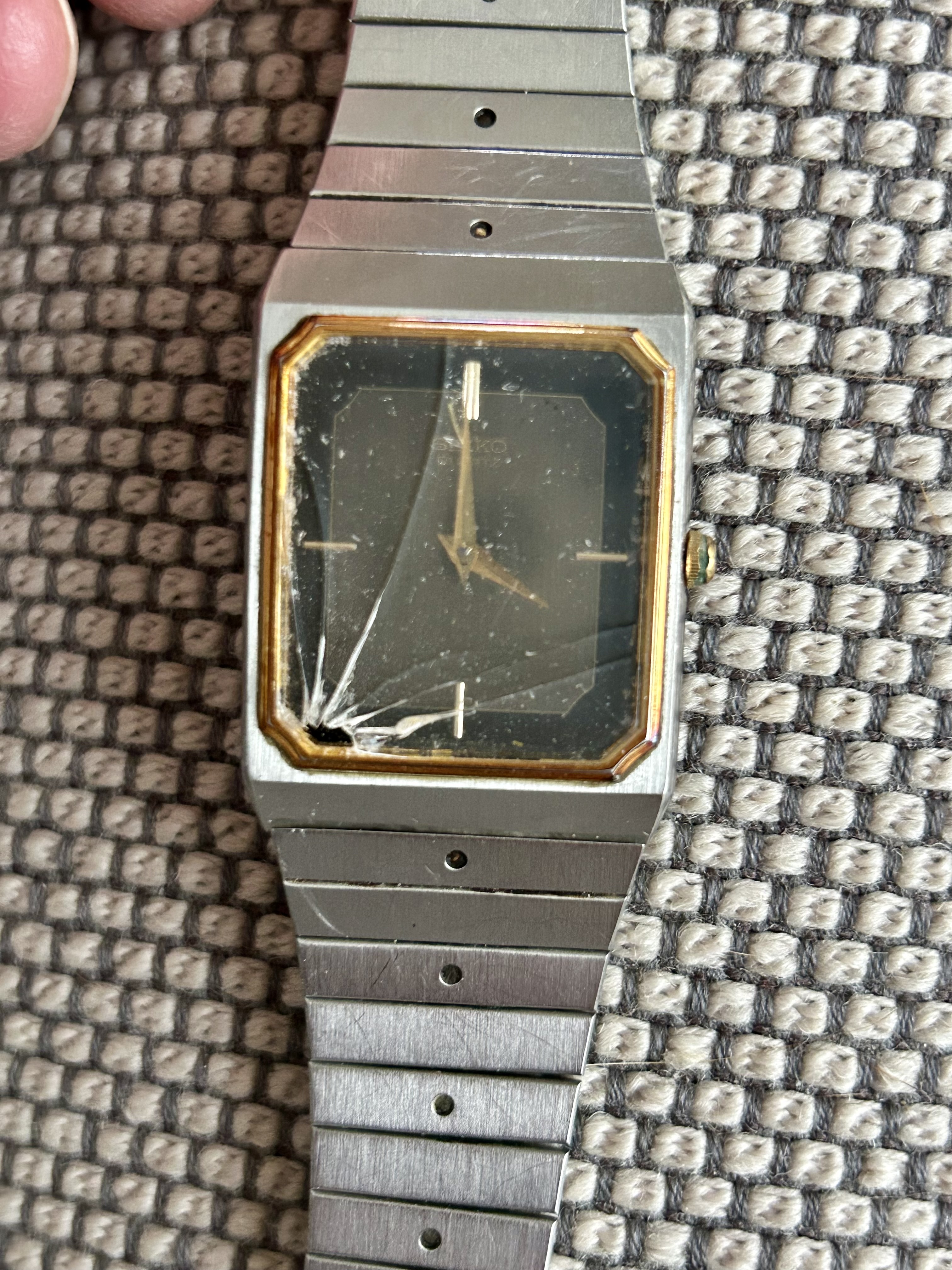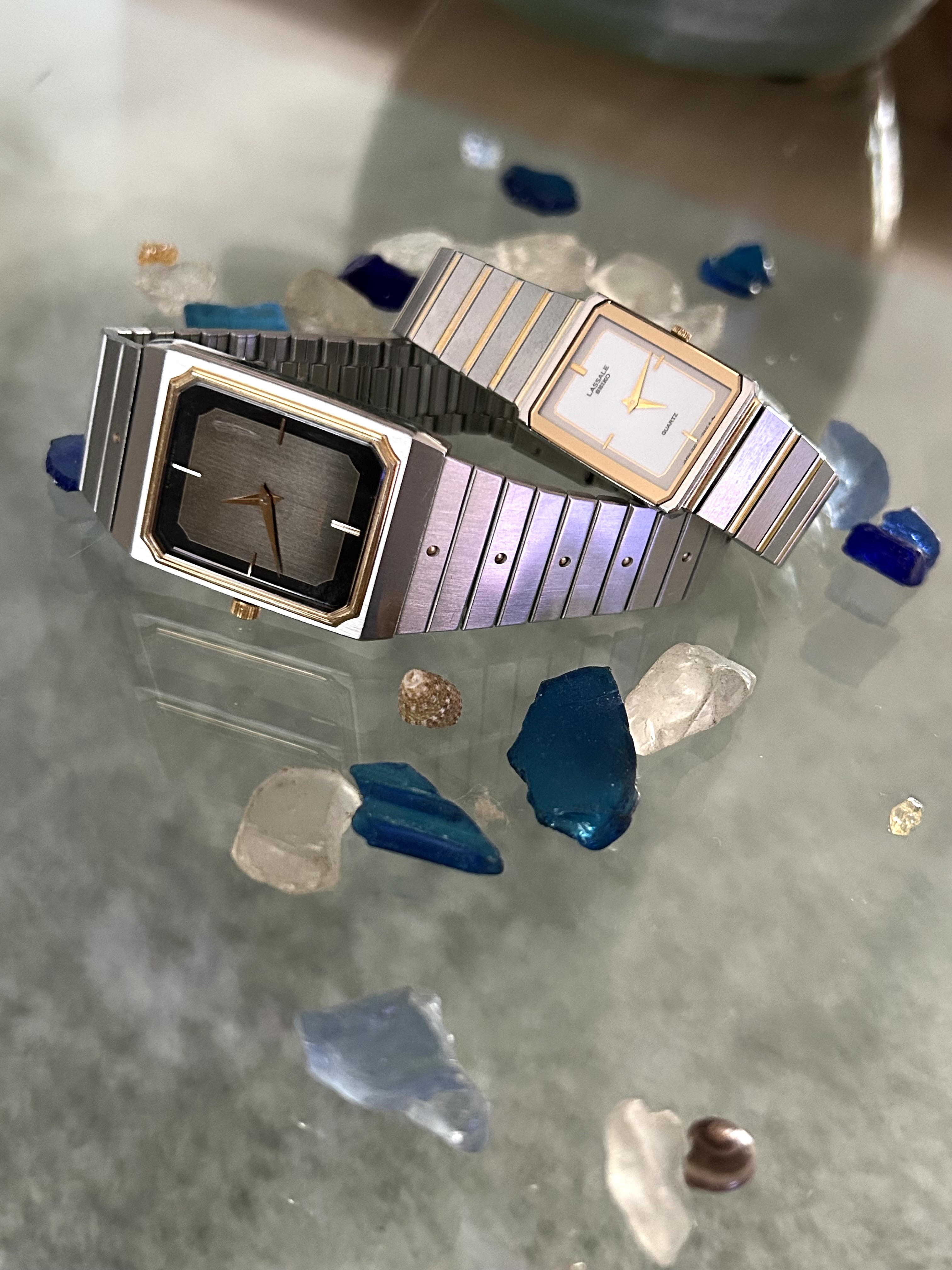 Fast forward 37 jaar. Twee weken geleden hoorde ik het wat rammelen in een lang vergeten doos en inderdaad. de LaSalle in slechte conditie. Glas kapot, kroon groen uitgeslagen, band zag er niet uit. @Horloge24 to the rescue. Glas en e-blok waren niet meer verkrijgbaar bij Seiko. Vond gelukkig bij SpareParts-Watches het glas en Andre kon nog aan de bodempakking en een alternatieve kroon komen.