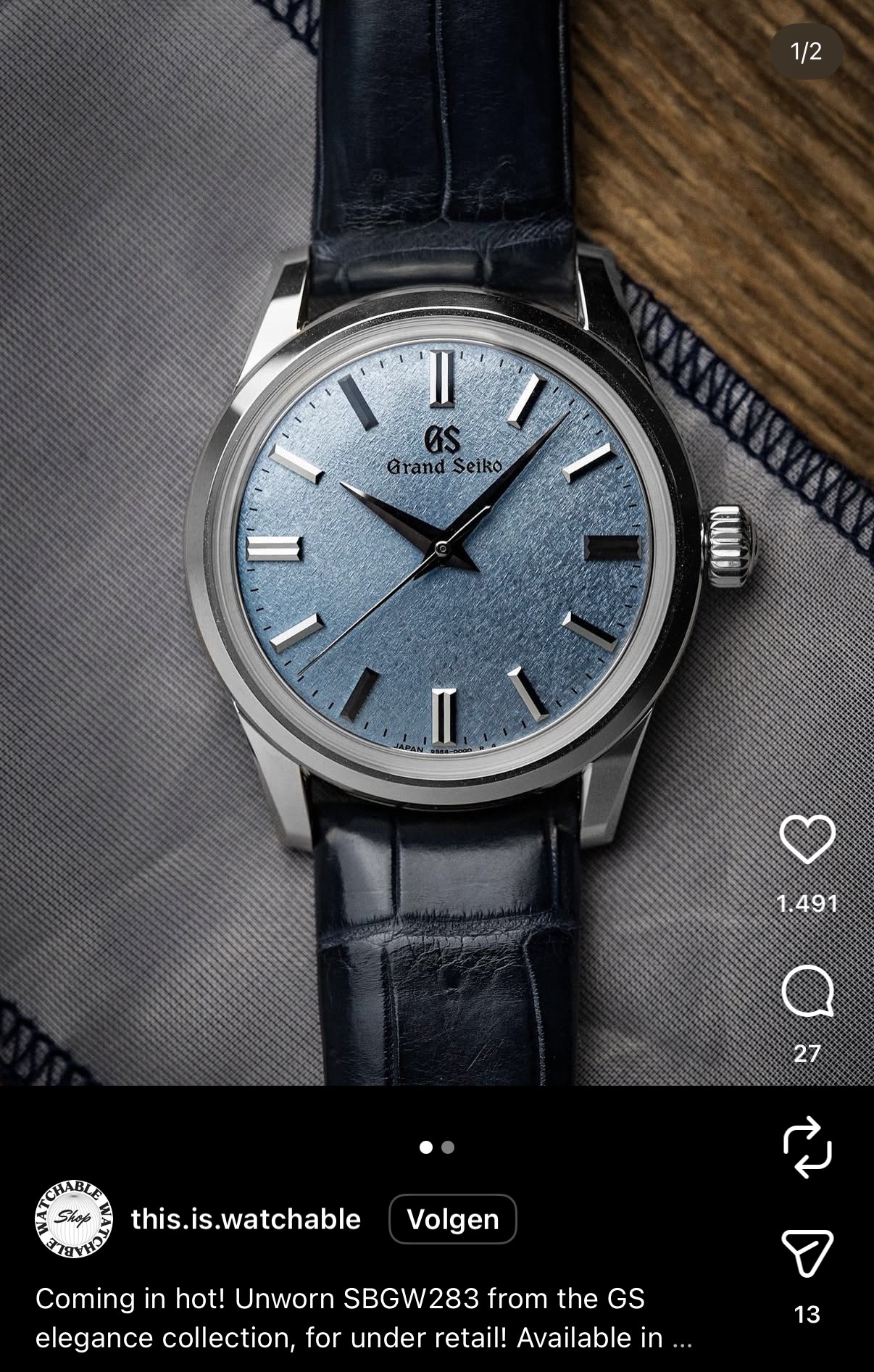 Ik ben op zoek naar die hele mooie blauwe handwinder op leren band van Grand Seiko, referentie “SBGW283”.