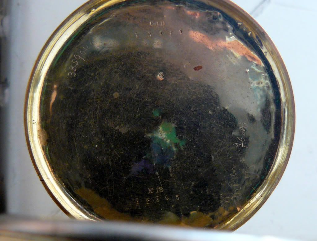 Ik ben benieuwd of iemand hier wat meer weet. Het lijkt er op dat het horloge uit de 19e eeuw komt. Op het dekseltje staan wat inscripties en stempels. ‘CAD 75111’, en ‘K18 25240’ zijn netjes gestempeld. (Dat laatste lijkt me 18 karaat.) Verder staan er nog één of twee merkjes in het midden van het dekseltje. Een wat lijkt op een keurmerkje en één ‘g’ of ‘9’ of ‘6’ (9 danwel 6 staat ook op het bijbehorende opwindsleuteltje). Verder staat er van alles in geëtst / gegraveerd in het deksel waaronder iets dat lijkt op 1846 / 1894 (rechtsonder), 76 olie en nog wat minder goed leesbare zaken. Ik ben benieuwd of jullie hier wat van kunnen maken, alle informatie is welkom!