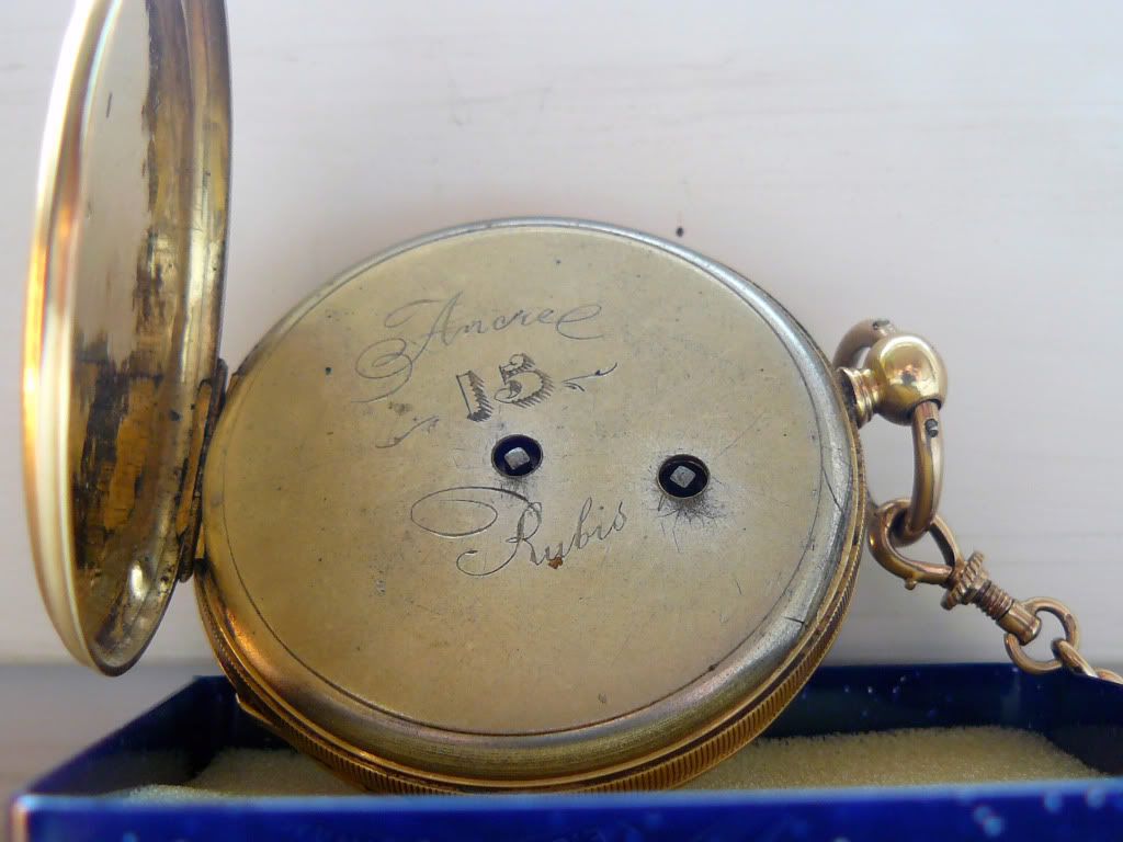 Ik heb helaas geen antwoord op je vragen, maar wil je complimenteren met dit horloge; de minimale rand rond de wijzerplaat, de prachtige fijn vormgegeven zwarte wijzers, de grote decentrale minutenweergave op de eenvoudige helder witte plaat met zeer strakke romeinse cijfers maken dit een van de mooiste zakhorloges die ik hier voorbij heb zien komen!