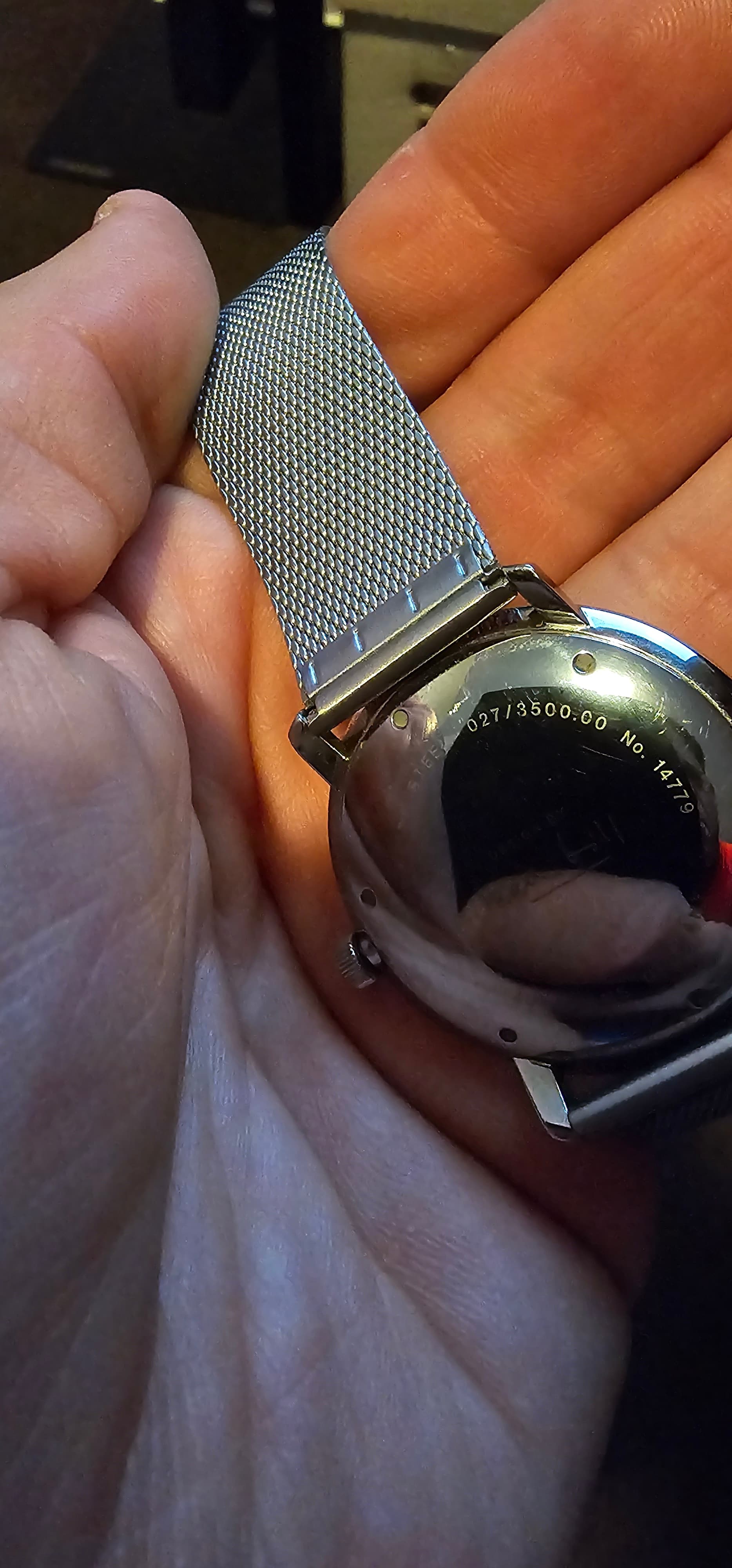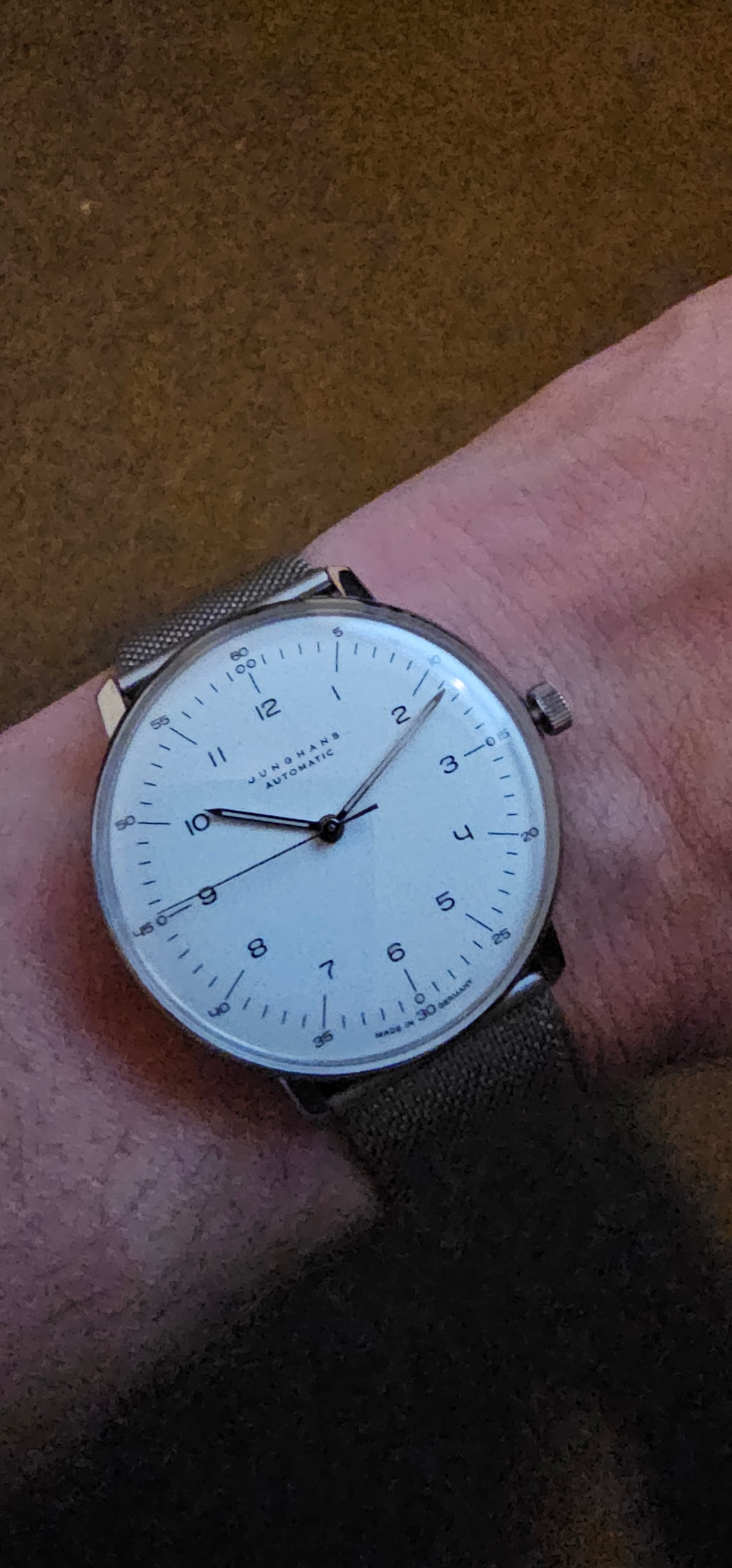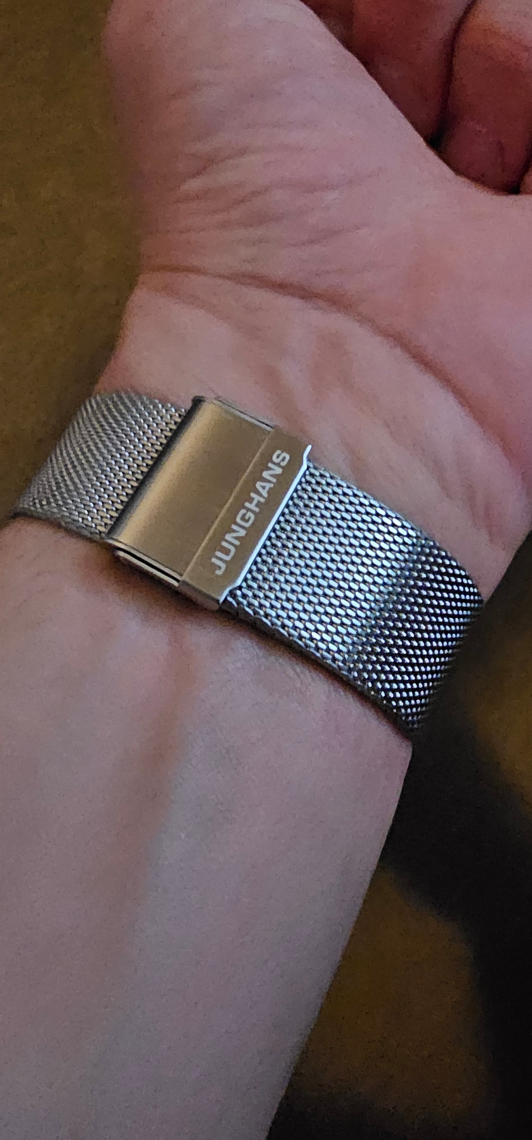 Ik heb er precies een zoals je zoekt. Prachtig horloge maar ik draag hem te zelden. Op zwart lederen band maar heb er een originele Junghans milanese band bijbesteld, zie foto’s.