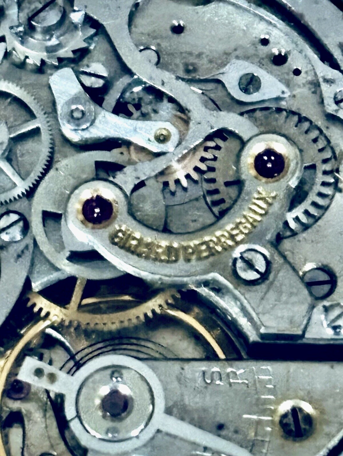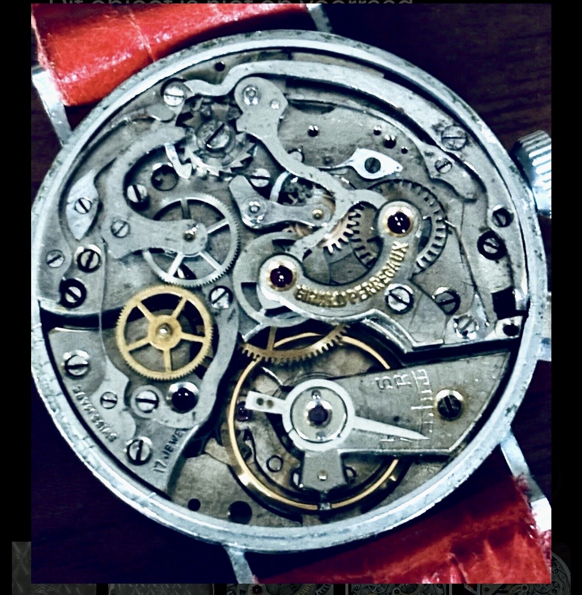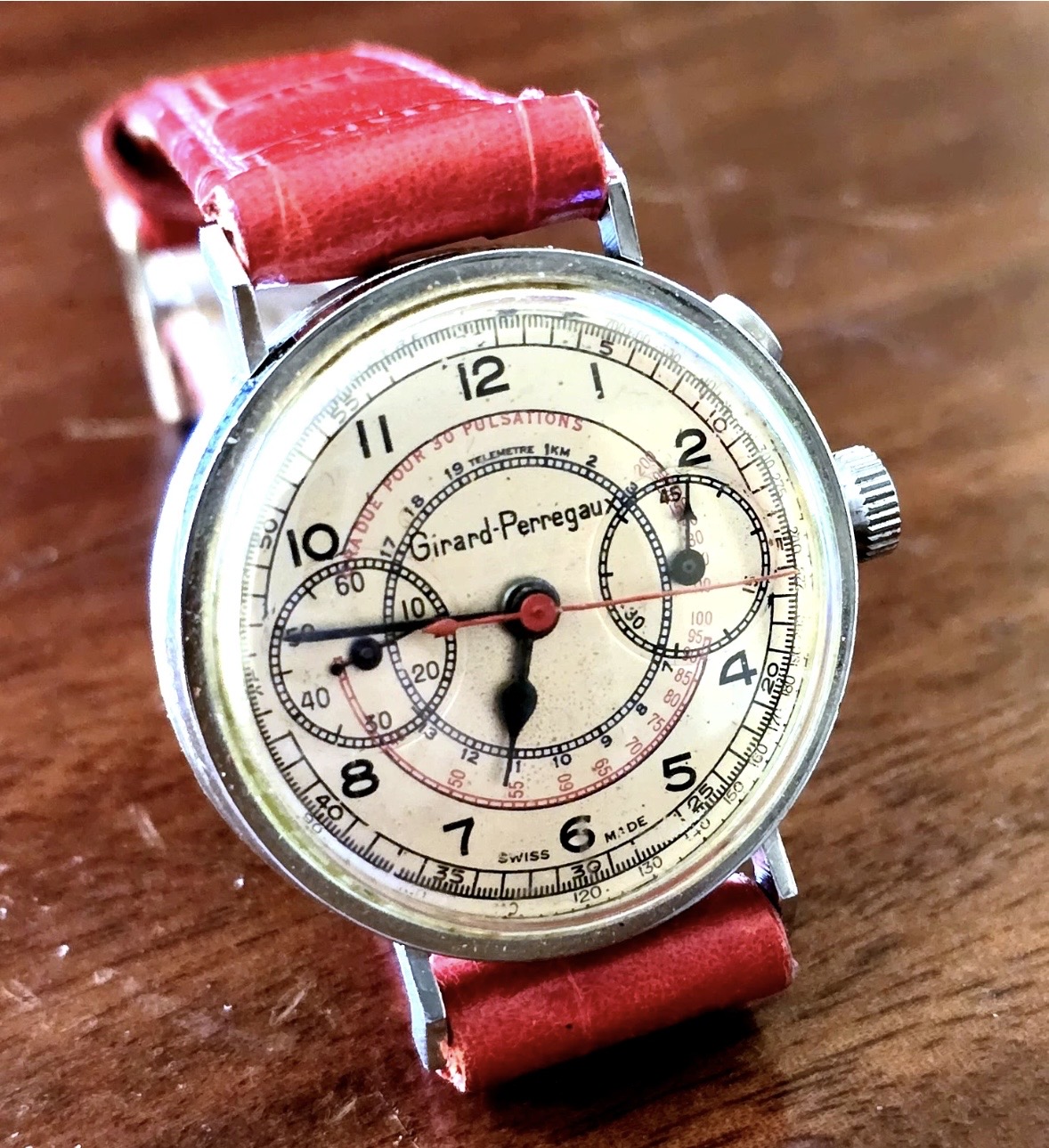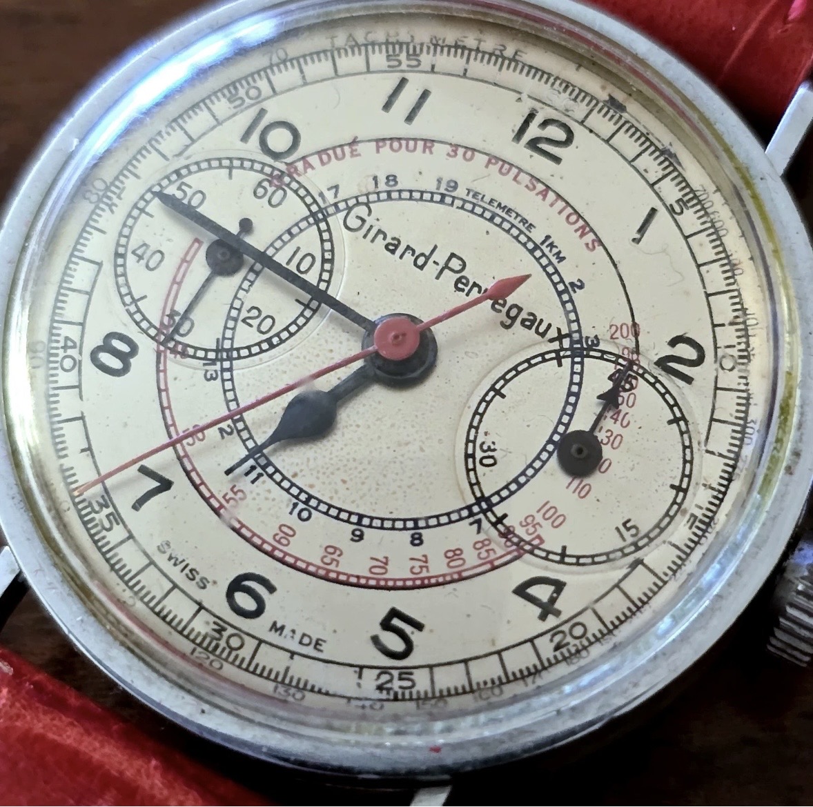 Jaren ’40 Girard-Perregaux monopusher chronograaf, 37,6 mm, Valjoux 22. Ongepolijste stalen kast, originele wijzerplaat met pulsometer (“gradué pour 30 pulsations”) en telemeter schaal. Alles werkend. Benieuwd naar jullie inhoudelijke mening.
