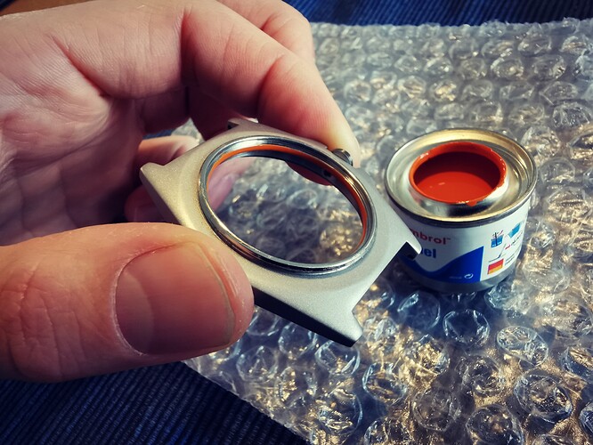 Bij een hoop duikhorloges zie je net boven de dial een chapterring, vaak staan hier de minutenindices op of hij is van gebrusht staal. Bij de Amphibia is dit echter een dun gepolijst randje in de kast dat nauwelijks opvalt. Ik zag het eigenlijk pas toen het glas eruit kwam. Het leek me leuk dit een passend kleurtje te geven zodat het wat meer in oog springt. Een potje enamel van de modelbouwwinkel bracht uitkomst: