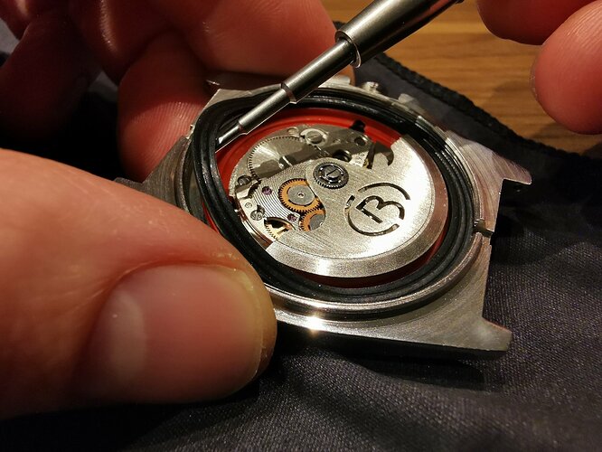 Vervolgens is het een kwestie van de afdichtring verwijderen en dan wip je het uurwerk met de rode pasring en al zo uit de kast.
