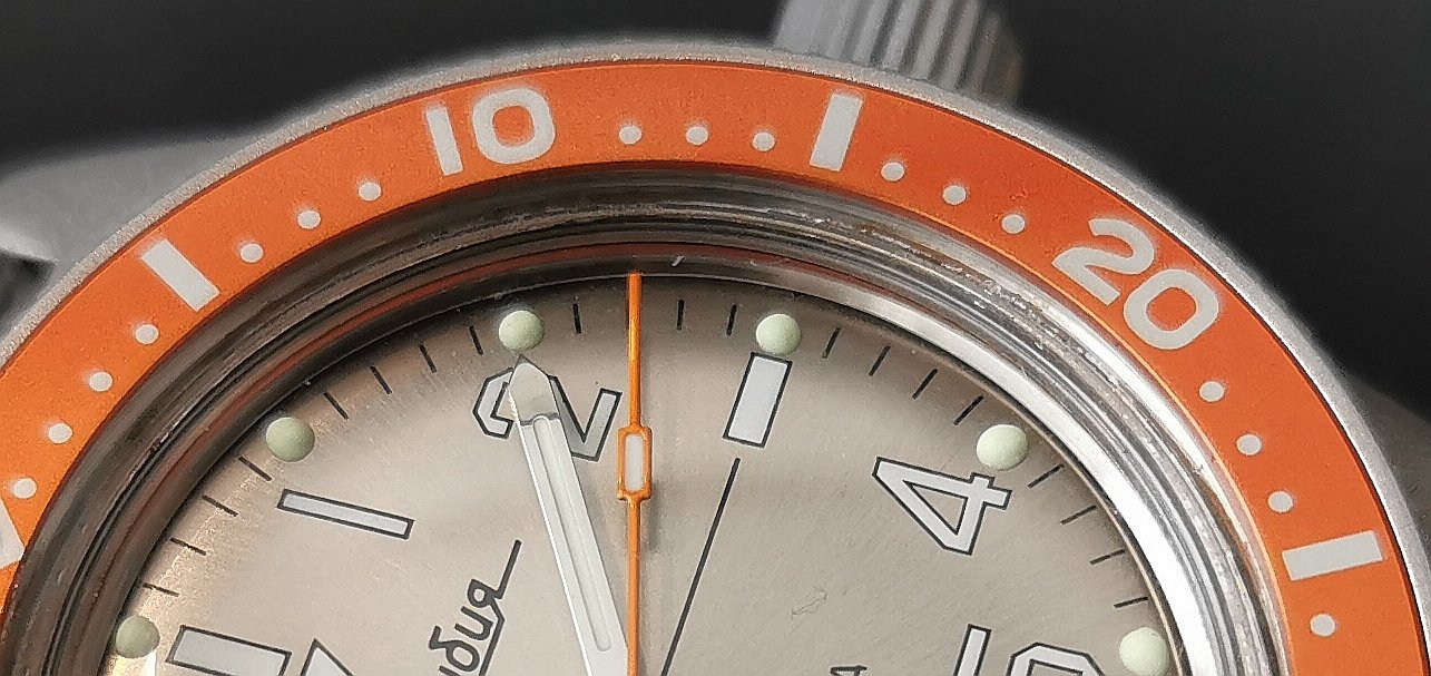 De bezel zit met een simpel stukje gebogen staaldraad om de kast geklemt. Simpel en doeltreffend, alleen kan de bezel hierdoor zowel linksom als rechtsom draaien. Ik geef er niet om en vind het wel iets hebben. Het hoort een beetje bij Vostok. Toch begrijp ik niet dat als je een duiker maakt die een waterdichtheid van 200mtr heeft je dan niet iets meer moeite steekt in een goed functionerende bezel.