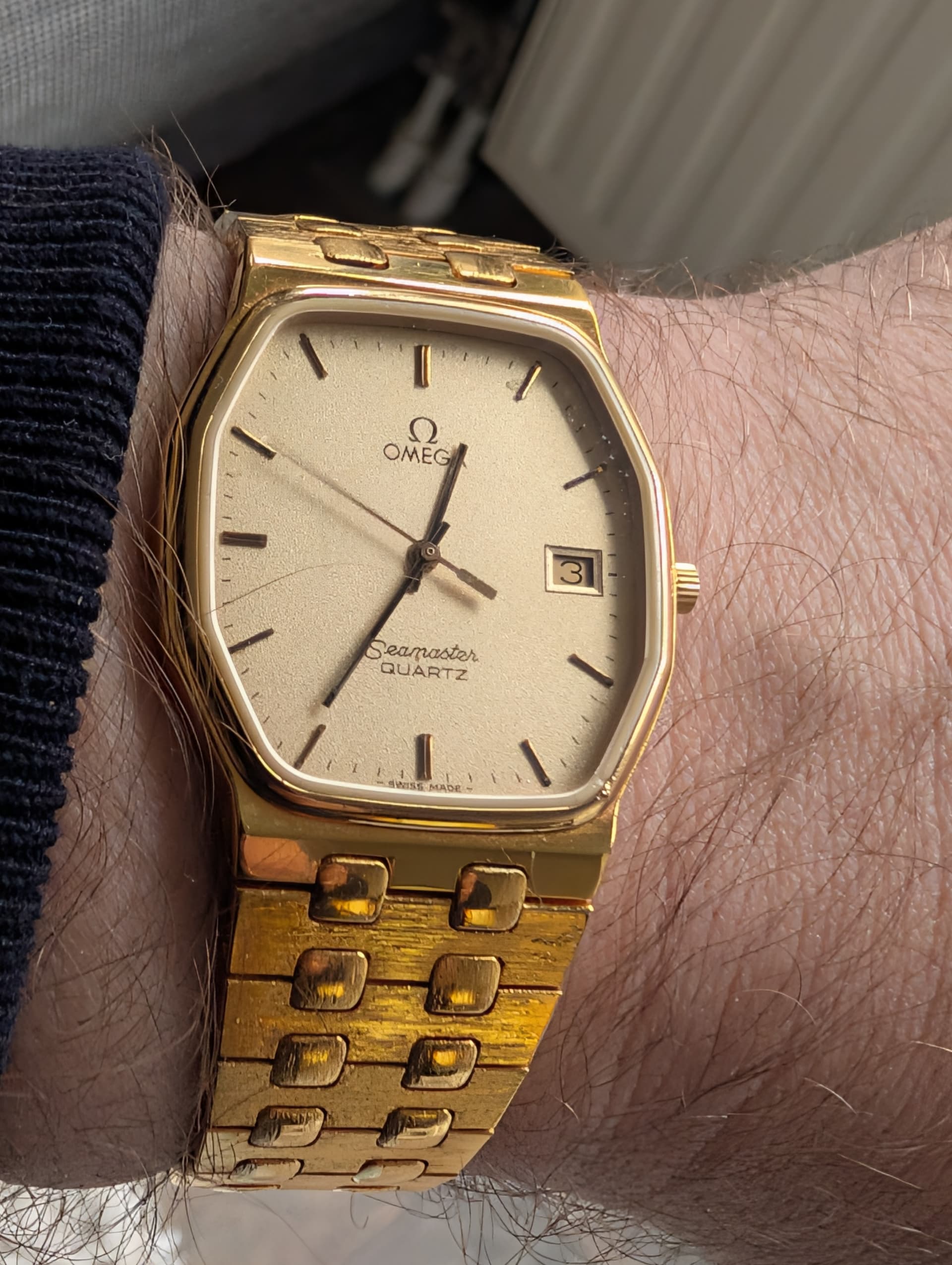Ik heb al eens een topic over dit horloge gehad vanwege mijn haat liefde verhouding ermee. Ik heb het al heel lang in mijn collectie maar ik kon mijn draai er niet mee vinden. Ik heb het horloge jaren geleden gekocht in een lotje, een bijvangst zegmaar. Zelf vind ik goud normaal mooi als het subtiel is maar dat is met dit horloge niet het geval. Ik heb er verschillende leren banden op geprobeerd om het goud subtiel te houden maar een bracelet vind ik gewoonweg het fijnste dragen. Een goud (kleur) bracelet is natuurlijk helemaal niet subtiel meer en werd mij hier op het forum ook sterk afgeraden. Raad eens wat, uiteindelijk heb ik de stoute schoenen aangetrokken en (welliswaar bij oom ali) en een goudkleur bracelet besteld en eindelijk vind ik het horloge dat hebben wat het hoort te hebben voor mij. Niet subtiel en de kleur verschilt iets (dit lijkt op de foto erger trouwens als wanneer je het live ziet) maar eindelijk heb ik er mijn draai mee gevonden en ligt het niet meer weg te stoffen. Klassiek, vintage, goud en best fout maar toch de beste combi voor dit horloge (vind ik).