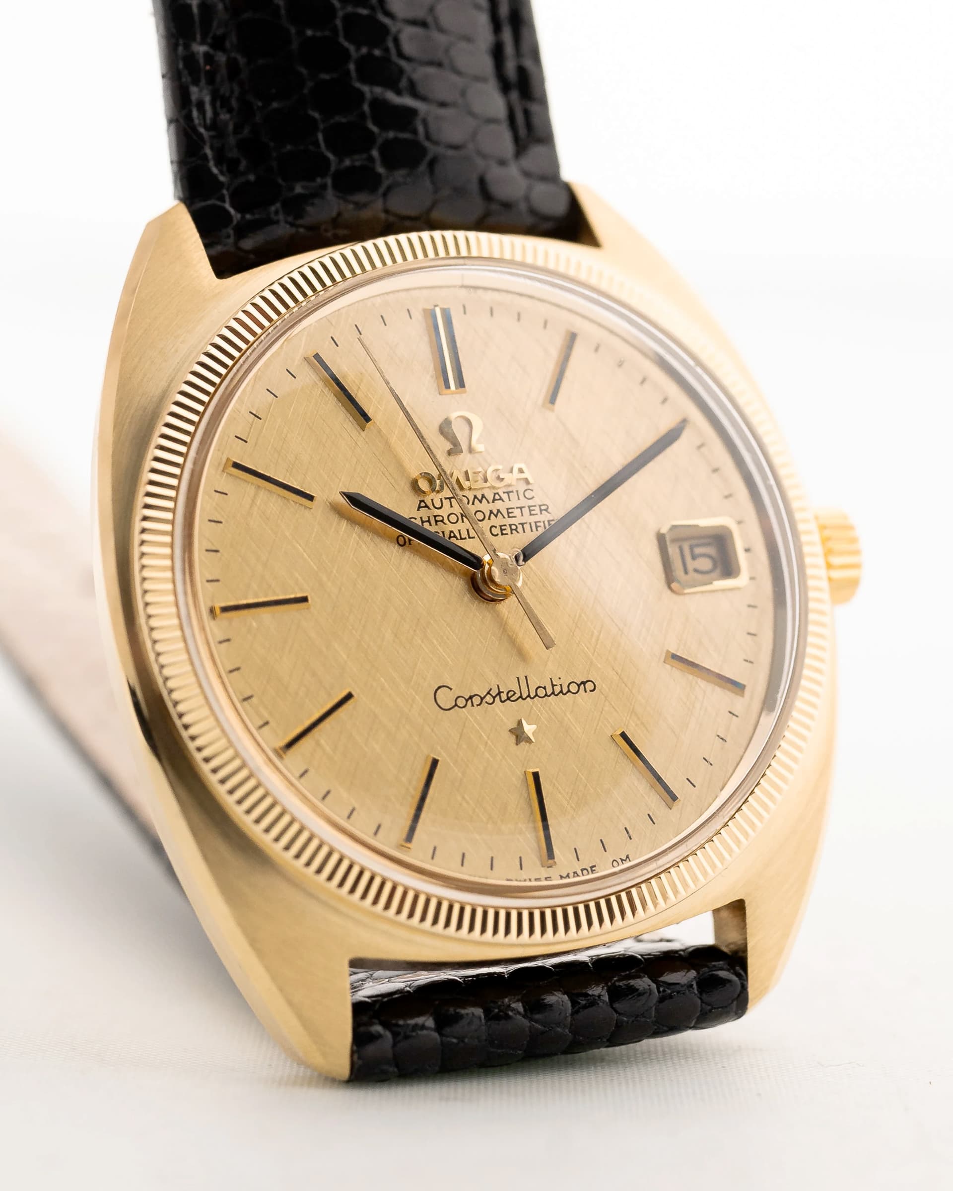 Sportief en dressy tegelijkertijd. Dat schreeuwt eigenlijk om een vintage gouden C-shape constellation met linen dial.