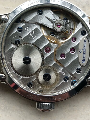 Lijkt er op dat het kroonrad zich een weg in de veertonkloof aan het graven is. Dit gebeurt dan elke keer als het horloge opgewonden wordt. Ik zou zeker Meistersinger contacteren, want er zullen echt delen vervangen moeten worden.