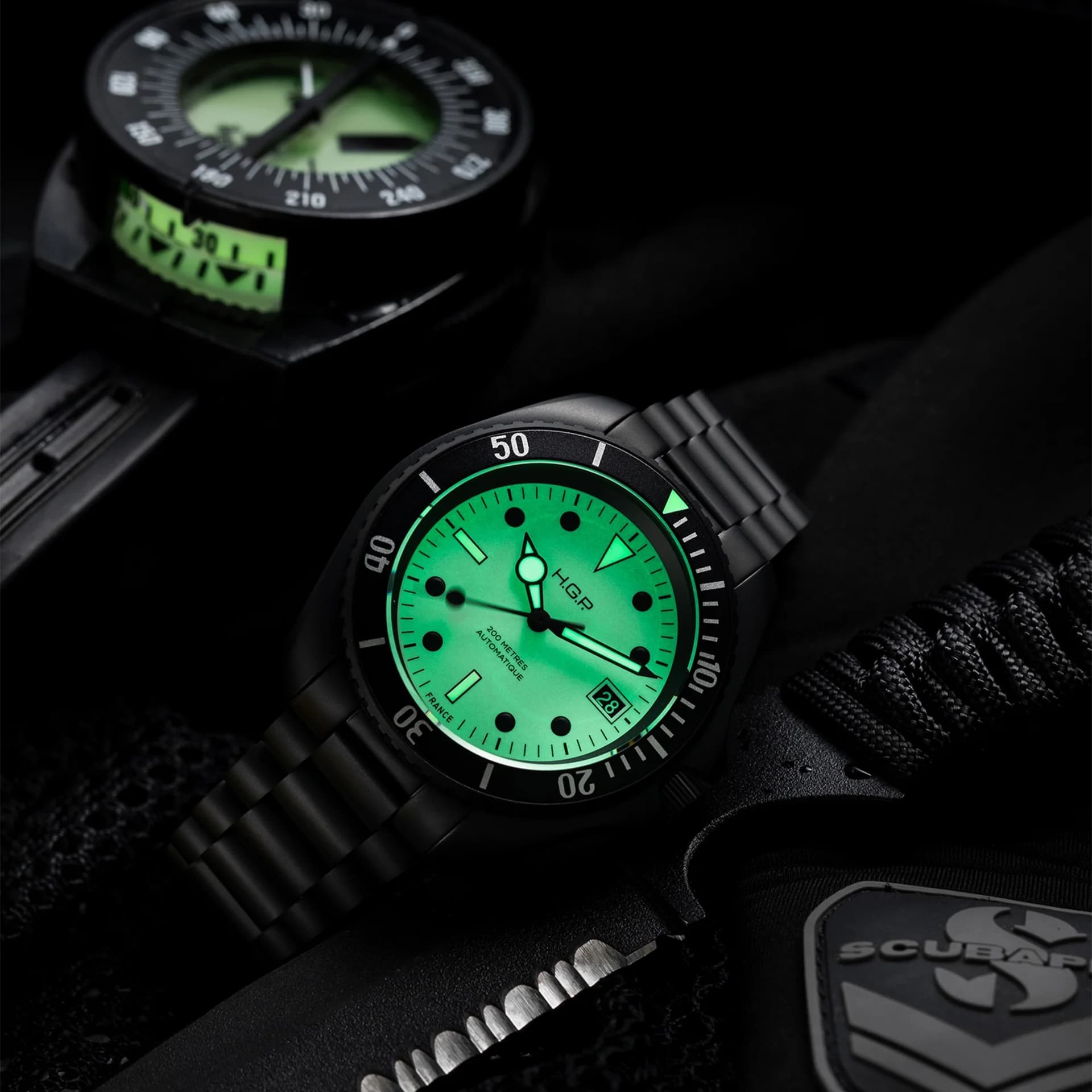 Maar daarnaast heeft deze de ultieme 007-vibe, en nieuw, voor minder dan de helft van de prijs; als je al een (beetje nette) originele kunt vinden. En toch is de H.G.P. geen echte hommage, laat staan een ripp-off. Want H.G.P. maakte in die tijd ook al deze horloges.