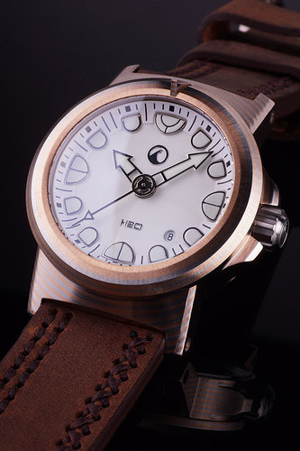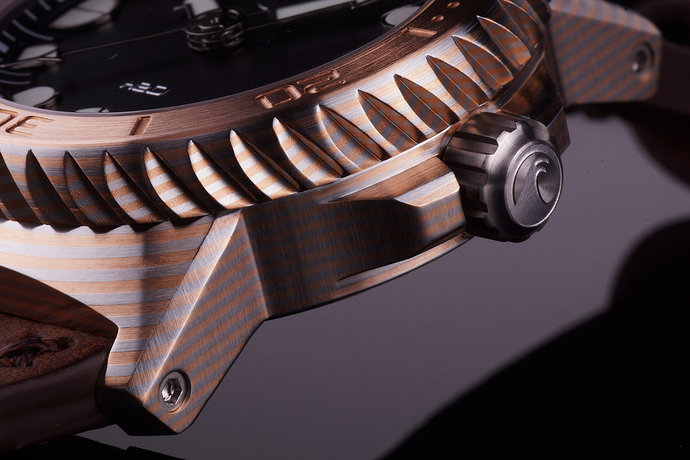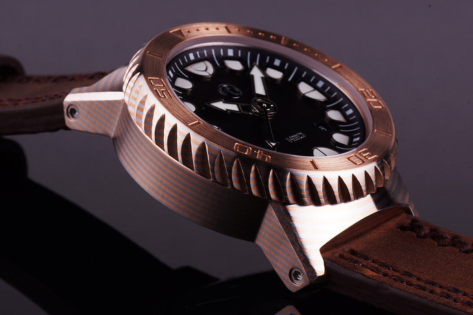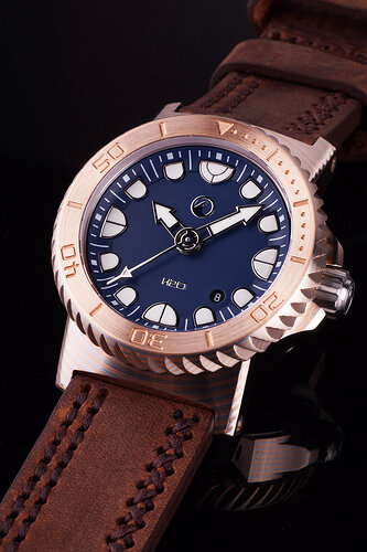 Prachtige kastmateriaal, maar de klok zelf is wat lomp. En dan 6000 meter WD met een lederen bandje… Dat kan dan maar beter vissen-leer zijn.