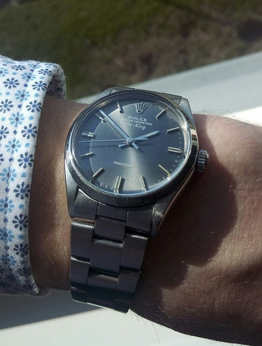 Zo’n Air King vind ik eigenlijk stiekem de mooiste Rolex. Was mijn inspiratiebron voor de aankoop van een OP in wit. Die bevalt me qua maat toch iets beter. Basic Rolex blijft mooi. Grijze plaat ook prachtig. Kan bij pak en bij t-shirt. Geweldig ding.
